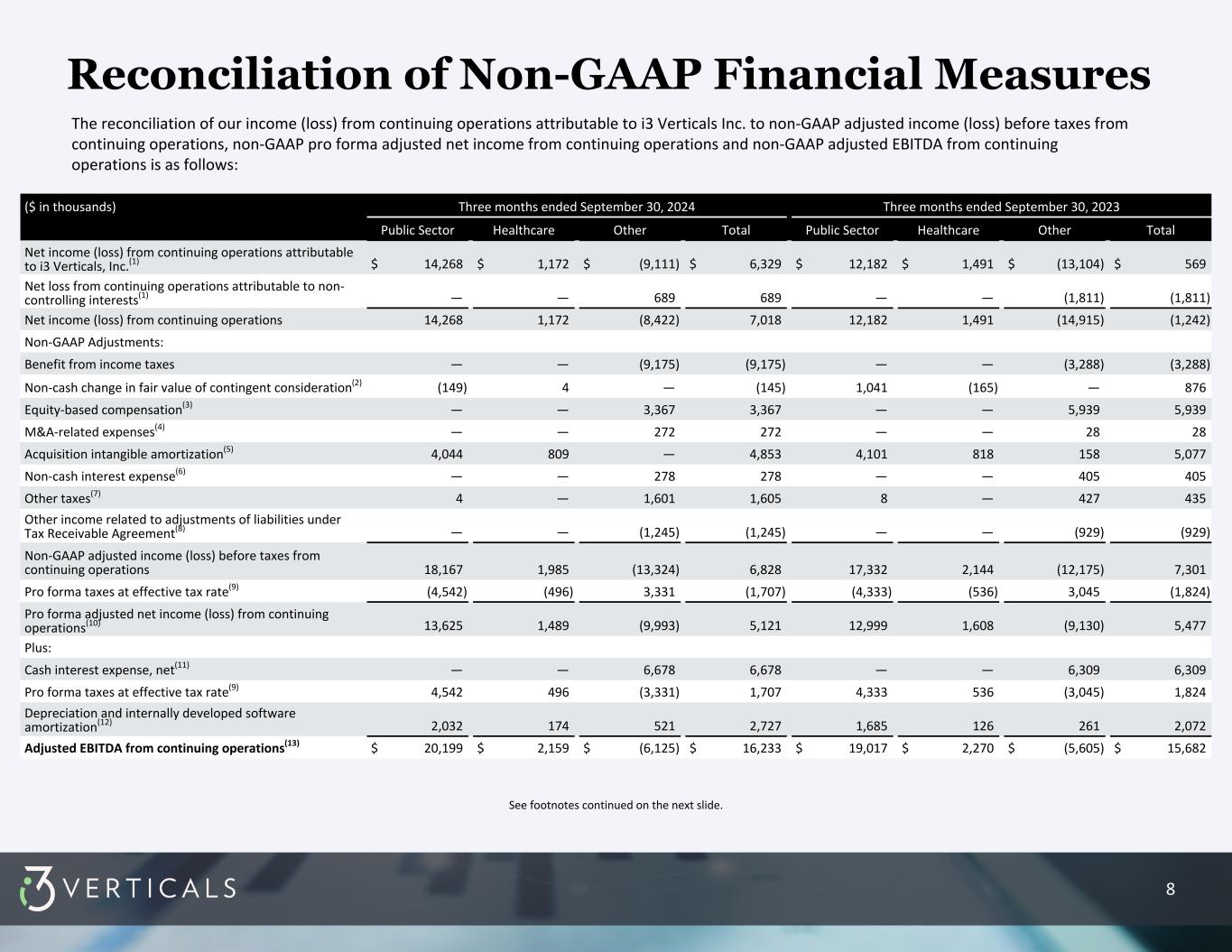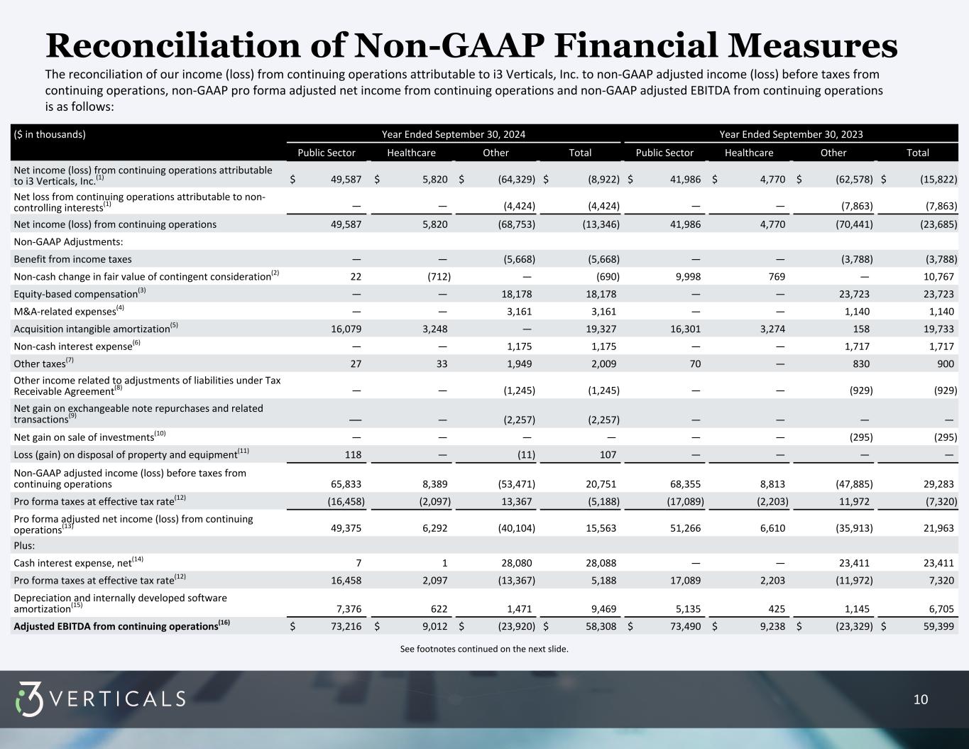 8 ($ in thousands) Three months ended September 30, 2024 Three months ended September 30, 2023 Public Sector Healthcare Other Total Public Sector Healthcare Other Total Net income (loss) from continuing operations attributable to i3 Verticals, Inc.(1) $ 14,268 $ 1,172 $ (9,111) $ 6,329 $ 12,182 $ 1,491 $ (13,104) $ 569 Net loss from continuing operations attributable to non- controlling interests(1) — — 689 689 — — (1,811) (1,811) Net income (loss) from continuing operations 14,268 1,172 (8,422) 7,018 12,182 1,491 (14,915) (1,242) Non-GAAP Adjustments: Benefit from income taxes — — (9,175) (9,175) — — (3,288) (3,288) Non-cash change in fair value of contingent consideration(2) (149) 4 — (145) 1,041 (165) — 876 Equity-based compensation(3) — — 3,367 3,367 — — 5,939 5,939 M&A-related expenses(4) — — 272 272 — — 28 28 Acquisition intangible amortization(5) 4,044 809 — 4,853 4,101 818 158 5,077 Non-cash interest expense(6) — — 278 278 — — 405 405 Other taxes(7) 4 — 1,601 1,605 8 — 427 435 Other income related to adjustments of liabilities under Tax Receivable Agreement(8) — — (1,245) (1,245) — — (929) (929) Non-GAAP adjusted income (loss) before taxes from continuing operations 18,167 1,985 (13,324) 6,828 17,332 2,144 (12,175) 7,301 Pro forma taxes at effective tax rate(9) (4,542) (496) 3,331 (1,707) (4,333) (536) 3,045 (1,824) Pro forma adjusted net income (loss) from continuing operations(10) 13,625 1,489 (9,993) 5,121 12,999 1,608 (9,130) 5,477 Plus: Cash interest expense, net(11) — — 6,678 6,678 — — 6,309 6,309 Pro forma taxes at effective tax rate(9) 4,542 496 (3,331) 1,707 4,333 536 (3,045) 1,824 Depreciation and internally developed software amortization(12) 2,032 174 521 2,727 1,685 126 261 2,072 Adjusted EBITDA from continuing operations(13) $ 20,199 $ 2,159 $ (6,125) $ 16,233 $ 19,017 $ 2,270 $ (5,605) $ 15,682 See footnotes continued on the next slide. The reconciliation of our income (loss) from continuing operations attributable to i3 Verticals Inc. to non-GAAP adjusted income (loss) before taxes from continuing operations, non-GAAP pro forma adjusted net income from continuing operations and non-GAAP adjusted EBITDA from continuing operations is as follows: Reconciliation of Non-GAAP Financial Measures