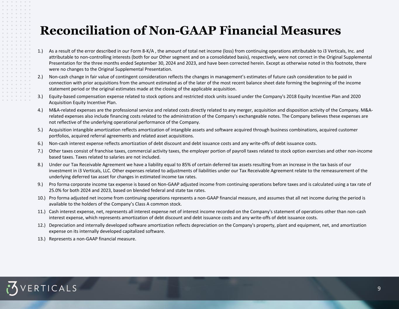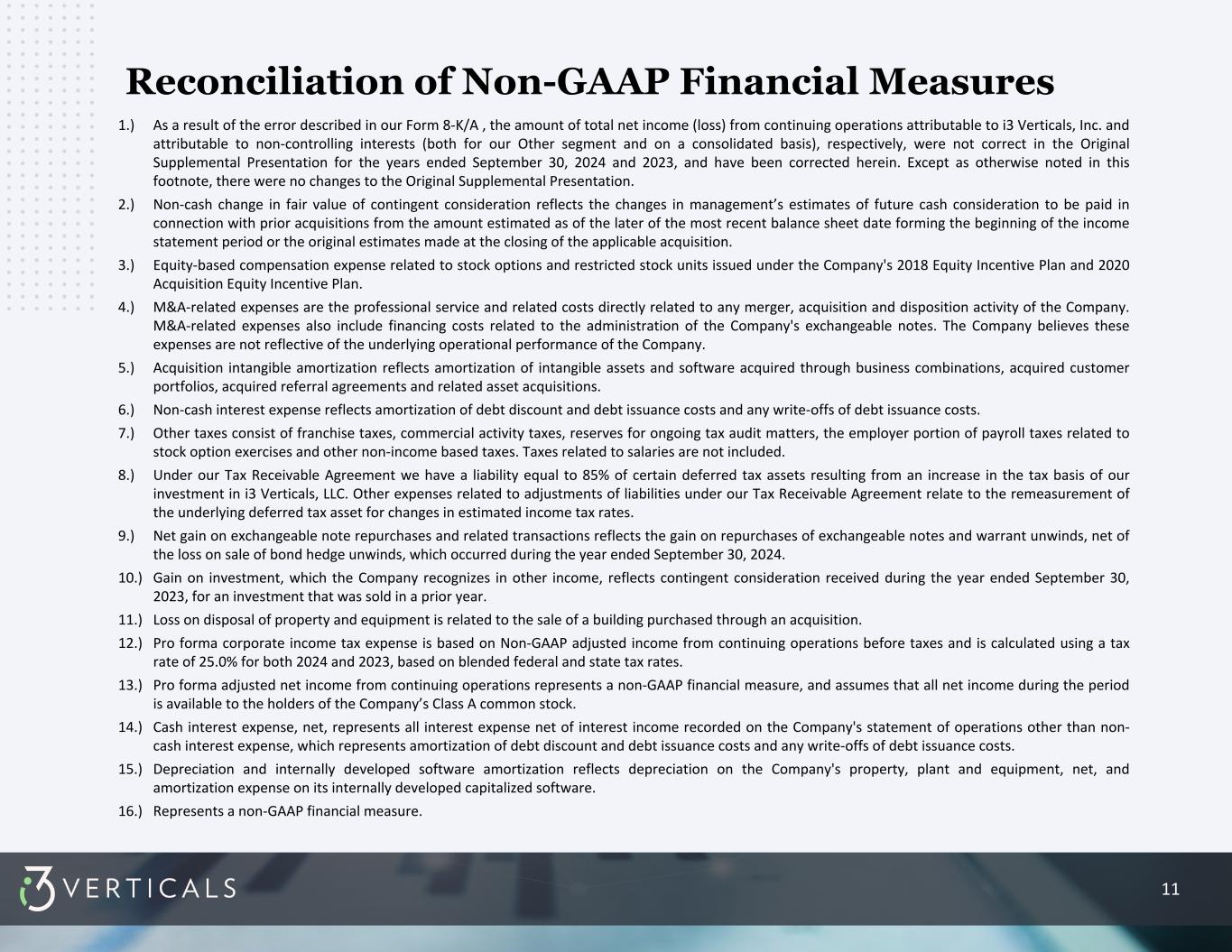 9 Reconciliation of Non-GAAP Financial Measures 1.) As a result of the error described in our Form 8-K/A , the amount of total net income (loss) from continuing operations attributable to i3 Verticals, Inc. and attributable to non-controlling interests (both for our Other segment and on a consolidated basis), respectively, were not correct in the Original Supplemental Presentation for the three months ended September 30, 2024 and 2023, and have been corrected herein. Except as otherwise noted in this footnote, there were no changes to the Original Supplemental Presentation. 2.) Non-cash change in fair value of contingent consideration reflects the changes in management’s estimates of future cash consideration to be paid in connection with prior acquisitions from the amount estimated as of the later of the most recent balance sheet date forming the beginning of the income statement period or the original estimates made at the closing of the applicable acquisition. 3.) Equity-based compensation expense related to stock options and restricted stock units issued under the Company's 2018 Equity Incentive Plan and 2020 Acquisition Equity Incentive Plan. 4.) M&A-related expenses are the professional service and related costs directly related to any merger, acquisition and disposition activity of the Company. M&A- related expenses also include financing costs related to the administration of the Company's exchangeable notes. The Company believes these expenses are not reflective of the underlying operational performance of the Company. 5.) Acquisition intangible amortization reflects amortization of intangible assets and software acquired through business combinations, acquired customer portfolios, acquired referral agreements and related asset acquisitions. 6.) Non-cash interest expense reflects amortization of debt discount and debt issuance costs and any write-offs of debt issuance costs. 7.) Other taxes consist of franchise taxes, commercial activity taxes, the employer portion of payroll taxes related to stock option exercises and other non-income based taxes. Taxes related to salaries are not included. 8.) Under our Tax Receivable Agreement we have a liability equal to 85% of certain deferred tax assets resulting from an increase in the tax basis of our investment in i3 Verticals, LLC. Other expenses related to adjustments of liabilities under our Tax Receivable Agreement relate to the remeasurement of the underlying deferred tax asset for changes in estimated income tax rates. 9.) Pro forma corporate income tax expense is based on Non-GAAP adjusted income from continuing operations before taxes and is calculated using a tax rate of 25.0% for both 2024 and 2023, based on blended federal and state tax rates. 10.) Pro forma adjusted net income from continuing operations represents a non-GAAP financial measure, and assumes that all net income during the period is available to the holders of the Company’s Class A common stock. 11.) Cash interest expense, net, represents all interest expense net of interest income recorded on the Company's statement of operations other than non-cash interest expense, which represents amortization of debt discount and debt issuance costs and any write-offs of debt issuance costs. 12.) Depreciation and internally developed software amortization reflects depreciation on the Company's property, plant and equipment, net, and amortization expense on its internally developed capitalized software. 13.) Represents a non-GAAP financial measure.