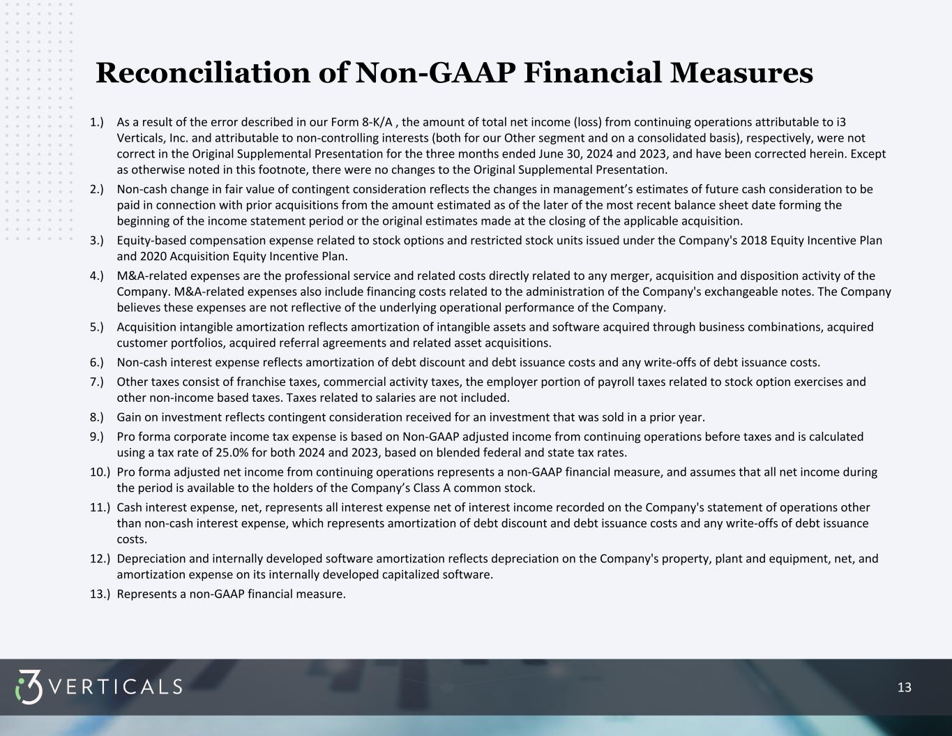 13 Reconciliation of Non-GAAP Financial Measures 1.) As a result of the error described in our Form 8-K/A , the amount of total net income (loss) from continuing operations attributable to i3 Verticals, Inc. and attributable to non-controlling interests (both for our Other segment and on a consolidated basis), respectively, were not correct in the Original Supplemental Presentation for the three months ended June 30, 2024 and 2023, and have been corrected herein. Except as otherwise noted in this footnote, there were no changes to the Original Supplemental Presentation. 2.) Non-cash change in fair value of contingent consideration reflects the changes in management’s estimates of future cash consideration to be paid in connection with prior acquisitions from the amount estimated as of the later of the most recent balance sheet date forming the beginning of the income statement period or the original estimates made at the closing of the applicable acquisition. 3.) Equity-based compensation expense related to stock options and restricted stock units issued under the Company's 2018 Equity Incentive Plan and 2020 Acquisition Equity Incentive Plan. 4.) M&A-related expenses are the professional service and related costs directly related to any merger, acquisition and disposition activity of the Company. M&A-related expenses also include financing costs related to the administration of the Company's exchangeable notes. The Company believes these expenses are not reflective of the underlying operational performance of the Company. 5.) Acquisition intangible amortization reflects amortization of intangible assets and software acquired through business combinations, acquired customer portfolios, acquired referral agreements and related asset acquisitions. 6.) Non-cash interest expense reflects amortization of debt discount and debt issuance costs and any write-offs of debt issuance costs. 7.) Other taxes consist of franchise taxes, commercial activity taxes, the employer portion of payroll taxes related to stock option exercises and other non-income based taxes. Taxes related to salaries are not included. 8.) Gain on investment reflects contingent consideration received for an investment that was sold in a prior year. 9.) Pro forma corporate income tax expense is based on Non-GAAP adjusted income from continuing operations before taxes and is calculated using a tax rate of 25.0% for both 2024 and 2023, based on blended federal and state tax rates. 10.) Pro forma adjusted net income from continuing operations represents a non-GAAP financial measure, and assumes that all net income during the period is available to the holders of the Company’s Class A common stock. 11.) Cash interest expense, net, represents all interest expense net of interest income recorded on the Company's statement of operations other than non-cash interest expense, which represents amortization of debt discount and debt issuance costs and any write-offs of debt issuance costs. 12.) Depreciation and internally developed software amortization reflects depreciation on the Company's property, plant and equipment, net, and amortization expense on its internally developed capitalized software. 13.) Represents a non-GAAP financial measure.