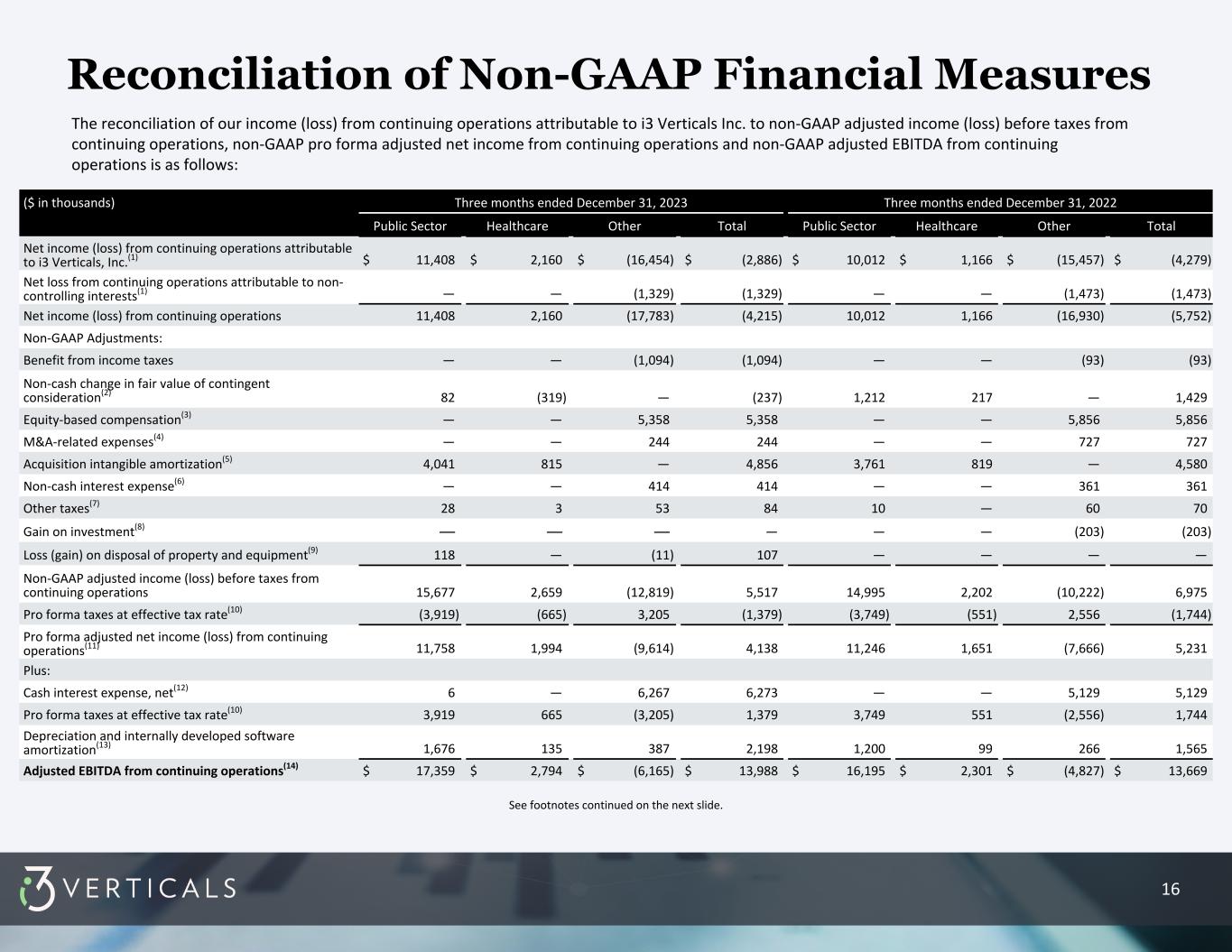 14 ($ in thousands) Three months ended March 31, 2024 Three months ended March 31, 2023 Public Sector Healthcare Other Total Public Sector Healthcare Other Total Net income (loss) from continuing operations attributable to i3 Verticals, Inc.(1) $ 13,318 $ 1,160 $ (16,186) $ (1,708) $ 12,855 $ 912 $ (17,837) $ (4,070) Net loss from continuing operations attributable to non- controlling interests(1) — — (594) (594) — — (1,701) (1,701) Net income (loss) from continuing operations 13,318 1,160 (16,780) (2,302) 12,855 912 (19,538) (5,771) Non-GAAP Adjustments: Benefit from income taxes — — (669) (669) — — (115) (115) Non-cash change in fair value of contingent consideration(2) 88 (378) — (290) 2,400 (121) — 2,279 Equity-based compensation(3) — — 5,022 5,022 — — 5,804 5,804 M&A-related expenses(4) — — 714 714 — — 357 357 Acquisition intangible amortization(5) 4,015 815 — 4,830 4,324 818 — 5,142 Non-cash interest expense(6) — — 262 262 — — 368 368 Other taxes(7) (1) 28 62 89 48 — 274 322 Net gain on exchangeable note repurchases and related transactions(8) — — (2,257) (2,257) — — — — Non-GAAP adjusted income (loss) before taxes from continuing operations 17,420 1,625 (13,646) 5,399 19,627 1,609 (12,850) 8,386 Pro forma taxes at effective tax rate(9) (4,355) (406) 3,410 (1,351) (4,907) (402) 3,213 (2,096) Pro forma adjusted net income (loss) from continuing operations(10) 13,065 1,219 (10,236) 4,048 14,720 1,207 (9,637) 6,290 Plus: Cash interest expense, net(11) — — 7,452 7,452 — — 5,831 5,831 Pro forma taxes at effective tax rate(9) 4,355 406 (3,410) 1,351 4,907 402 (3,213) 2,096 Depreciation and internally developed software amortization(12) 1,813 150 400 2,363 933 90 312 1,335 Adjusted EBITDA from continuing operations(13) $ 19,233 $ 1,775 $ (5,794) $ 15,214 $ 20,560 $ 1,699 $ (6,707) $ 15,552 See footnotes continued on the next slide. The reconciliation of our income (loss) from continuing operations attributable to i3 Verticals Inc. to non-GAAP adjusted income (loss) before taxes from continuing operations, non-GAAP pro forma adjusted net income from continuing operations and non-GAAP adjusted EBITDA from continuing operations is as follows: Reconciliation of Non-GAAP Financial Measures
