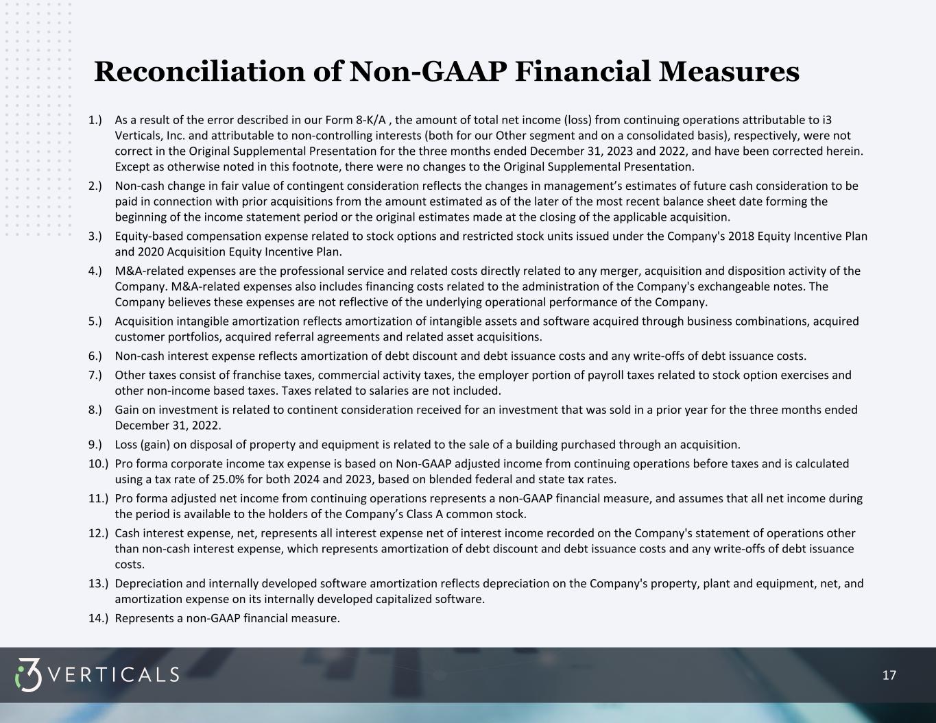 17 Reconciliation of Non-GAAP Financial Measures 1.) As a result of the error described in our Form 8-K/A , the amount of total net income (loss) from continuing operations attributable to i3 Verticals, Inc. and attributable to non-controlling interests (both for our Other segment and on a consolidated basis), respectively, were not correct in the Original Supplemental Presentation for the three months ended December 31, 2023 and 2022, and have been corrected herein. Except as otherwise noted in this footnote, there were no changes to the Original Supplemental Presentation. 2.) Non-cash change in fair value of contingent consideration reflects the changes in management’s estimates of future cash consideration to be paid in connection with prior acquisitions from the amount estimated as of the later of the most recent balance sheet date forming the beginning of the income statement period or the original estimates made at the closing of the applicable acquisition. 3.) Equity-based compensation expense related to stock options and restricted stock units issued under the Company's 2018 Equity Incentive Plan and 2020 Acquisition Equity Incentive Plan. 4.) M&A-related expenses are the professional service and related costs directly related to any merger, acquisition and disposition activity of the Company. M&A-related expenses also includes financing costs related to the administration of the Company's exchangeable notes. The Company believes these expenses are not reflective of the underlying operational performance of the Company. 5.) Acquisition intangible amortization reflects amortization of intangible assets and software acquired through business combinations, acquired customer portfolios, acquired referral agreements and related asset acquisitions. 6.) Non-cash interest expense reflects amortization of debt discount and debt issuance costs and any write-offs of debt issuance costs. 7.) Other taxes consist of franchise taxes, commercial activity taxes, the employer portion of payroll taxes related to stock option exercises and other non-income based taxes. Taxes related to salaries are not included. 8.) Gain on investment is related to continent consideration received for an investment that was sold in a prior year for the three months ended December 31, 2022. 9.) Loss (gain) on disposal of property and equipment is related to the sale of a building purchased through an acquisition. 10.) Pro forma corporate income tax expense is based on Non-GAAP adjusted income from continuing operations before taxes and is calculated using a tax rate of 25.0% for both 2024 and 2023, based on blended federal and state tax rates. 11.) Pro forma adjusted net income from continuing operations represents a non-GAAP financial measure, and assumes that all net income during the period is available to the holders of the Company’s Class A common stock. 12.) Cash interest expense, net, represents all interest expense net of interest income recorded on the Company's statement of operations other than non-cash interest expense, which represents amortization of debt discount and debt issuance costs and any write-offs of debt issuance costs. 13.) Depreciation and internally developed software amortization reflects depreciation on the Company's property, plant and equipment, net, and amortization expense on its internally developed capitalized software. 14.) Represents a non-GAAP financial measure.