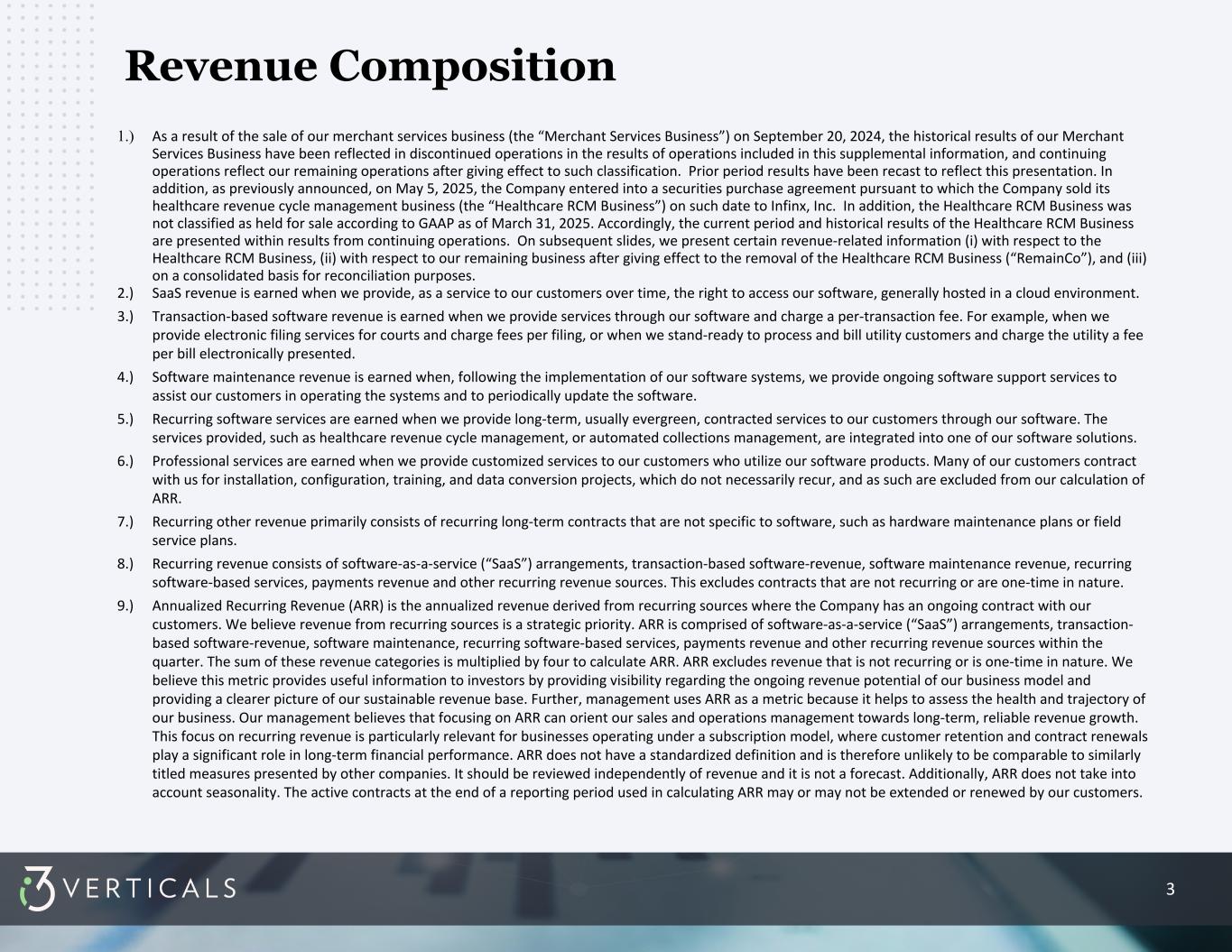 2 ($ in thousands) Quarter Ended March 31, 2025 December 31, 2024 September 30, 2024 June 30, 2024 March 31, 2024 December 31, 2023 September 30, 2023 June 30, 2023 March 31, 2023 Software and related service revenue SaaS(2) $ 10,585 $ 10,182 $ 9,677 $ 8,834 $ 8,809 $ 8,742 $ 8,977 $ 8,523 $ 8,244 Transaction-based(3) 4,043 3,836 4,121 3,928 3,538 3,651 3,706 3,291 3,174 Maintenance(4) 8,288 8,796 8,783 8,433 8,125 8,207 7,970 8,336 8,039 Recurring software services(5) 11,092 10,343 10,497 10,913 11,263 10,205 10,303 11,127 10,567 Professional services(6) 9,410 9,841 10,062 8,906 9,199 8,881 10,777 10,039 10,634 Software licenses 2,805 2,677 2,498 405 963 417 2,714 2,380 3,193 Total $ 46,223 $ 45,675 $ 45,638 $ 41,419 $ 41,897 $ 40,103 $ 44,447 $ 43,696 $ 43,851 Year-over-year growth 10 % 14 % 3 % (5) % (4) % Payments revenue $ 14,141 $ 13,511 $ 12,225 $ 11,867 $ 13,572 $ 12,677 $ 11,296 $ 10,895 $ 12,903 Year-over-year growth 4 % 7 % 8 % 9 % 5 % Other revenue Recurring(7) $ 1,614 $ 1,646 $ 1,738 $ 1,343 $ 1,405 $ 1,423 $ 1,526 $ 1,445 $ 1,363 Other 1,081 859 1,263 1,408 1,094 851 1,315 1,224 1,050 Total $ 2,695 $ 2,505 $ 3,001 $ 2,751 $ 2,499 $ 2,274 $ 2,841 $ 2,669 $ 2,413 Year-over-year growth 8 % 10 % 6 % 3 % 4 % Total revenue $ 63,059 $ 61,691 $ 60,864 $ 56,037 $ 57,968 $ 55,054 $ 58,584 $ 57,260 $ 59,167 Recurring revenue(8) $ 49,763 $ 48,314 $ 47,040 $ 45,318 $ 46,712 $ 44,905 $ 43,778 $ 43,617 $ 44,290 Annualized Recurring Revenue “ARR”(9) Software and related service revenue $ 136,032 $ 132,628 $ 132,313 $ 128,432 $ 126,940 $ 123,220 $ 123,824 $ 125,108 $ 120,096 Payments revenue 56,564 54,044 48,898 47,468 54,288 50,708 45,184 43,580 51,612 Other revenue 6,456 6,584 6,951 5,372 5,620 5,692 6,104 5,780 5,452 Total ARR $ 199,052 $ 193,256 $ 188,162 $ 181,272 $ 186,848 $ 179,620 $ 175,112 $ 174,468 $ 177,160 Year-over-year growth 7 % 8 % 7 % 4 % 5 % Revenue Composition(1) See footnotes continued on the next slide.