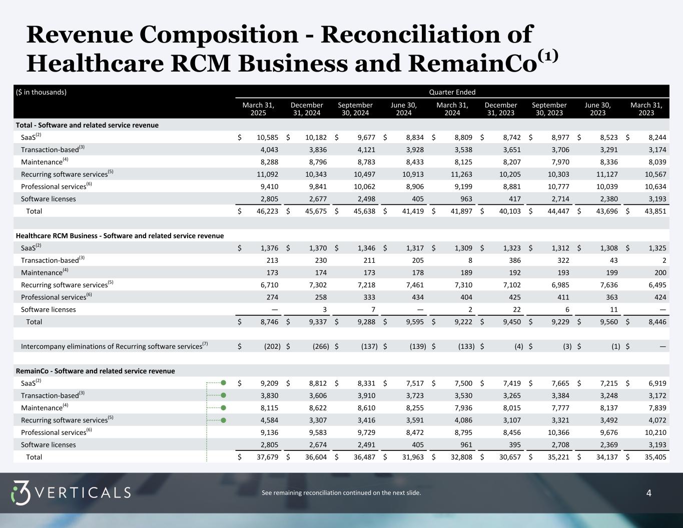 3 1.) As a result of the sale of our merchant services business (the “Merchant Services Business”) on September 20, 2024, the historical results of our Merchant Services Business have been reflected in discontinued operations in the results of operations included in this supplemental information, and continuing operations reflect our remaining operations after giving effect to such classification. Prior period results have been recast to reflect this presentation. In addition, as previously announced, on May 5, 2025, the Company entered into a securities purchase agreement pursuant to which the Company sold its healthcare revenue cycle management business (the “Healthcare RCM Business”) on such date to Infinx, Inc. In addition, the Healthcare RCM Business was not classified as held for sale according to GAAP as of March 31, 2025. Accordingly, the current period and historical results of the Healthcare RCM Business are presented within results from continuing operations. On subsequent slides, we present certain revenue-related information (i) with respect to the Healthcare RCM Business, (ii) with respect to our remaining business after giving effect to the removal of the Healthcare RCM Business (“RemainCo”), and (iii) on a consolidated basis for reconciliation purposes. 2.) SaaS revenue is earned when we provide, as a service to our customers over time, the right to access our software, generally hosted in a cloud environment. 3.) Transaction-based software revenue is earned when we provide services through our software and charge a per-transaction fee. For example, when we provide electronic filing services for courts and charge fees per filing, or when we stand-ready to process and bill utility customers and charge the utility a fee per bill electronically presented. 4.) Software maintenance revenue is earned when, following the implementation of our software systems, we provide ongoing software support services to assist our customers in operating the systems and to periodically update the software. 5.) Recurring software services are earned when we provide long-term, usually evergreen, contracted services to our customers through our software. The services provided, such as healthcare revenue cycle management, or automated collections management, are integrated into one of our software solutions. 6.) Professional services are earned when we provide customized services to our customers who utilize our software products. Many of our customers contract with us for installation, configuration, training, and data conversion projects, which do not necessarily recur, and as such are excluded from our calculation of ARR. 7.) Recurring other revenue primarily consists of recurring long-term contracts that are not specific to software, such as hardware maintenance plans or field service plans. 8.) Recurring revenue consists of software-as-a-service (“SaaS”) arrangements, transaction-based software-revenue, software maintenance revenue, recurring software-based services, payments revenue and other recurring revenue sources. This excludes contracts that are not recurring or are one-time in nature. 9.) Annualized Recurring Revenue (ARR) is the annualized revenue derived from recurring sources where the Company has an ongoing contract with our customers. We believe revenue from recurring sources is a strategic priority. ARR is comprised of software-as-a-service (“SaaS”) arrangements, transaction- based software-revenue, software maintenance, recurring software-based services, payments revenue and other recurring revenue sources within the quarter. The sum of these revenue categories is multiplied by four to calculate ARR. ARR excludes revenue that is not recurring or is one-time in nature. We believe this metric provides useful information to investors by providing visibility regarding the ongoing revenue potential of our business model and providing a clearer picture of our sustainable revenue base. Further, management uses ARR as a metric because it helps to assess the health and trajectory of our business. Our management believes that focusing on ARR can orient our sales and operations management towards long-term, reliable revenue growth. This focus on recurring revenue is particularly relevant for businesses operating under a subscription model, where customer retention and contract renewals play a significant role in long-term financial performance. ARR does not have a standardized definition and is therefore unlikely to be comparable to similarly titled measures presented by other companies. It should be reviewed independently of revenue and it is not a forecast. Additionally, ARR does not take into account seasonality. The active contracts at the end of a reporting period used in calculating ARR may or may not be extended or renewed by our customers. Revenue Composition