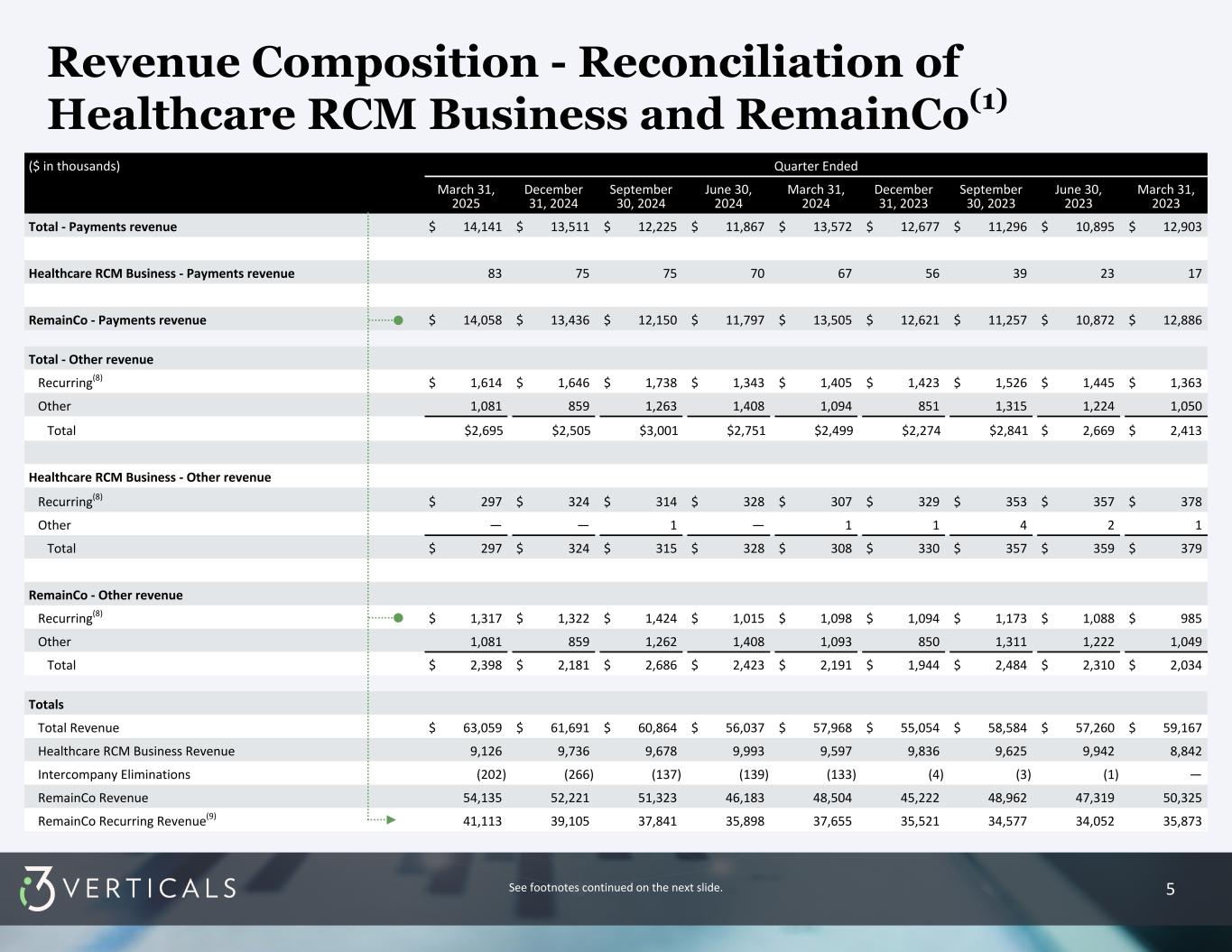 4 Revenue Composition - Reconciliation of Healthcare RCM Business and RemainCo(1) See remaining reconciliation continued on the next slide. ($ in thousands) Quarter Ended March 31, 2025 December 31, 2024 September 30, 2024 June 30, 2024 March 31, 2024 December 31, 2023 September 30, 2023 June 30, 2023 March 31, 2023 Total - Software and related service revenue SaaS(2) $ 10,585 $ 10,182 $ 9,677 $ 8,834 $ 8,809 $ 8,742 $ 8,977 $ 8,523 $ 8,244 Transaction-based(3) 4,043 3,836 4,121 3,928 3,538 3,651 3,706 3,291 3,174 Maintenance(4) 8,288 8,796 8,783 8,433 8,125 8,207 7,970 8,336 8,039 Recurring software services(5) 11,092 10,343 10,497 10,913 11,263 10,205 10,303 11,127 10,567 Professional services(6) 9,410 9,841 10,062 8,906 9,199 8,881 10,777 10,039 10,634 Software licenses 2,805 2,677 2,498 405 963 417 2,714 2,380 3,193 Total $ 46,223 $ 45,675 $ 45,638 $ 41,419 $ 41,897 $ 40,103 $ 44,447 $ 43,696 $ 43,851 Healthcare RCM Business - Software and related service revenue SaaS(2) $ 1,376 $ 1,370 $ 1,346 $ 1,317 $ 1,309 $ 1,323 $ 1,312 $ 1,308 $ 1,325 Transaction-based(3) 213 230 211 205 8 386 322 43 2 Maintenance(4) 173 174 173 178 189 192 193 199 200 Recurring software services(5) 6,710 7,302 7,218 7,461 7,310 7,102 6,985 7,636 6,495 Professional services(6) 274 258 333 434 404 425 411 363 424 Software licenses — 3 7 — 2 22 6 11 — Total $ 8,746 $ 9,337 $ 9,288 $ 9,595 $ 9,222 $ 9,450 $ 9,229 $ 9,560 $ 8,446 Intercompany eliminations of Recurring software services(7) $ (202) $ (266) $ (137) $ (139) $ (133) $ (4) $ (3) $ (1) $ — RemainCo - Software and related service revenue SaaS(2) $ 9,209 $ 8,812 $ 8,331 $ 7,517 $ 7,500 $ 7,419 $ 7,665 $ 7,215 $ 6,919 Transaction-based(3) 3,830 3,606 3,910 3,723 3,530 3,265 3,384 3,248 3,172 Maintenance(4) 8,115 8,622 8,610 8,255 7,936 8,015 7,777 8,137 7,839 Recurring software services(5) 4,584 3,307 3,416 3,591 4,086 3,107 3,321 3,492 4,072 Professional services(6) 9,136 9,583 9,729 8,472 8,795 8,456 10,366 9,676 10,210 Software licenses 2,805 2,674 2,491 405 961 395 2,708 2,369 3,193 Total $ 37,679 $ 36,604 $ 36,487 $ 31,963 $ 32,808 $ 30,657 $ 35,221 $ 34,137 $ 35,405