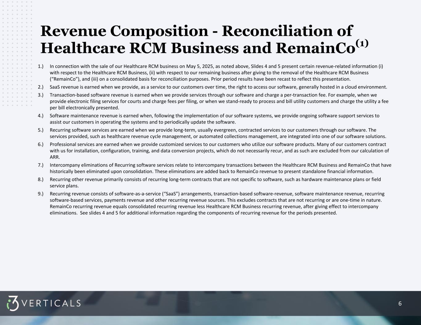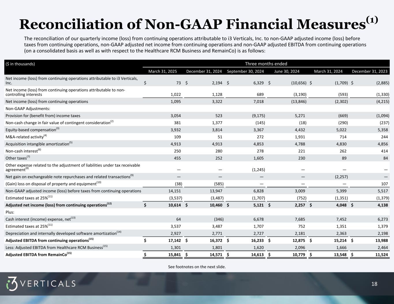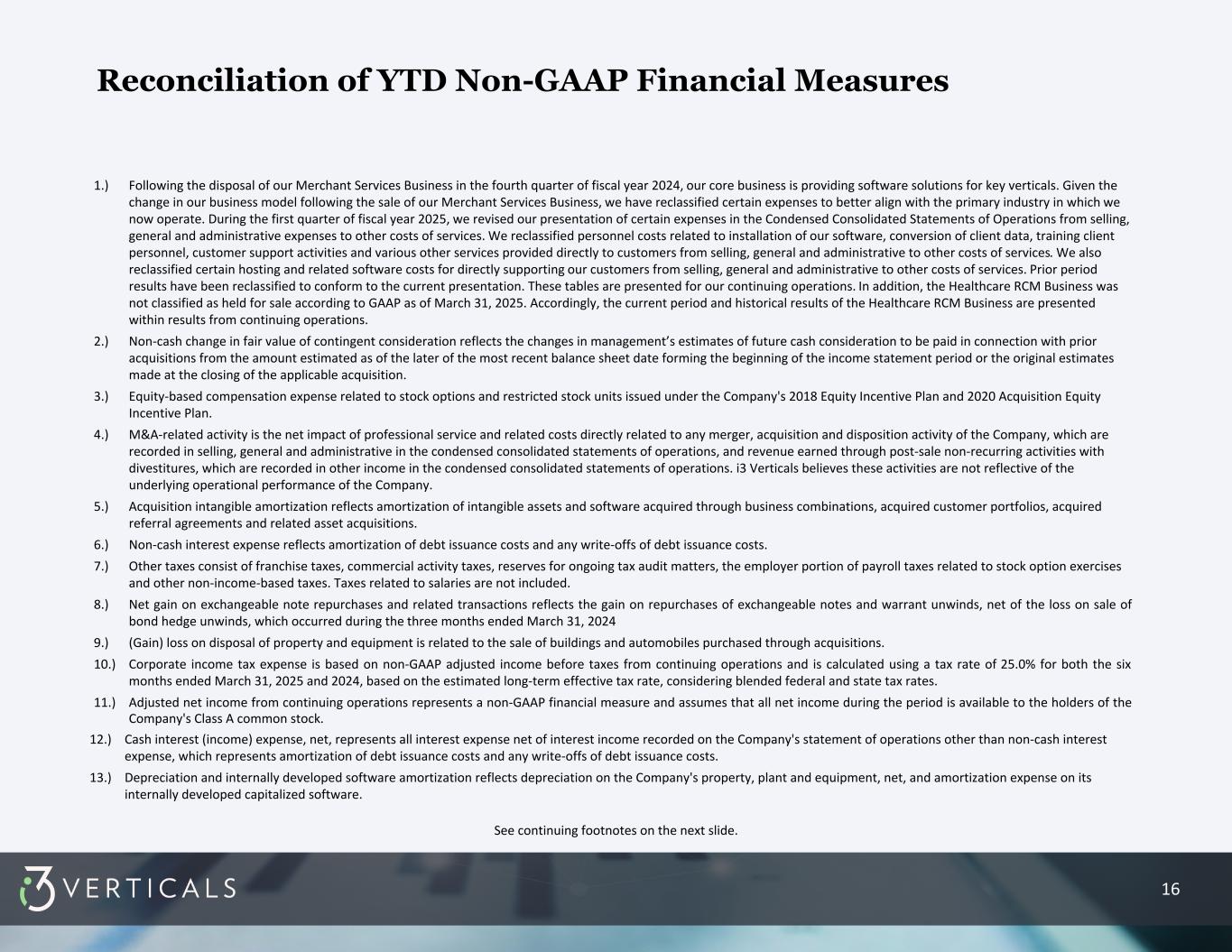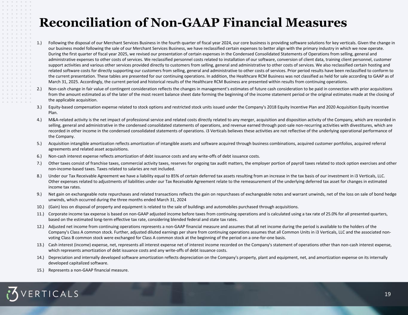 19 1.) Following the disposal of our Merchant Services Business in the fourth quarter of fiscal year 2024, our core business is providing software solutions for key verticals. Given the change in our business model following the sale of our Merchant Services Business, we have reclassified certain expenses to better align with the primary industry in which we now operate. During the first quarter of fiscal year 2025, we revised our presentation of certain expenses in the Condensed Consolidated Statements of Operations from selling, general and administrative expenses to other costs of services. We reclassified personnel costs related to installation of our software, conversion of client data, training client personnel, customer support activities and various other services provided directly to customers from selling, general and administrative to other costs of services. We also reclassified certain hosting and related software costs for directly supporting our customers from selling, general and administrative to other costs of services. Prior period results have been reclassified to conform to the current presentation. These tables are presented for our continuing operations. In addition, the Healthcare RCM Business was not classified as held for sale according to GAAP as of March 31, 2025. Accordingly, the current period and historical results of the Healthcare RCM Business are presented within results from continuing operations. 2.) Non-cash change in fair value of contingent consideration reflects the changes in management’s estimates of future cash consideration to be paid in connection with prior acquisitions from the amount estimated as of the later of the most recent balance sheet date forming the beginning of the income statement period or the original estimates made at the closing of the applicable acquisition. 3.) Equity-based compensation expense related to stock options and restricted stock units issued under the Company's 2018 Equity Incentive Plan and 2020 Acquisition Equity Incentive Plan. 4.) M&A-related activity is the net impact of professional service and related costs directly related to any merger, acquisition and disposition activity of the Company, which are recorded in selling, general and administrative in the condensed consolidated statements of operations, and revenue earned through post-sale non-recurring activities with divestitures, which are recorded in other income in the condensed consolidated statements of operations. i3 Verticals believes these activities are not reflective of the underlying operational performance of the Company. 5.) Acquisition intangible amortization reflects amortization of intangible assets and software acquired through business combinations, acquired customer portfolios, acquired referral agreements and related asset acquisitions. 6.) Non-cash interest expense reflects amortization of debt issuance costs and any write-offs of debt issuance costs. 7.) Other taxes consist of franchise taxes, commercial activity taxes, reserves for ongoing tax audit matters, the employer portion of payroll taxes related to stock option exercises and other non-income-based taxes. Taxes related to salaries are not included. 8.) Under our Tax Receivable Agreement we have a liability equal to 85% of certain deferred tax assets resulting from an increase in the tax basis of our investment in i3 Verticals, LLC. Other expenses related to adjustments of liabilities under our Tax Receivable Agreement relate to the remeasurement of the underlying deferred tax asset for changes in estimated income tax rates. 9.) Net gain on exchangeable note repurchases and related transactions reflects the gain on repurchases of exchangeable notes and warrant unwinds, net of the loss on sale of bond hedge unwinds, which occurred during the three months ended March 31, 2024 10.) (Gain) loss on disposal of property and equipment is related to the sale of buildings and automobiles purchased through acquisitions. 11.) Corporate income tax expense is based on non-GAAP adjusted income before taxes from continuing operations and is calculated using a tax rate of 25.0% for all presented quarters, based on the estimated long-term effective tax rate, considering blended federal and state tax rates. 12.) Adjusted net income from continuing operations represents a non-GAAP financial measure and assumes that all net income during the period is available to the holders of the Company's Class A common stock. Further, adjusted diluted earnings per share from continuing operations assumes that all Common Units in i3 Verticals, LLC and the associated non- voting Class B common stock were exchanged for Class A common stock at the beginning of the period on a one-for-one basis. 13.) Cash interest (income) expense, net, represents all interest expense net of interest income recorded on the Company's statement of operations other than non-cash interest expense, which represents amortization of debt issuance costs and any write-offs of debt issuance costs. 14.) Depreciation and internally developed software amortization reflects depreciation on the Company's property, plant and equipment, net, and amortization expense on its internally developed capitalized software. 15.) Represents a non-GAAP financial measure. Reconciliation of Non-GAAP Financial Measures
