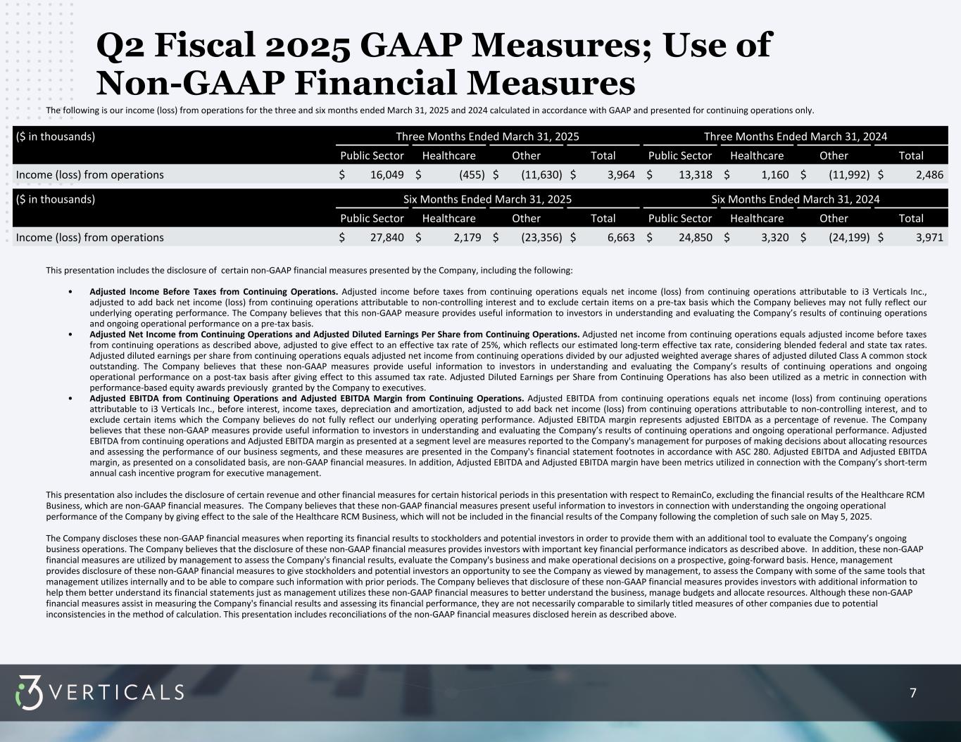 7 Q2 Fiscal 2025 GAAP Measures; Use of Non-GAAP Financial Measures ($ in thousands) Three Months Ended March 31, 2025 Three Months Ended March 31, 2024 Public Sector Healthcare Other Total Public Sector Healthcare Other Total Income (loss) from operations $ 16,049 $ (455) $ (11,630) $ 3,964 $ 13,318 $ 1,160 $ (11,992) $ 2,486 The following is our income (loss) from operations for the three and six months ended March 31, 2025 and 2024 calculated in accordance with GAAP and presented for continuing operations only. This presentation includes the disclosure of certain non-GAAP financial measures presented by the Company, including the following: • Adjusted Income Before Taxes from Continuing Operations. Adjusted income before taxes from continuing operations equals net income (loss) from continuing operations attributable to i3 Verticals Inc., adjusted to add back net income (loss) from continuing operations attributable to non-controlling interest and to exclude certain items on a pre-tax basis which the Company believes may not fully reflect our underlying operating performance. The Company believes that this non-GAAP measure provides useful information to investors in understanding and evaluating the Company’s results of continuing operations and ongoing operational performance on a pre-tax basis. • Adjusted Net Income from Continuing Operations and Adjusted Diluted Earnings Per Share from Continuing Operations. Adjusted net income from continuing operations equals adjusted income before taxes from continuing operations as described above, adjusted to give effect to an effective tax rate of 25%, which reflects our estimated long-term effective tax rate, considering blended federal and state tax rates. Adjusted diluted earnings per share from continuing operations equals adjusted net income from continuing operations divided by our adjusted weighted average shares of adjusted diluted Class A common stock outstanding. The Company believes that these non-GAAP measures provide useful information to investors in understanding and evaluating the Company’s results of continuing operations and ongoing operational performance on a post-tax basis after giving effect to this assumed tax rate. Adjusted Diluted Earnings per Share from Continuing Operations has also been utilized as a metric in connection with performance-based equity awards previously granted by the Company to executives. • Adjusted EBITDA from Continuing Operations and Adjusted EBITDA Margin from Continuing Operations. Adjusted EBITDA from continuing operations equals net income (loss) from continuing operations attributable to i3 Verticals Inc., before interest, income taxes, depreciation and amortization, adjusted to add back net income (loss) from continuing operations attributable to non-controlling interest, and to exclude certain items which the Company believes do not fully reflect our underlying operating performance. Adjusted EBITDA margin represents adjusted EBITDA as a percentage of revenue. The Company believes that these non-GAAP measures provide useful information to investors in understanding and evaluating the Company’s results of continuing operations and ongoing operational performance. Adjusted EBITDA from continuing operations and Adjusted EBITDA margin as presented at a segment level are measures reported to the Company's management for purposes of making decisions about allocating resources and assessing the performance of our business segments, and these measures are presented in the Company's financial statement footnotes in accordance with ASC 280. Adjusted EBITDA and Adjusted EBITDA margin, as presented on a consolidated basis, are non-GAAP financial measures. In addition, Adjusted EBITDA and Adjusted EBITDA margin have been metrics utilized in connection with the Company’s short-term annual cash incentive program for executive management. This presentation also includes the disclosure of certain revenue and other financial measures for certain historical periods in this presentation with respect to RemainCo, excluding the financial results of the Healthcare RCM Business, which are non-GAAP financial measures. The Company believes that these non-GAAP financial measures present useful information to investors in connection with understanding the ongoing operational performance of the Company by giving effect to the sale of the Healthcare RCM Business, which will not be included in the financial results of the Company following the completion of such sale on May 5, 2025. The Company discloses these non-GAAP financial measures when reporting its financial results to stockholders and potential investors in order to provide them with an additional tool to evaluate the Company’s ongoing business operations. The Company believes that the disclosure of these non-GAAP financial measures provides investors with important key financial performance indicators as described above. In addition, these non-GAAP financial measures are utilized by management to assess the Company's financial results, evaluate the Company's business and make operational decisions on a prospective, going-forward basis. Hence, management provides disclosure of these non-GAAP financial measures to give stockholders and potential investors an opportunity to see the Company as viewed by management, to assess the Company with some of the same tools that management utilizes internally and to be able to compare such information with prior periods. The Company believes that disclosure of these non-GAAP financial measures provides investors with additional information to help them better understand its financial statements just as management utilizes these non-GAAP financial measures to better understand the business, manage budgets and allocate resources. Although these non-GAAP financial measures assist in measuring the Company's financial results and assessing its financial performance, they are not necessarily comparable to similarly