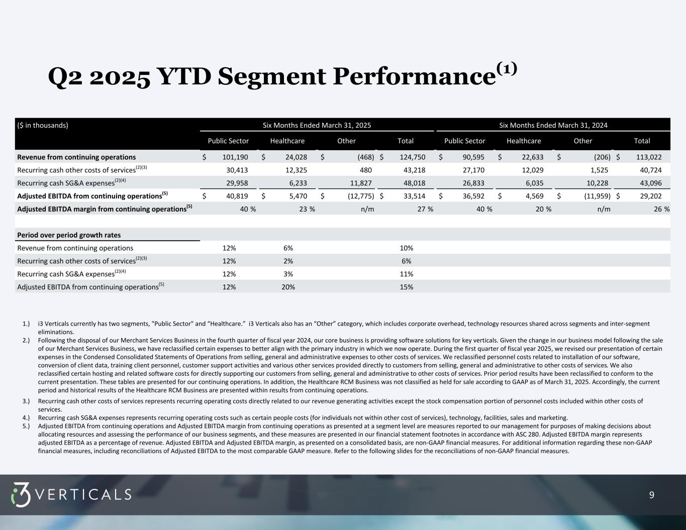 8 Q2 2025 QTD Segment Performance(1) 1.) i3 Verticals currently has two segments, "Public Sector" and “Healthcare.” i3 Verticals also has an “Other” category, which includes corporate overhead, technology resources shared across segments and inter-segment eliminations. 2.) Following the disposal of our Merchant Services Business in the fourth quarter of fiscal year 2024, our core business is providing software solutions for key verticals. Given the change in our business model following the sale of our Merchant Services Business, we have reclassified certain expenses to better align with the primary industry in which we now operate. During the first quarter of fiscal year 2025, we revised our presentation of certain expenses in the Condensed Consolidated Statements of Operations from selling, general and administrative expenses to other costs of services. We reclassified personnel costs related to installation of our software, conversion of client data, training client personnel, customer support activities and various other services provided directly to customers from selling, general and administrative to other costs of services. We also reclassified certain hosting and related software costs for directly supporting our customers from selling, general and administrative to other costs of services. Prior period results have been reclassified to conform to the current presentation. These tables are presented for our continuing operations. In addition, the Healthcare RCM Business was not classified as held for sale according to GAAP as of March 31, 2025. Accordingly, the current period and historical results of the Healthcare RCM Business are presented within results from continuing operations. 3.) Recurring cash other costs of services represents recurring operating costs directly related to our revenue generating activities except the stock compensation portion of personnel costs included within other costs of services. 4.) Recurring cash SG&A expenses represents recurring operating costs such as certain people costs (for individuals not within other cost of services), technology, facilities, sales and marketing. 5.) Adjusted EBITDA from continuing operations and Adjusted EBITDA margin from continuing operations as presented at a segment level are measures reported to our management for purposes of making decisions about allocating resources and assessing the performance of our business segments, and these measures are presented in our financial statement footnotes in accordance with ASC 280. Adjusted EBITDA margin represents adjusted EBITDA as a percentage of revenue. Adjusted EBITDA and Adjusted EBITDA margin, as presented on a consolidated basis, are non-GAAP financial measures. For additional information regarding these non-GAAP financial measures, including reconciliations of Adjusted EBITDA to the most comparable GAAP measure. Refer to the following slides for the reconciliations of non-GAAP financial measures. ($ in thousands) Three Months Ended March 31, 2025 Three Months Ended March 31, 2024 Public Sector Healthcare Other Total Public Sector Healthcare Other Total Revenue from continuing operations $ 52,405 $ 10,857 $ (203) $ 63,059 $ 47,097 $ 11,053 $ (182) $ 57,968 Recurring cash other costs of services(2)(3) 15,698 6,151 338 22,187 14,207 6,209 731 21,147 Recurring cash SG&A expenses(2)(4) 15,131 2,984 5,615 23,730 13,657 3,069 4,881 21,607 Adjusted EBITDA from continuing operations(5) $ 21,576 $ 1,722 $ (6,156) $ 17,142 $ 19,233 $ 1,775 $ (5,794) $ 15,214 Adjusted EBITDA margin from continuing operations(5) 41 % 16 % n/m 27 % 41 % 16 % n/m 26 % Period over period growth rates Revenue from continuing operations 11% (2)% 9% Recurring cash other costs of services(2)(3) 10% (1)% 5% Recurring cash SG&A expenses(2)(4) 11% (3)% 10% Adjusted EBITDA from continuing operations(5) 12% (3)% 13%