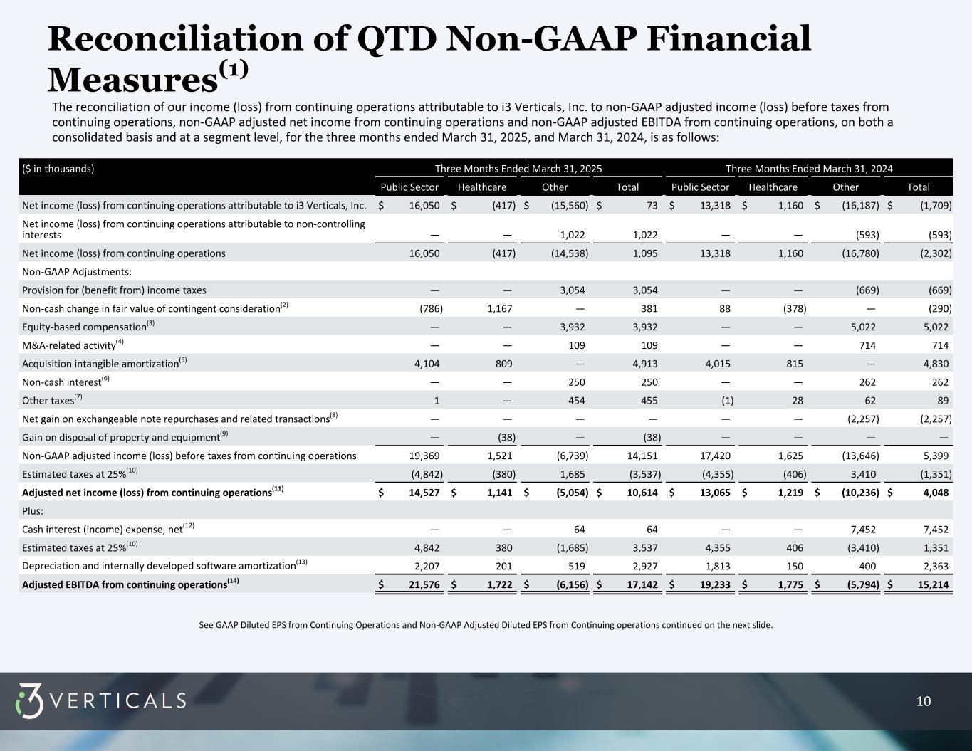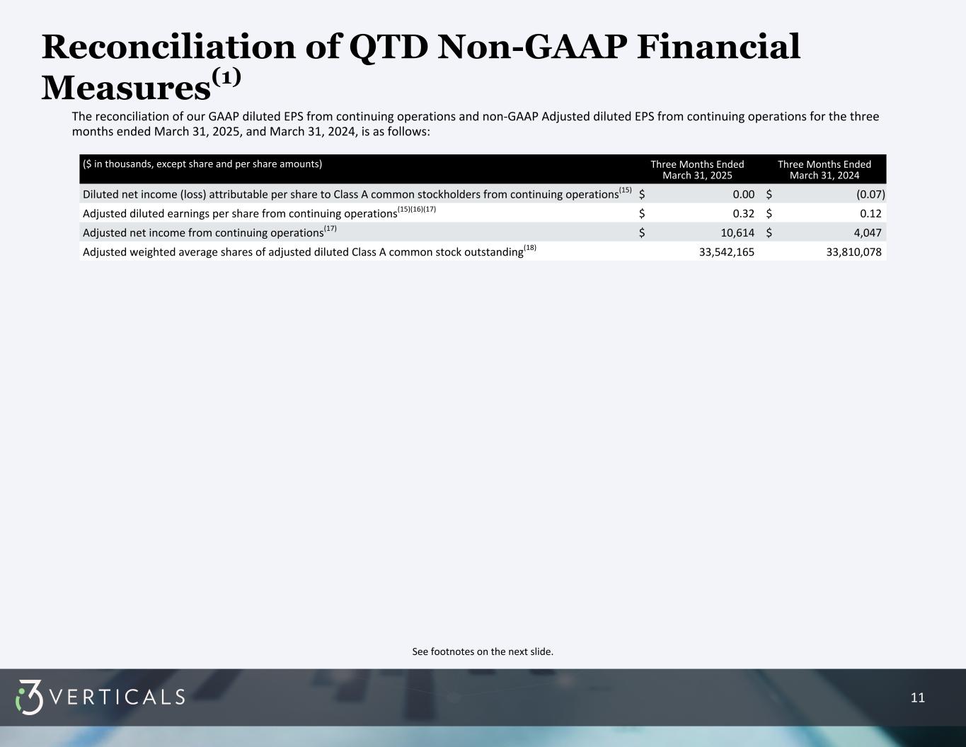 10 Reconciliation of QTD Non-GAAP Financial Measures(1) The reconciliation of our income (loss) from continuing operations attributable to i3 Verticals, Inc. to non-GAAP adjusted income (loss) before taxes from continuing operations, non-GAAP adjusted net income from continuing operations and non-GAAP adjusted EBITDA from continuing operations, on both a consolidated basis and at a segment level, for the three months ended March 31, 2025, and March 31, 2024, is as follows: See GAAP Diluted EPS from Continuing Operations and Non-GAAP Adjusted Diluted EPS from Continuing operations continued on the next slide. ($ in thousands) Three Months Ended March 31, 2025 Three Months Ended March 31, 2024 Public Sector Healthcare Other Total Public Sector Healthcare Other Total Net income (loss) from continuing operations attributable to i3 Verticals, Inc. $ 16,050 $ (417) $ (15,560) $ 73 $ 13,318 $ 1,160 $ (16,187) $ (1,709) Net income (loss) from continuing operations attributable to non-controlling interests — — 1,022 1,022 — — (593) (593) Net income (loss) from continuing operations 16,050 (417) (14,538) 1,095 13,318 1,160 (16,780) (2,302) Non-GAAP Adjustments: Provision for (benefit from) income taxes — — 3,054 3,054 — — (669) (669) Non-cash change in fair value of contingent consideration(2) (786) 1,167 — 381 88 (378) — (290) Equity-based compensation(3) — — 3,932 3,932 — — 5,022 5,022 M&A-related activity(4) — — 109 109 — — 714 714 Acquisition intangible amortization(5) 4,104 809 — 4,913 4,015 815 — 4,830 Non-cash interest(6) — — 250 250 — — 262 262 Other taxes(7) 1 — 454 455 (1) 28 62 89 Net gain on exchangeable note repurchases and related transactions(8) — — — — — — (2,257) (2,257) Gain on disposal of property and equipment(9) — (38) — (38) — — — — Non-GAAP adjusted income (loss) before taxes from continuing operations 19,369 1,521 (6,739) 14,151 17,420 1,625 (13,646) 5,399 Estimated taxes at 25%(10) (4,842) (380) 1,685 (3,537) (4,355) (406) 3,410 (1,351) Adjusted net income (loss) from continuing operations(11) $ 14,527 $ 1,141 $ (5,054) $ 10,614 $ 13,065 $ 1,219 $ (10,236) $ 4,048 Plus: Cash interest (income) expense, net(12) — — 64 64 — — 7,452 7,452 Estimated taxes at 25%(10) 4,842 380 (1,685) 3,537 4,355 406 (3,410) 1,351 Depreciation and internally developed software amortization(13) 2,207 201 519 2,927 1,813 150 400 2,363 Adjusted EBITDA from continuing operations(14) $ 21,576 $ 1,722 $ (6,156) $ 17,142 $ 19,233 $ 1,775 $ (5,794) $ 15,214