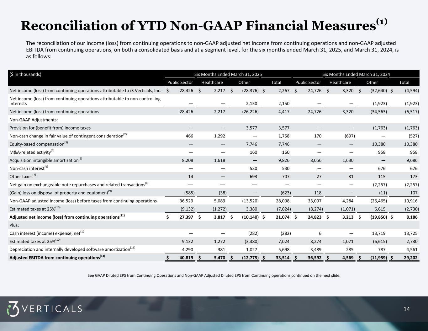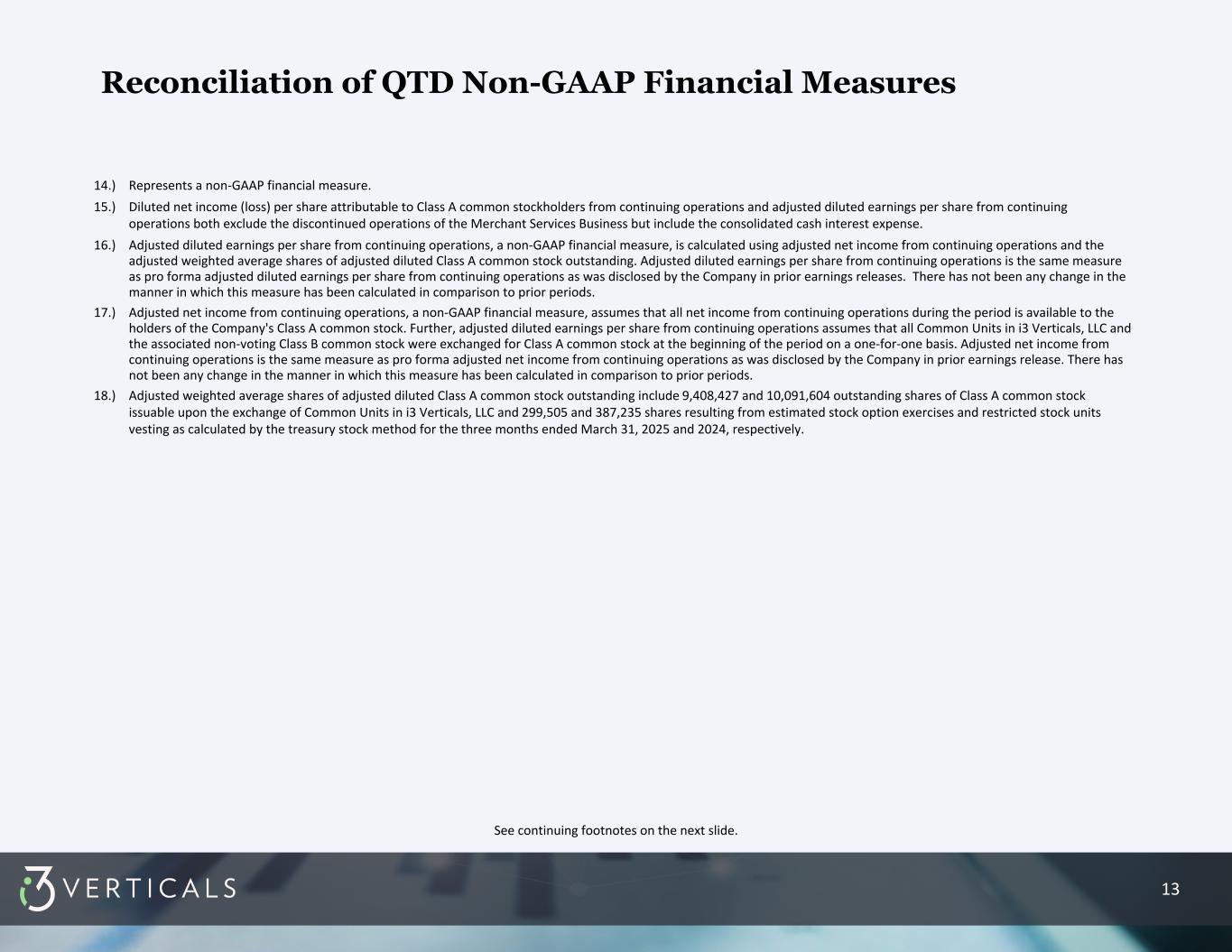 12 1.) Following the disposal of our Merchant Services Business in the fourth quarter of fiscal year 2024, our core business is providing software solutions for key verticals. Given the change in our business model following the sale of our Merchant Services Business, we have reclassified certain expenses to better align with the primary industry in which we now operate. During the first quarter of fiscal year 2025, we revised our presentation of certain expenses in the Condensed Consolidated Statements of Operations from selling, general and administrative expenses to other costs of services. We reclassified personnel costs related to installation of our software, conversion of client data, training client personnel, customer support activities and various other services provided directly to customers from selling, general and administrative to other costs of services. We also reclassified certain hosting and related software costs for directly supporting our customers from selling, general and administrative to other costs of services. Prior period results have been reclassified to conform to the current presentation. These tables are presented for our continuing operations. In addition, the Healthcare RCM Business was not classified as held for sale according to GAAP as of March 31, 2025. Accordingly, the current period and historical results of the Healthcare RCM Business are presented within results from continuing operations. 2.) Non-cash change in fair value of contingent consideration reflects the changes in management’s estimates of future cash consideration to be paid in connection with prior acquisitions from the amount estimated as of the later of the most recent balance sheet date forming the beginning of the income statement period or the original estimates made at the closing of the applicable acquisition. 3.) Equity-based compensation expense related to stock options and restricted stock units issued under the Company's 2018 Equity Incentive Plan and 2020 Acquisition Equity Incentive Plan. 4.) M&A-related activity is the net impact of professional service and related costs directly related to any merger, acquisition and disposition activity of the Company, which are recorded in selling, general and administrative in the condensed consolidated statements of operations, and revenue earned through post-sale non-recurring activities with divestitures, which are recorded in other income in the condensed consolidated statements of operations. i3 Verticals believes these activities are not reflective of the underlying operational performance of the Company. 5.) Acquisition intangible amortization reflects amortization of intangible assets and software acquired through business combinations, acquired customer portfolios, acquired referral agreements and related asset acquisitions. 6.) Non-cash interest expense reflects amortization of debt issuance costs and any write-offs of debt issuance costs. 7.) Other taxes consist of franchise taxes, commercial activity taxes, reserves for ongoing tax audit matters, the employer portion of payroll taxes related to stock option exercises and other non-income-based taxes. Taxes related to salaries are not included. 8.) Net gain on exchangeable note repurchases and related transactions reflects the gain on repurchases of exchangeable notes and warrant unwinds, net of the loss on sale of bond hedge unwinds, which occurred during the three months ended March 31, 2024 9.) (Gain) loss on disposal of property and equipment is related to the sale of buildings and automobiles purchased through acquisitions. 10.) Corporate income tax expense is based on non-GAAP adjusted income before taxes from continuing operations and is calculated using a tax rate of 25.0% for both the six months ended March 31, 2025 and 2024, based on the estimated long-term effective tax rate, considering blended federal and state tax rates. 11.) Adjusted net income from continuing operations represents a non-GAAP financial measure and assumes that all net income during the period is available to the holders of the Company's Class A common stock. Further, adjusted diluted earnings per share from continuing operations assumes that all Common Units in i3 Verticals, LLC and the associated non-voting Class B common stock were exchanged for Class A common stock at the beginning of the period on a one-for-one basis. 12.) Cash interest (income) expense, net, represents all interest expense net of interest income recorded on the Company's statement of operations other than non-cash interest expense, which represents amortization of debt issuance costs and any write-offs of debt issuance costs. 13.) Depreciation and internally developed software amortization reflects depreciation on the Company's property, plant and equipment, net, and amortization expense on its internally developed capitalized software. Reconciliation of QTD Non-GAAP Financial Measures See continuing footnotes on the next slide.
