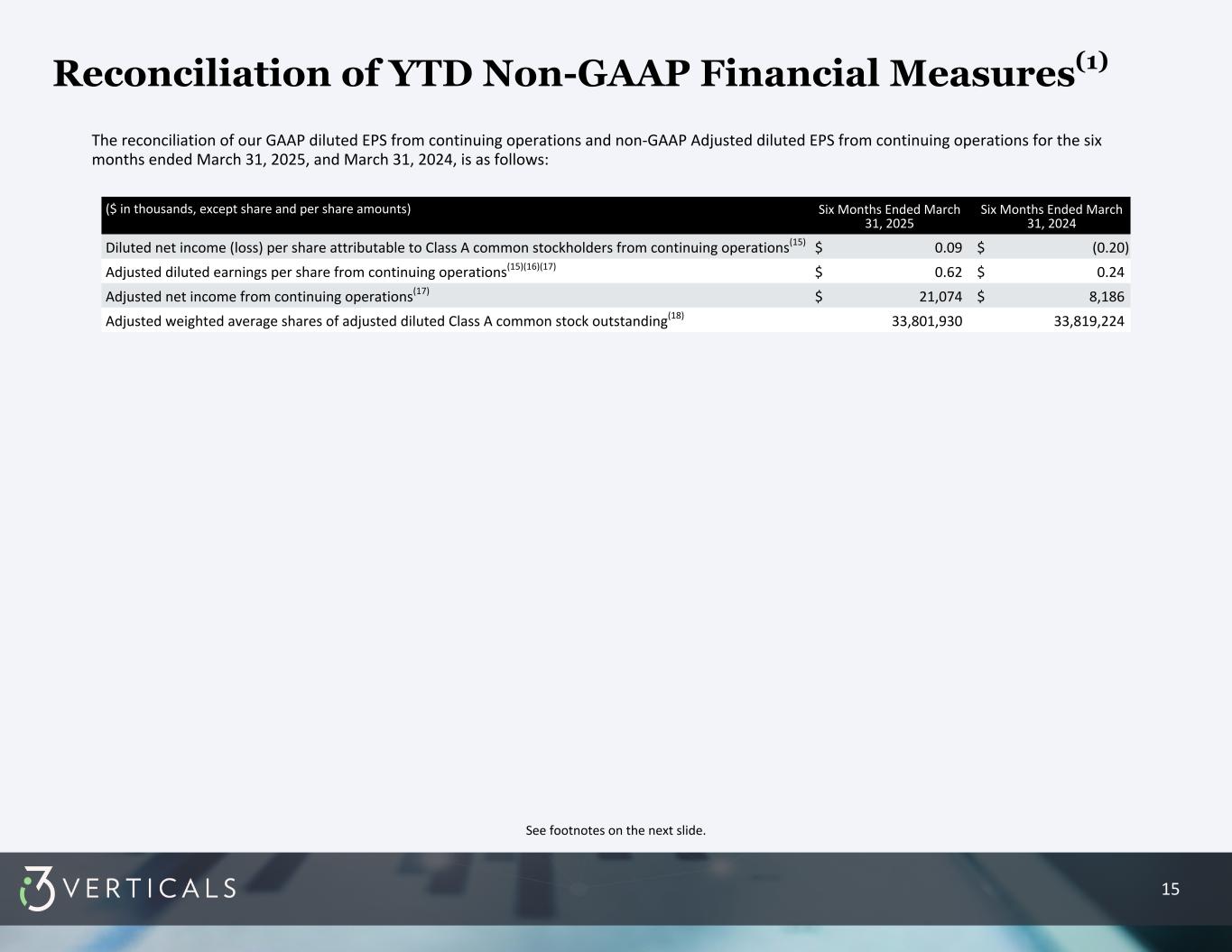 14 Reconciliation of YTD Non-GAAP Financial Measures(1) The reconciliation of our income (loss) from continuing operations to non-GAAP adjusted net income from continuing operations and non-GAAP adjusted EBITDA from continuing operations, on both a consolidated basis and at a segment level, for the six months ended March 31, 2025, and March 31, 2024, is as follows: ($ in thousands) Six Months Ended March 31, 2025 Six Months Ended March 31, 2024 Public Sector Healthcare Other Total Public Sector Healthcare Other Total Net income (loss) from continuing operations attributable to i3 Verticals, Inc. $ 28,426 $ 2,217 $ (28,376) $ 2,267 $ 24,726 $ 3,320 $ (32,640) $ (4,594) Net income (loss) from continuing operations attributable to non-controlling interests — — 2,150 2,150 — — (1,923) (1,923) Net income (loss) from continuing operations 28,426 2,217 (26,226) 4,417 24,726 3,320 (34,563) (6,517) Non-GAAP Adjustments: Provision for (benefit from) income taxes — — 3,577 3,577 — — (1,763) (1,763) Non-cash change in fair value of contingent consideration(2) 466 1,292 — 1,758 170 (697) — (527) Equity-based compensation(3) — — 7,746 7,746 — — 10,380 10,380 M&A-related activity(4) — — 160 160 — — 958 958 Acquisition intangible amortization(5) 8,208 1,618 — 9,826 8,056 1,630 — 9,686 Non-cash interest(6) — — 530 530 — — 676 676 Other taxes(7) 14 — 693 707 27 31 115 173 Net gain on exchangeable note repurchases and related transactions(8) — — — — — — (2,257) (2,257) (Gain) loss on disposal of property and equipment(9) (585) (38) — (623) 118 — (11) 107 Non-GAAP adjusted income (loss) before taxes from continuing operations 36,529 5,089 (13,520) 28,098 33,097 4,284 (26,465) 10,916 Estimated taxes at 25%(10) (9,132) (1,272) 3,380 (7,024) (8,274) (1,071) 6,615 (2,730) Adjusted net income (loss) from continuing operations(11) $ 27,397 $ 3,817 $ (10,140) $ 21,074 $ 24,823 $ 3,213 $ (19,850) $ 8,186 Plus: Cash interest (income) expense, net(12) — — (282) (282) 6 — 13,719 13,725 Estimated taxes at 25%(10) 9,132 1,272 (3,380) 7,024 8,274 1,071 (6,615) 2,730 Depreciation and internally developed software amortization(13) 4,290 381 1,027 5,698 3,489 285 787 4,561 Adjusted EBITDA from continuing operations(14) $ 40,819 $ 5,470 $ (12,775) $ 33,514 $ 36,592 $ 4,569 $ (11,959) $ 29,202 See GAAP Diluted EPS from Continuing Operations and Non-GAAP Adjusted Diluted EPS from Continuing operations continued on the next slide.
