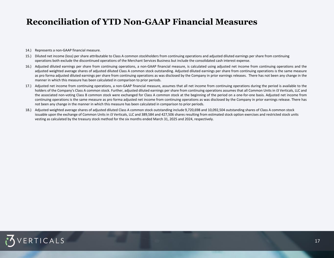 16 1.) Following the disposal of our Merchant Services Business in the fourth quarter of fiscal year 2024, our core business is providing software solutions for key verticals. Given the change in our business model following the sale of our Merchant Services Business, we have reclassified certain expenses to better align with the primary industry in which we now operate. During the first quarter of fiscal year 2025, we revised our presentation of certain expenses in the Condensed Consolidated Statements of Operations from selling, general and administrative expenses to other costs of services. We reclassified personnel costs related to installation of our software, conversion of client data, training client personnel, customer support activities and various other services provided directly to customers from selling, general and administrative to other costs of services. We also reclassified certain hosting and related software costs for directly supporting our customers from selling, general and administrative to other costs of services. Prior period results have been reclassified to conform to the current presentation. These tables are presented for our continuing operations. In addition, the Healthcare RCM Business was not classified as held for sale according to GAAP as of March 31, 2025. Accordingly, the current period and historical results of the Healthcare RCM Business are presented within results from continuing operations. 2.) Non-cash change in fair value of contingent consideration reflects the changes in management’s estimates of future cash consideration to be paid in connection with prior acquisitions from the amount estimated as of the later of the most recent balance sheet date forming the beginning of the income statement period or the original estimates made at the closing of the applicable acquisition. 3.) Equity-based compensation expense related to stock options and restricted stock units issued under the Company's 2018 Equity Incentive Plan and 2020 Acquisition Equity Incentive Plan. 4.) M&A-related activity is the net impact of professional service and related costs directly related to any merger, acquisition and disposition activity of the Company, which are recorded in selling, general and administrative in the condensed consolidated statements of operations, and revenue earned through post-sale non-recurring activities with divestitures, which are recorded in other income in the condensed consolidated statements of operations. i3 Verticals believes these activities are not reflective of the underlying operational performance of the Company. 5.) Acquisition intangible amortization reflects amortization of intangible assets and software acquired through business combinations, acquired customer portfolios, acquired referral agreements and related asset acquisitions. 6.) Non-cash interest expense reflects amortization of debt issuance costs and any write-offs of debt issuance costs. 7.) Other taxes consist of franchise taxes, commercial activity taxes, reserves for ongoing tax audit matters, the employer portion of payroll taxes related to stock option exercises and other non-income-based taxes. Taxes related to salaries are not included. 8.) Net gain on exchangeable note repurchases and related transactions reflects the gain on repurchases of exchangeable notes and warrant unwinds, net of the loss on sale of bond hedge unwinds, which occurred during the three months ended March 31, 2024 9.) (Gain) loss on disposal of property and equipment is related to the sale of buildings and automobiles purchased through acquisitions. 10.) Corporate income tax expense is based on non-GAAP adjusted income before taxes from continuing operations and is calculated using a tax rate of 25.0% for both the six months ended March 31, 2025 and 2024, based on the estimated long-term effective tax rate, considering blended federal and state tax rates. 11.) Adjusted net income from continuing operations represents a non-GAAP financial measure and assumes that all net income during the period is available to the holders of the Company's Class A common stock. 12.) Cash interest (income) expense, net, represents all interest expense net of interest income recorded on the Company's statement of operations other than non-cash interest expense, which represents amortization of debt issuance costs and any write-offs of debt issuance costs. 13.) Depreciation and internally developed software amortization reflects depreciation on the Company's property, plant and equipment, net, and amortization expense on its internally developed capitalized software. Reconciliation of YTD Non-GAAP Financial Measures See continuing footnotes on the next slide.