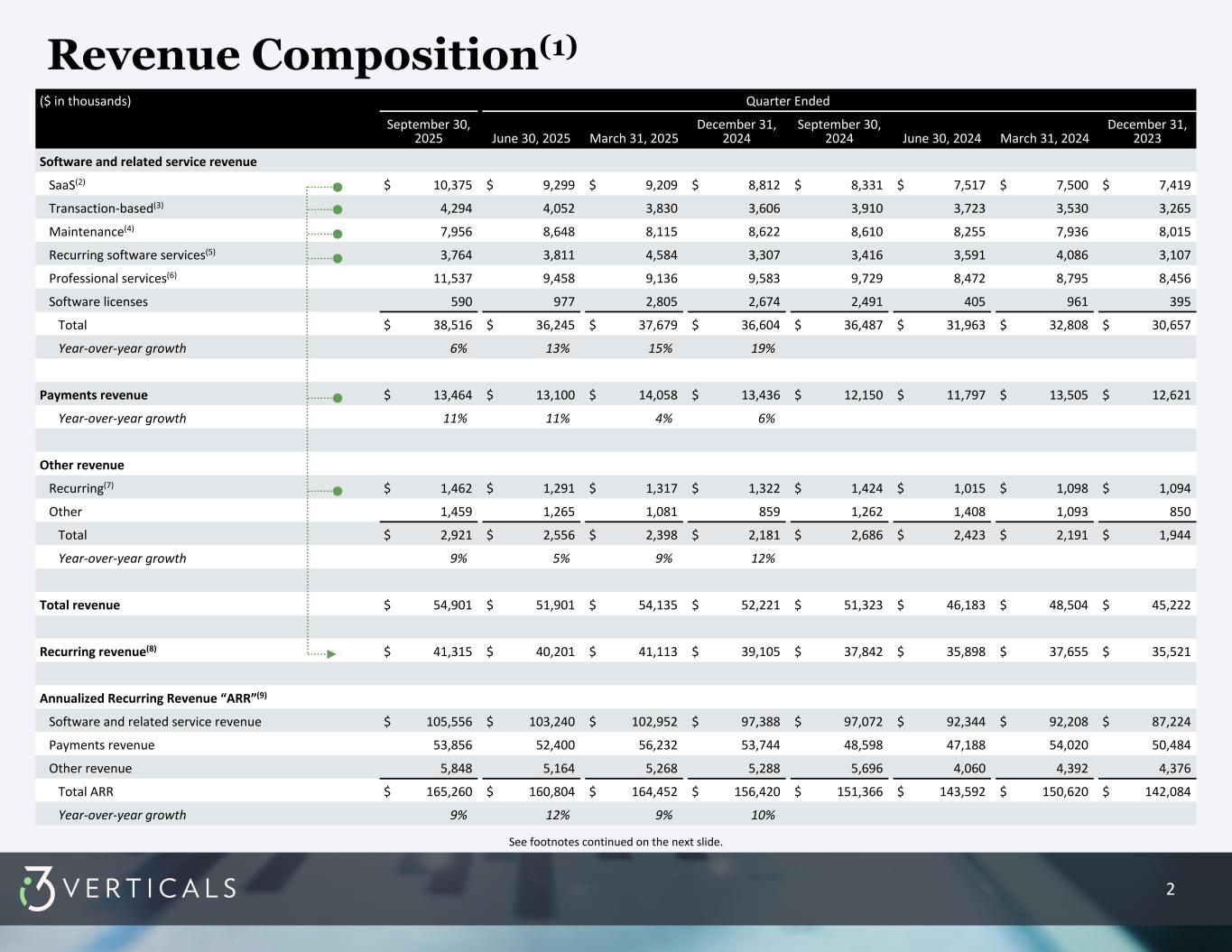 2 Revenue Composition(1) ($ in thousands) Quarter Ended September 30, 2025 June 30, 2025 March 31, 2025 December 31, 2024 September 30, 2024 June 30, 2024 March 31, 2024 December 31, 2023 Software and related service revenue SaaS(2) $ 10,375 $ 9,299 $ 9,209 $ 8,812 $ 8,331 $ 7,517 $ 7,500 $ 7,419 Transaction-based(3) 4,294 4,052 3,830 3,606 3,910 3,723 3,530 3,265 Maintenance(4) 7,956 8,648 8,115 8,622 8,610 8,255 7,936 8,015 Recurring software services(5) 3,764 3,811 4,584 3,307 3,416 3,591 4,086 3,107 Professional services(6) 11,537 9,458 9,136 9,583 9,729 8,472 8,795 8,456 Software licenses 590 977 2,805 2,674 2,491 405 961 395 Total $ 38,516 $ 36,245 $ 37,679 $ 36,604 $ 36,487 $ 31,963 $ 32,808 $ 30,657 Year-over-year growth 6 % 13 % 15 % 19 % Payments revenue $ 13,464 $ 13,100 $ 14,058 $ 13,436 $ 12,150 $ 11,797 $ 13,505 $ 12,621 Year-over-year growth 11 % 11 % 4 % 6 % Other revenue Recurring(7) $ 1,462 $ 1,291 $ 1,317 $ 1,322 $ 1,424 $ 1,015 $ 1,098 $ 1,094 Other 1,459 1,265 1,081 859 1,262 1,408 1,093 850 Total $ 2,921 $ 2,556 $ 2,398 $ 2,181 $ 2,686 $ 2,423 $ 2,191 $ 1,944 Year-over-year growth 9 % 5 % 9 % 12 % Total revenue $ 54,901 $ 51,901 $ 54,135 $ 52,221 $ 51,323 $ 46,183 $ 48,504 $ 45,222 Recurring revenue(8) $ 41,315 $ 40,201 $ 41,113 $ 39,105 $ 37,842 $ 35,898 $ 37,655 $ 35,521 Annualized Recurring Revenue “ARR”(9) Software and related service revenue $ 105,556 $ 103,240 $ 102,952 $ 97,388 $ 97,072 $ 92,344 $ 92,208 $ 87,224 Payments revenue 53,856 52,400 56,232 53,744 48,598 47,188 54,020 50,484 Other revenue 5,848 5,164 5,268 5,288 5,696 4,060 4,392 4,376 Total ARR $ 165,260 $ 160,804 $ 164,452 $ 156,420 $ 151,366 $ 143,592 $ 150,620 $ 142,084 Year-over-year growth 9 % 12 % 9 % 10 % See footnotes continued on the next slide.