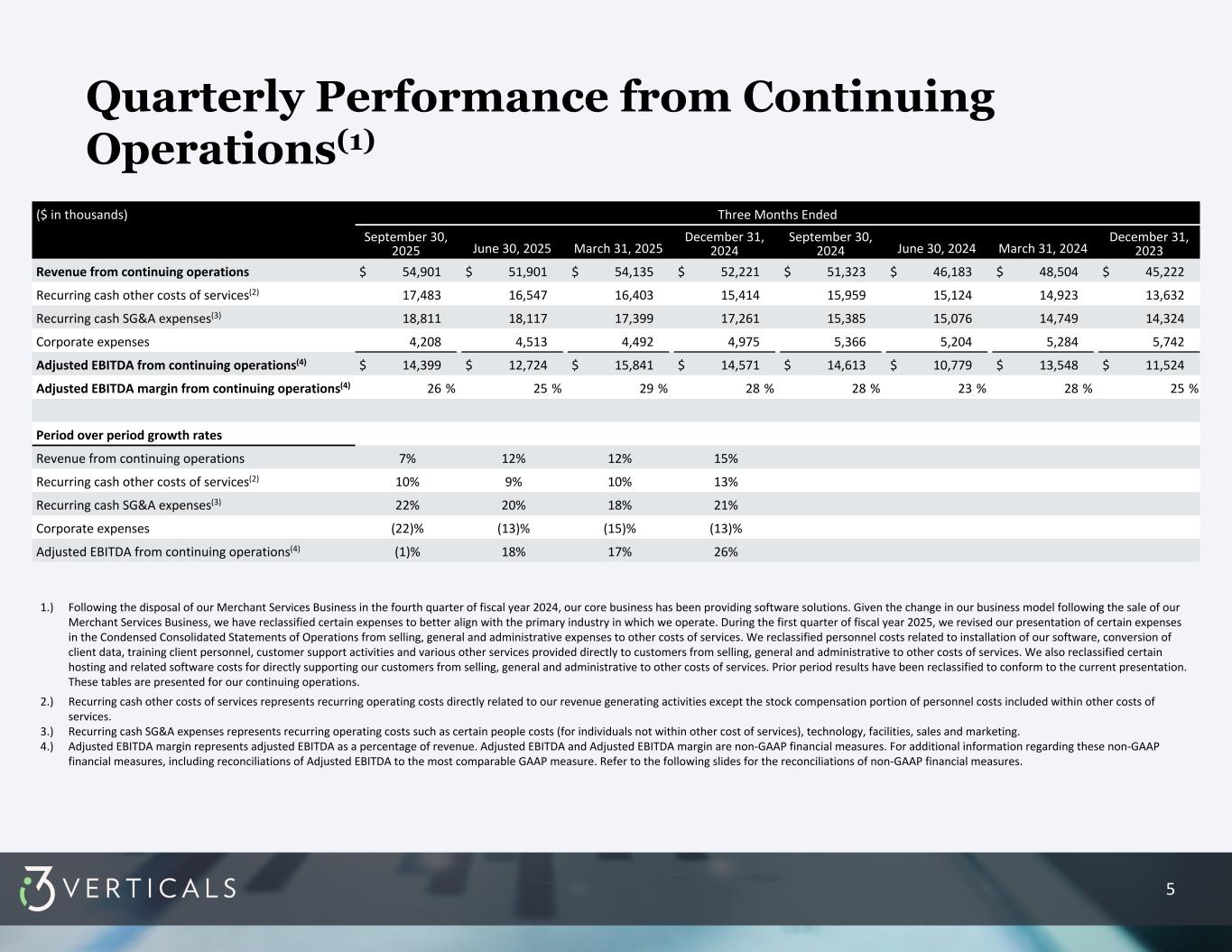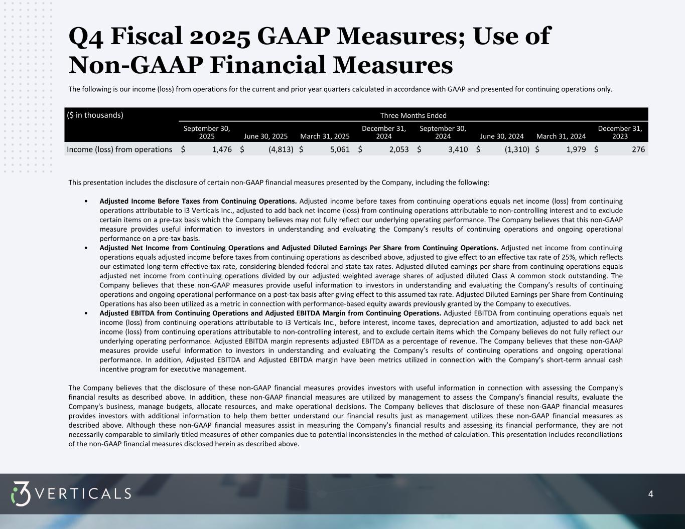 4 The following is our income (loss) from operations for the current and prior year quarters calculated in accordance with GAAP and presented for continuing operations only. This presentation includes the disclosure of certain non-GAAP financial measures presented by the Company, including the following: • Adjusted Income Before Taxes from Continuing Operations. Adjusted income before taxes from continuing operations equals net income (loss) from continuing operations attributable to i3 Verticals Inc., adjusted to add back net income (loss) from continuing operations attributable to non-controlling interest and to exclude certain items on a pre-tax basis which the Company believes may not fully reflect our underlying operating performance. The Company believes that this non-GAAP measure provides useful information to investors in understanding and evaluating the Company’s results of continuing operations and ongoing operational performance on a pre-tax basis. • Adjusted Net Income from Continuing Operations and Adjusted Diluted Earnings Per Share from Continuing Operations. Adjusted net income from continuing operations equals adjusted income before taxes from continuing operations as described above, adjusted to give effect to an effective tax rate of 25%, which reflects our estimated long-term effective tax rate, considering blended federal and state tax rates. Adjusted diluted earnings per share from continuing operations equals adjusted net income from continuing operations divided by our adjusted weighted average shares of adjusted diluted Class A common stock outstanding. The Company believes that these non-GAAP measures provide useful information to investors in understanding and evaluating the Company’s results of continuing operations and ongoing operational performance on a post-tax basis after giving effect to this assumed tax rate. Adjusted Diluted Earnings per Share from Continuing Operations has also been utilized as a metric in connection with performance-based equity awards previously granted by the Company to executives. • Adjusted EBITDA from Continuing Operations and Adjusted EBITDA Margin from Continuing Operations. Adjusted EBITDA from continuing operations equals net income (loss) from continuing operations attributable to i3 Verticals Inc., before interest, income taxes, depreciation and amortization, adjusted to add back net income (loss) from continuing operations attributable to non-controlling interest, and to exclude certain items which the Company believes do not fully reflect our underlying operating performance. Adjusted EBITDA margin represents adjusted EBITDA as a percentage of revenue. The Company believes that these non-GAAP measures provide useful information to investors in understanding and evaluating the Company’s results of continuing operations and ongoing operational performance. In addition, Adjusted EBITDA and Adjusted EBITDA margin have been metrics utilized in connection with the Company’s short-term annual cash incentive program for executive management. The Company believes that the disclosure of these non-GAAP financial measures provides investors with useful information in connection with assessing the Company's financial results as described above. In addition, these non-GAAP financial measures are utilized by management to assess the Company's financial results, evaluate the Company's business, manage budgets, allocate resources, and make operational decisions. The Company believes that disclosure of these non-GAAP financial measures provides investors with additional information to help them better understand our financial results just as management utilizes these non-GAAP financial measures as described above. Although these non-GAAP financial measures assist in measuring the Company's financial results and assessing its financial performance, they are not necessarily comparable to similarly titled measures of other companies due to potential inconsistencies in the method of calculation. This presentation includes reconciliations of the non-GAAP financial measures disclosed herein as described above. Q4 Fiscal 2025 GAAP Measures; Use of Non-GAAP Financial Measures ($ in thousands) Three Months Ended September 30, 2025 June 30, 2025 March 31, 2025 December 31, 2024 September 30, 2024 June 30, 2024 March 31, 2024 December 31, 2023 Income (loss) from operations $ 1,476 $ (4,813) $ 5,061 $ 2,053 $ 3,410 $ (1,310) $ 1,979 $ 276