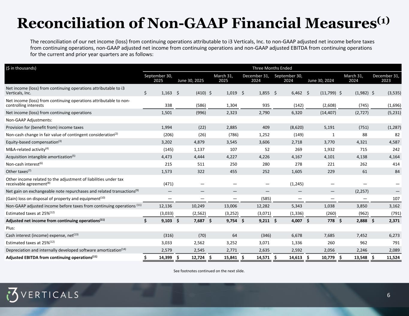 6 ($ in thousands) Three Months Ended September 30, 2025 June 30, 2025 March 31, 2025 December 31, 2024 September 30, 2024 June 30, 2024 March 31, 2024 December 31, 2023 Net income (loss) from continuing operations attributable to i3 Verticals, Inc. $ 1,163 $ (410) $ 1,019 $ 1,855 $ 6,462 $ (11,799) $ (1,982) $ (3,535) Net income (loss) from continuing operations attributable to non- controlling interests 338 (586) 1,304 935 (142) (2,608) (745) (1,696) Net income (loss) from continuing operations 1,501 (996) 2,323 2,790 6,320 (14,407) (2,727) (5,231) Non-GAAP Adjustments: Provision for (benefit from) income taxes 1,994 (22) 2,885 409 (8,620) 5,191 (751) (1,287) Non-cash change in fair value of contingent consideration(2) (206) (26) (786) 1,252 (149) 1 88 82 Equity-based compensation(3) 3,202 4,879 3,545 3,606 2,718 3,770 4,321 4,587 M&A-related activity(4) (145) 1,137 107 52 269 1,932 715 242 Acquisition intangible amortization(5) 4,473 4,444 4,227 4,226 4,167 4,101 4,138 4,164 Non-cash interest(6) 215 511 250 280 278 221 262 414 Other taxes(7) 1,573 322 455 252 1,605 229 61 84 Other income related to the adjustment of liabilities under tax receivable agreement(8) (471) — — — (1,245) — — — Net gain on exchangeable note repurchases and related transactions(9) — — — — — — (2,257) — (Gain) loss on disposal of property and equipment(10) — — — (585) — — — 107 Non-GAAP adjusted income before taxes from continuing operations (11) 12,136 10,249 13,006 12,282 5,343 1,038 3,850 3,162 Estimated taxes at 25%(12) (3,033) (2,562) (3,252) (3,071) (1,336) (260) (962) (791) Adjusted net income from continuing operations(11) $ 9,103 $ 7,687 $ 9,754 $ 9,211 $ 4,007 $ 778 $ 2,888 $ 2,371 Plus: Cash interest (income) expense, net(13) (316) (70) 64 (346) 6,678 7,685 7,452 6,273 Estimated taxes at 25%(12) 3,033 2,562 3,252 3,071 1,336 260 962 791 Depreciation and internally developed software amortization(14) 2,579 2,545 2,771 2,635 2,592 2,056 2,246 2,089 Adjusted EBITDA from continuing operations(11) $ 14,399 $ 12,724 $ 15,841 $ 14,571 $ 14,613 $ 10,779 $ 13,548 $ 11,524 See footnotes continued on the next slide. Reconciliation of Non-GAAP Financial Measures(1) The reconciliation of our net income (loss) from continuing operations attributable to i3 Verticals, Inc. to non-GAAP adjusted net income before taxes from continuing operations, non-GAAP adjusted net income from continuing operations and non-GAAP adjusted EBITDA from continuing operations for the current and prior year quarters are as follows: