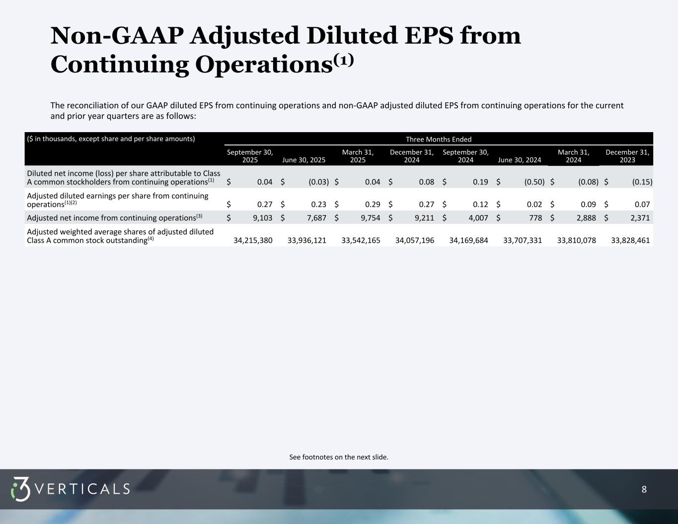 7 Reconciliation of Non-GAAP Financial Measures 1.) Following the disposal of our Merchant Services Business in the fourth quarter of fiscal year 2024, our core business has been providing software solutions. Given the change in our business model following the sale of our Merchant Services Business, we have reclassified certain expenses to better align with the primary industry in which we operate. During the first quarter of fiscal year 2025, we revised our presentation of certain expenses in the Condensed Consolidated Statements of Operations from selling, general and administrative expenses to other costs of services. We reclassified personnel costs related to installation of our software, conversion of client data, training client personnel, customer support activities and various other services provided directly to customers from selling, general and administrative to other costs of services. We also reclassified certain hosting and related software costs for directly supporting our customers from selling, general and administrative to other costs of services. Prior period results have been reclassified to conform to the current presentation. These tables are presented for our continuing operations. 2.) Non-cash change in fair value of contingent consideration reflects the changes in management’s estimates of future cash consideration to be paid in connection with prior acquisitions from the amount estimated as of the later of the most recent balance sheet date forming the beginning of the income statement period or the original estimates made at the closing of the applicable acquisition. 3.) Equity-based compensation expense related to stock options and restricted stock units issued under the Company's 2018 Equity Incentive Plan and 2020 Acquisition Equity Incentive Plan. 4.) M&A-related activity is the net impact of professional service and related costs directly related to any merger, acquisition and disposition activity of the Company ("M&A- related expenses"), which are recorded in selling, general and administrative in the consolidated statements of operations, and revenue earned through post-sale non- recurring activities with divestitures ("M&A-related income"), which are recorded in other income in the consolidated statements of operations. i3 Verticals believes these activities are not reflective of the underlying operational performance of the Company. M&A-related income were $1,448, $4,237, $461, and $495 for the three months ending September 30, 2025; June 30, 2025; March 31, 2025; and December 31, 2024, respectively. M&A-related expenses were $1,303, $5,373, $570, and $546, for the three months ending September 30, 2025; June 30, 2025; March 31, 2025; and December 31, 2024, respectively. There was no M&A-related income during fiscal year 2024. 5.) Acquisition intangible amortization reflects amortization of intangible assets and software acquired through acquisitions of business or other purchases of intangible assets. 6.) Non-cash interest expense reflects amortization of debt issuance costs and any write-offs of debt issuance costs. 7.) Other taxes consist of franchise taxes, reserves for ongoing tax audit matters, the employer portion of payroll taxes related to stock option exercises and other non-income- based taxes. Taxes related to salaries are not included. 8.) Under our Tax Receivable Agreement we have a liability equal to 85% of certain deferred tax assets resulting from an increase in the tax basis of our investment in i3 Verticals, LLC. Other expenses related to adjustments of liabilities under our Tax Receivable Agreement relate to the remeasurement of the underlying deferred tax asset for changes in estimated income tax rates. 9.) Net gain on exchangeable note repurchases and related transactions reflects the gain on repurchases of exchangeable notes and warrant unwinds, net of the loss on sale of bond hedge unwinds, which occurred during the three months ended March 31, 2024. 10.) (Gain) loss on disposal of property and equipment is related to the sale of buildings and automobiles purchased through acquisitions. 11.) Represents a non-GAAP financial measure. 12.) Corporate income tax expense is based on non-GAAP adjusted income before taxes from continuing operations and is calculated using a tax rate of 25.0% for all periods presented, based on the estimated long-term effective tax rate, considering blended federal and state tax rates. 13.) Cash interest (income) expense, net, represents all interest expense net of interest income recorded on the Company's statement of operations other than non-cash interest expense, which represents amortization of debt issuance costs and any write-offs of debt issuance costs. 14.) Depreciation and internally developed software amortization reflects depreciation on the Company's property, plant and equipment, net, and amortization expense on its internally developed capitalized software.