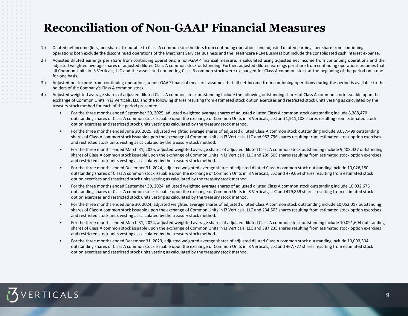 9 1.) Diluted net income (loss) per share attributable to Class A common stockholders from continuing operations and adjusted diluted earnings per share from continuing operations both exclude the discontinued operations of the Merchant Services Business and the Healthcare RCM Business but include the consolidated cash interest expense. 2.) Adjusted diluted earnings per share from continuing operations, a non-GAAP financial measure, is calculated using adjusted net income from continuing operations and the adjusted weighted average shares of adjusted diluted Class A common stock outstanding. Further, adjusted diluted earnings per share from continuing operations assumes that all Common Units in i3 Verticals, LLC and the associated non-voting Class B common stock were exchanged for Class A common stock at the beginning of the period on a one- for-one basis. 3.) Adjusted net income from continuing operations, a non-GAAP financial measure, assumes that all net income from continuing operations during the period is available to the holders of the Company's Class A common stock. 4.) Adjusted weighted average shares of adjusted diluted Class A common stock outstanding include the following outstanding shares of Class A common stock issuable upon the exchange of Common Units in i3 Verticals, LLC and the following shares resulting from estimated stock option exercises and restricted stock units vesting as calculated by the treasury stock method for each of the period presented: • For the three months ended September 30, 2025, adjusted weighted average shares of adjusted diluted Class A common stock outstanding include 8,388,470 outstanding shares of Class A common stock issuable upon the exchange of Common Units in i3 Verticals, LLC and 1,911,108 shares resulting from estimated stock option exercises and restricted stock units vesting as calculated by the treasury stock method. • For the three months ended June 30, 2025, adjusted weighted average shares of adjusted diluted Class A common stock outstanding include 8,637,499 outstanding shares of Class A common stock issuable upon the exchange of Common Units in i3 Verticals, LLC and 952,796 shares resulting from estimated stock option exercises and restricted stock units vesting as calculated by the treasury stock method. • For the three months ended March 31, 2025, adjusted weighted average shares of adjusted diluted Class A common stock outstanding include 9,408,427 outstanding shares of Class A common stock issuable upon the exchange of Common Units in i3 Verticals, LLC and 299,505 shares resulting from estimated stock option exercises and restricted stock units vesting as calculated by the treasury stock method. • For the three months ended December 31, 2024, adjusted weighted average shares of adjusted diluted Class A common stock outstanding include 10,026,180 outstanding shares of Class A common stock issuable upon the exchange of Common Units in i3 Verticals, LLC and 479,664 shares resulting from estimated stock option exercises and restricted stock units vesting as calculated by the treasury stock method. • For the three months ended September 30, 2024, adjusted weighted average shares of adjusted diluted Class A common stock outstanding include 10,032,676 outstanding shares of Class A common stock issuable upon the exchange of Common Units in i3 Verticals, LLC and 479,859 shares resulting from estimated stock option exercises and restricted stock units vesting as calculated by the treasury stock method. • For the three months ended June 30, 2024, adjusted weighted average shares of adjusted diluted Class A common stock outstanding include 10,052,017 outstanding shares of Class A common stock issuable upon the exchange of Common Units in i3 Verticals, LLC and 234,503 shares resulting from estimated stock option exercises and restricted stock units vesting as calculated by the treasury stock method. • For the three months ended March 31, 2024, adjusted weighted average shares of adjusted diluted Class A common stock outstanding include 10,091,604 outstanding shares of Class A common stock issuable upon the exchange of Common Units in i3 Verticals, LLC and 387,235 shares resulting from estimated stock option exercises and restricted stock units vesting as calculated by the treasury stock method. • For the three months ended December 31, 2023, adjusted weighted average shares of adjusted diluted Class A common stock outstanding include 10,093,394 outstanding shares of Class A common stock issuable upon the exchange of Common Units in i3 Verticals, LLC and 467,777 shares resulting from estimated stock option exercises and restricted stock units vesting as calculated by the treasury stock method. Reconciliation of Non-GAAP Financial Measures