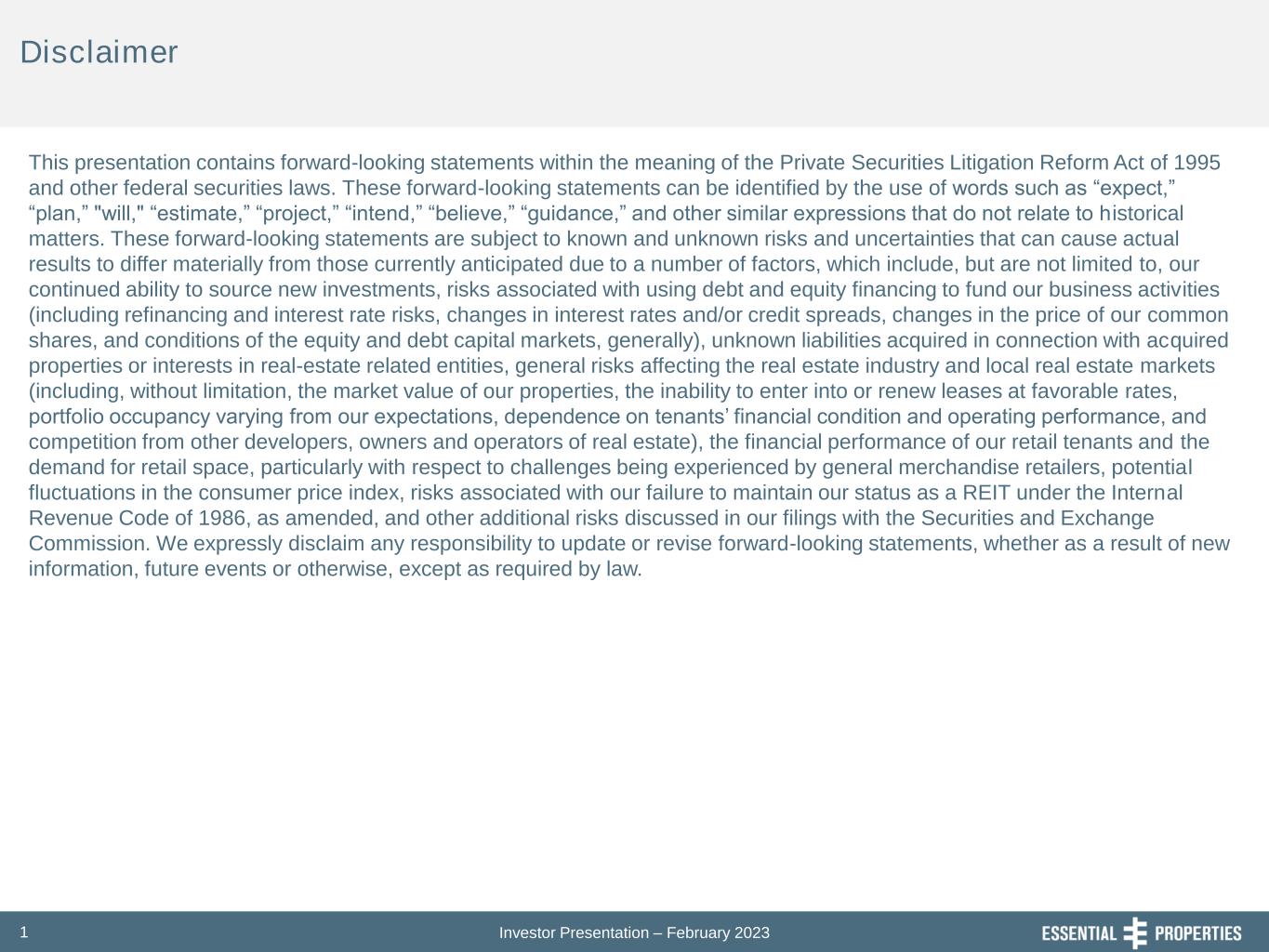 Investor Presentation – February 20231 Disclaimer This presentation contains forward-looking statements within the meaning of the Private Securities Litigation Reform Act of 1995 and other federal securities laws. These forward-looking statements can be identified by the use of words such as “expect,” “plan,” "will," “estimate,” “project,” “intend,” “believe,” “guidance,” and other similar expressions that do not relate to historical matters. These forward-looking statements are subject to known and unknown risks and uncertainties that can cause actual results to differ materially from those currently anticipated due to a number of factors, which include, but are not limited to, our continued ability to source new investments, risks associated with using debt and equity financing to fund our business activities (including refinancing and interest rate risks, changes in interest rates and/or credit spreads, changes in the price of our common shares, and conditions of the equity and debt capital markets, generally), unknown liabilities acquired in connection with acquired properties or interests in real-estate related entities, general risks affecting the real estate industry and local real estate markets (including, without limitation, the market value of our properties, the inability to enter into or renew leases at favorable rates, portfolio occupancy varying from our expectations, dependence on tenants’ financial condition and operating performance, and competition from other developers, owners and operators of real estate), the financial performance of our retail tenants and the demand for retail space, particularly with respect to challenges being experienced by general merchandise retailers, potential fluctuations in the consumer price index, risks associated with our failure to maintain our status as a REIT under the Internal Revenue Code of 1986, as amended, and other additional risks discussed in our filings with the Securities and Exchange Commission. We expressly disclaim any responsibility to update or revise forward-looking statements, whether as a result of new information, future events or otherwise, except as required by law.
