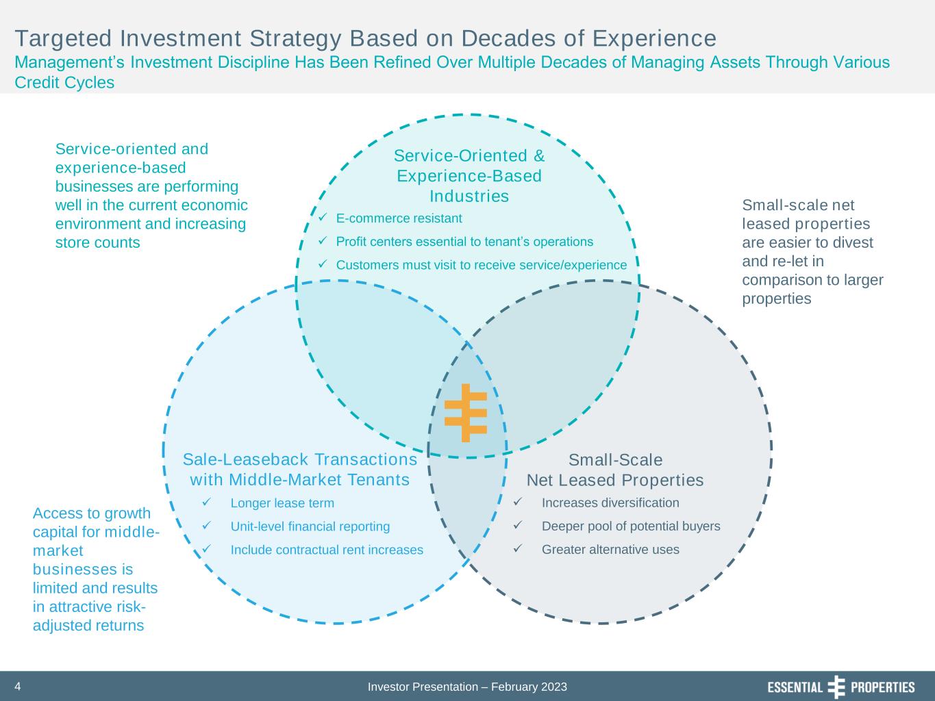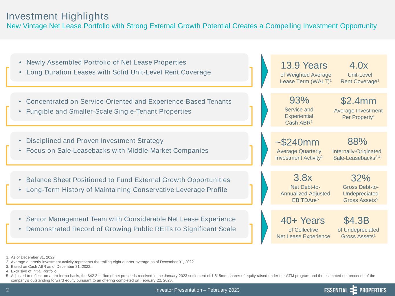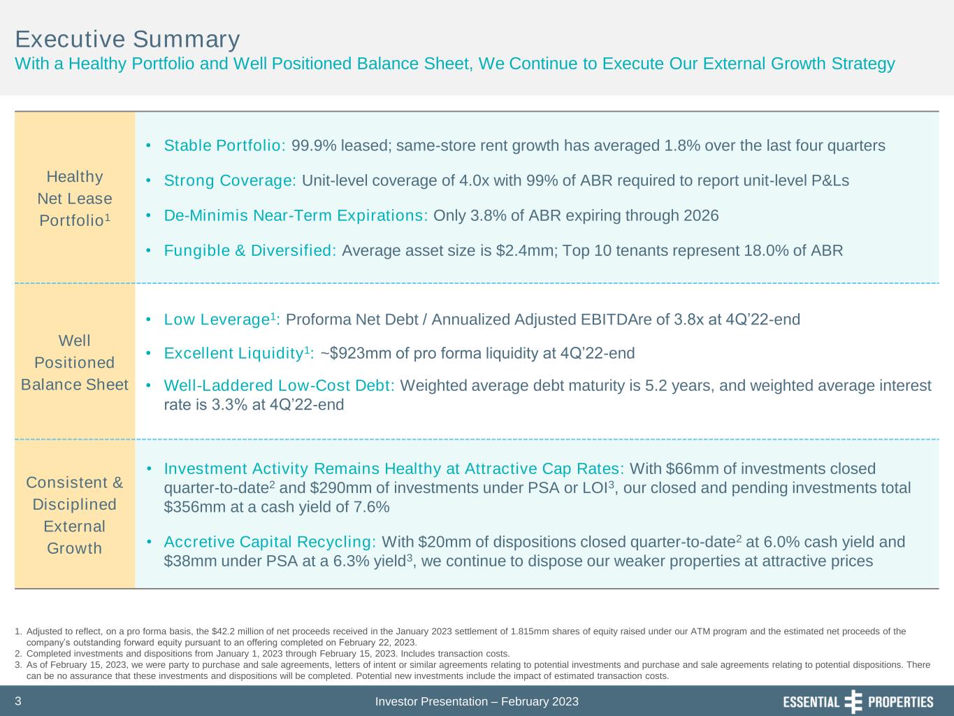 Investor Presentation – February 20232 Investment Highlights • Newly Assembled Portfolio of Net Lease Properties • Long Duration Leases with Solid Unit-Level Rent Coverage • Concentrated on Service-Oriented and Experience-Based Tenants • Fungible and Smaller-Scale Single-Tenant Properties • Disciplined and Proven Investment Strategy • Focus on Sale-Leasebacks with Middle-Market Companies • Balance Sheet Positioned to Fund External Growth Opportunities • Long-Term History of Maintaining Conservative Leverage Profile • Senior Management Team with Considerable Net Lease Experience • Demonstrated Record of Growing Public REITs to Significant Scale Service and Experiential Cash ABR1 93% Average Investment Per Property1 $2.4mm Internally-Originated Sale-Leasebacks3,4 88% Average Quarterly Investment Activity2 ~$240mm 1. As of December 31, 2022. 2. Average quarterly investment activity represents the trailing eight quarter average as of December 31, 2022. 3. Based on Cash ABR as of December 31, 2022. 4. Exclusive of Initial Portfolio. 5. Adjusted to reflect, on a pro forma basis, the $42.2 million of net proceeds received in the January 2023 settlement of 1.815mm shares of equity raised under our ATM program and the estimated net proceeds of the company’s outstanding forward equity pursuant to an offering completed on February 22, 2023. Unit-Level Rent Coverage1 4.0x of Weighted Average Lease Term (WALT)1 13.9 Years of Collective Net Lease Experience 40+ Years New Vintage Net Lease Portfolio with Strong External Growth Potential Creates a Compelling Investment Opportunity Net Debt-to- Annualized Adjusted EBITDAre5 3.8x Gross Debt-to- Undepreciated Gross Assets5 32% of Undepreciated Gross Assets1 $4.3B