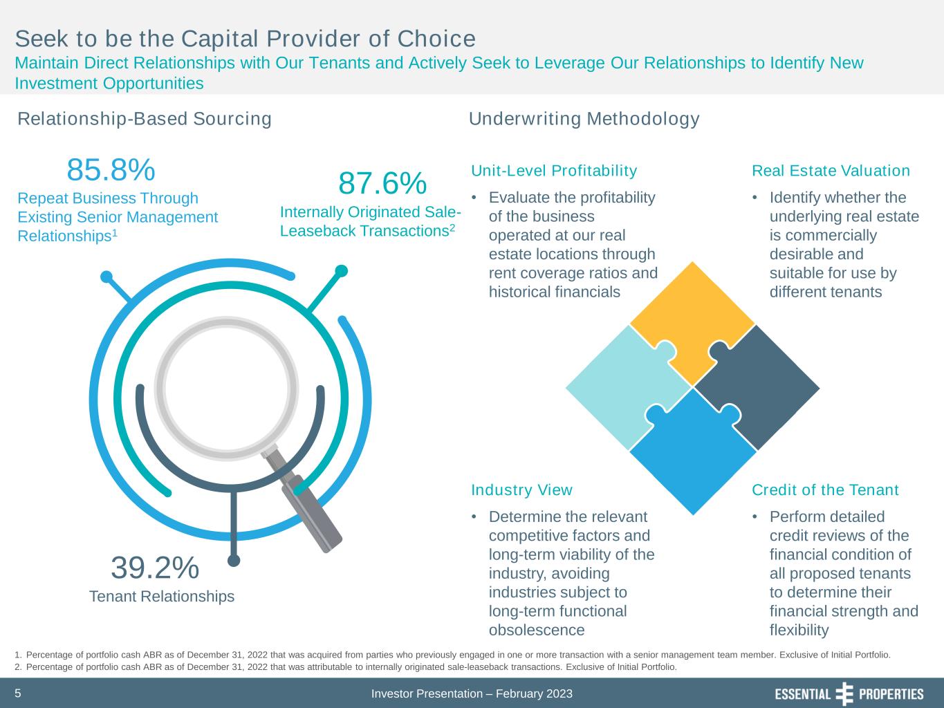 Investor Presentation – February 20234 Service-Oriented & Experience-Based Industries Sale-Leaseback Transactions with Middle-Market Tenants Small-Scale Net Leased Properties ✓ E-commerce resistant ✓ Profit centers essential to tenant’s operations ✓ Customers must visit to receive service/experience ✓ Longer lease term ✓ Unit-level financial reporting ✓ Include contractual rent increases ✓ Increases diversification ✓ Deeper pool of potential buyers ✓ Greater alternative uses Small-scale net leased properties are easier to divest and re-let in comparison to larger properties Service-oriented and experience-based businesses are performing well in the current economic environment and increasing store counts Targeted Investment Strategy Based on Decades of Experience Management’s Investment Discipline Has Been Refined Over Multiple Decades of Managing Assets Through Various Credit Cycles Access to growth capital for middle- market businesses is limited and results in attractive risk- adjusted returns