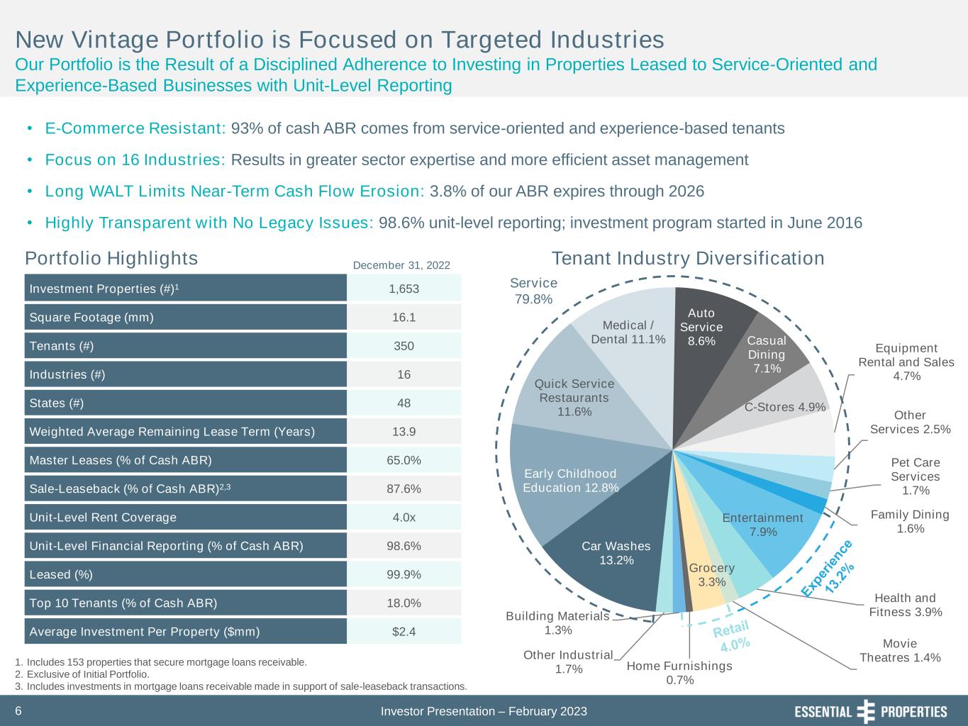 Investor Presentation – February 20235 Seek to be the Capital Provider of Choice Maintain Direct Relationships with Our Tenants and Actively Seek to Leverage Our Relationships to Identify New Investment Opportunities Relationship-Based Sourcing 1. Percentage of portfolio cash ABR as of December 31, 2022 that was acquired from parties who previously engaged in one or more transaction with a senior management team member. Exclusive of Initial Portfolio. 2. Percentage of portfolio cash ABR as of December 31, 2022 that was attributable to internally originated sale-leaseback transactions. Exclusive of Initial Portfolio. Repeat Business Through Existing Senior Management Relationships1 85.8% Internally Originated Sale- Leaseback Transactions2 87.6% Tenant Relationships 39.2% Underwriting Methodology Industry View • Determine the relevant competitive factors and long-term viability of the industry, avoiding industries subject to long-term functional obsolescence Credit of the Tenant • Perform detailed credit reviews of the financial condition of all proposed tenants to determine their financial strength and flexibility Unit-Level Profitability • Evaluate the profitability of the business operated at our real estate locations through rent coverage ratios and historical financials Real Estate Valuation • Identify whether the underlying real estate is commercially desirable and suitable for use by different tenants