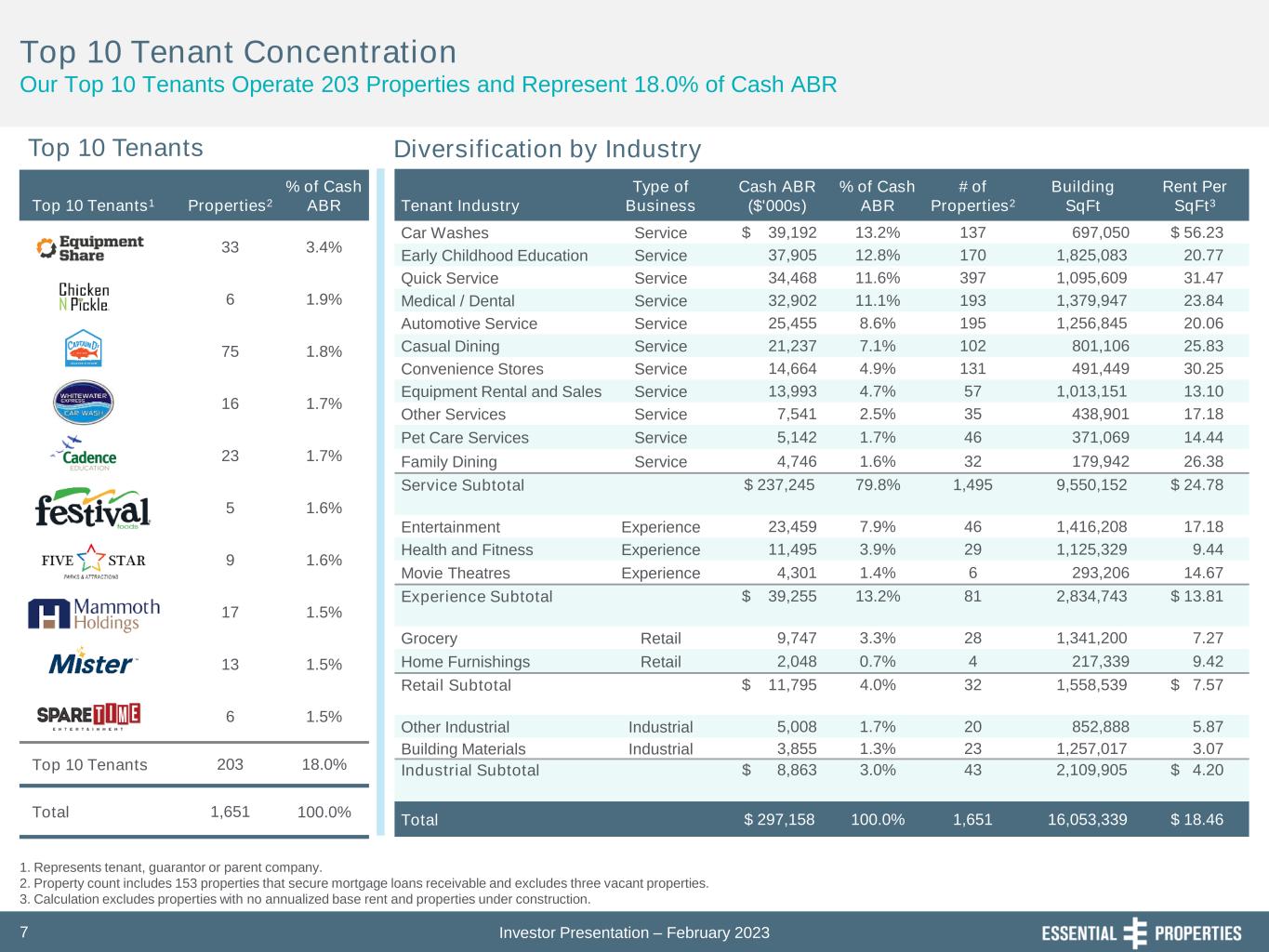 Investor Presentation – February 20236 New Vintage Portfolio is Focused on Targeted Industries Our Portfolio is the Result of a Disciplined Adherence to Investing in Properties Leased to Service-Oriented and Experience-Based Businesses with Unit-Level Reporting Investment Properties (#)1 1,653 Square Footage (mm) 16.1 Tenants (#) 350 Industries (#) 16 States (#) 48 Weighted Average Remaining Lease Term (Years) 13.9 Master Leases (% of Cash ABR) 65.0% Sale-Leaseback (% of Cash ABR)2,3 87.6% Unit-Level Rent Coverage 4.0x Unit-Level Financial Reporting (% of Cash ABR) 98.6% Leased (%) 99.9% Top 10 Tenants (% of Cash ABR) 18.0% Average Investment Per Property ($mm) $2.4 1. Includes 153 properties that secure mortgage loans receivable. 2. Exclusive of Initial Portfolio. 3. Includes investments in mortgage loans receivable made in support of sale-leaseback transactions. Portfolio Highlights December 31, 2022 Tenant Industry Diversification • E-Commerce Resistant: 93% of cash ABR comes from service-oriented and experience-based tenants • Focus on 16 Industries: Results in greater sector expertise and more efficient asset management • Long WALT Limits Near-Term Cash Flow Erosion: 3.8% of our ABR expires through 2026 • Highly Transparent with No Legacy Issues: 98.6% unit-level reporting; investment program started in June 2016 Car Washes 13.2% Early Childhood Education 12.8% Quick Service Restaurants 11.6% Medical / Dental 11.1% Auto Service 8.6% Casual Dining 7.1% C-Stores 4.9% Equipment Rental and Sales 4.7% Other Services 2.5% Pet Care Services 1.7% Family Dining 1.6% Entertainment 7.9% Health and Fitness 3.9% Movie Theatres 1.4% Grocery 3.3% Home Furnishings 0.7% Building Materials 1.3% Other Industrial 1.7% Service 79.8%