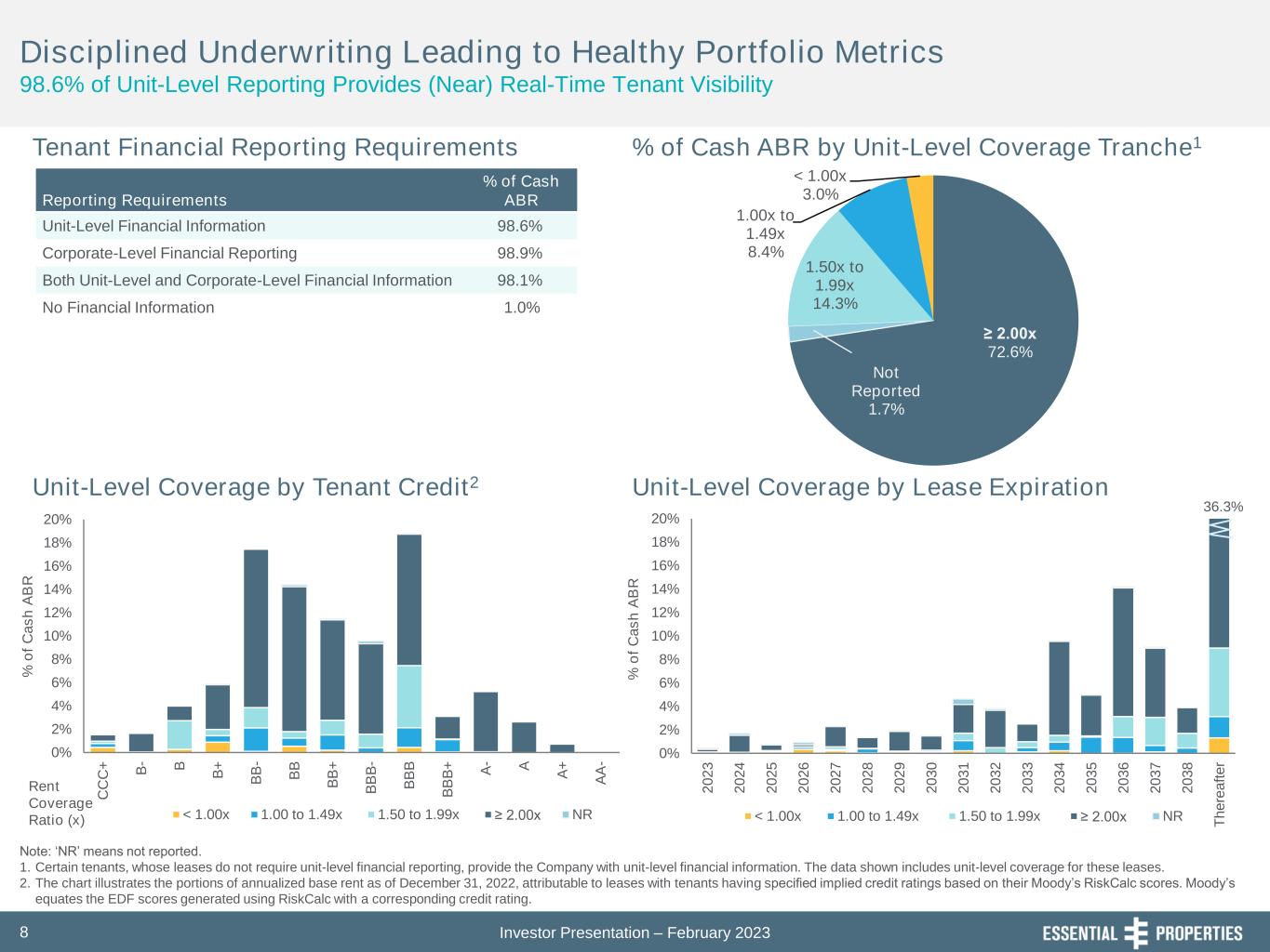 Investor Presentation – February 20237 Top 10 Tenant Concentration Our Top 10 Tenants Operate 203 Properties and Represent 18.0% of Cash ABR Diversification by Industry 1. Represents tenant, guarantor or parent company. 2. Property count includes 153 properties that secure mortgage loans receivable and excludes three vacant properties. 3. Calculation excludes properties with no annualized base rent and properties under construction. Tenant Industry Type of Business Cash ABR ($'000s) % of Cash ABR # of Properties2 Building SqFt Rent Per SqFt3 Car Washes Service $ 39,192 13.2% 137 697,050 $ 56.23 Early Childhood Education Service 37,905 12.8% 170 1,825,083 20.77 Quick Service Service 34,468 11.6% 397 1,095,609 31.47 Medical / Dental Service 32,902 11.1% 193 1,379,947 23.84 Automotive Service Service 25,455 8.6% 195 1,256,845 20.06 Casual Dining Service 21,237 7.1% 102 801,106 25.83 Convenience Stores Service 14,664 4.9% 131 491,449 30.25 Equipment Rental and Sales Service 13,993 4.7% 57 1,013,151 13.10 Other Services Service 7,541 2.5% 35 438,901 17.18 Pet Care Services Service 5,142 1.7% 46 371,069 14.44 Family Dining Service 4,746 1.6% 32 179,942 26.38 Service Subtotal $ 237,245 79.8% 1,495 9,550,152 $ 24.78 Entertainment Experience 23,459 7.9% 46 1,416,208 17.18 Health and Fitness Experience 11,495 3.9% 29 1,125,329 9.44 Movie Theatres Experience 4,301 1.4% 6 293,206 14.67 Experience Subtotal $ 39,255 13.2% 81 2,834,743 $ 13.81 Grocery Retail 9,747 3.3% 28 1,341,200 7.27 Home Furnishings Retail 2,048 0.7% 4 217,339 9.42 Retail Subtotal $ 11,795 4.0% 32 1,558,539 $ 7.57 Other Industrial Industrial 5,008 1.7% 20 852,888 5.87 Building Materials Industrial 3,855 1.3% 23 1,257,017 3.07 Industrial Subtotal $ 8,863 3.0% 43 2,109,905 $ 4.20 Total $ 297,158 100.0% 1,651 16,053,339 $ 18.46 Top 10 Tenants1 Properties2 % of Cash ABR 33 3.4% 6 1.9% 75 1.8% 16 1.7% 23 1.7% 5 1.6% 9 1.6% 17 1.5% 13 1.5% 6 1.5% Top 10 Tenants 203 18.0% Total 1,651 100.0% Top 10 Tenants