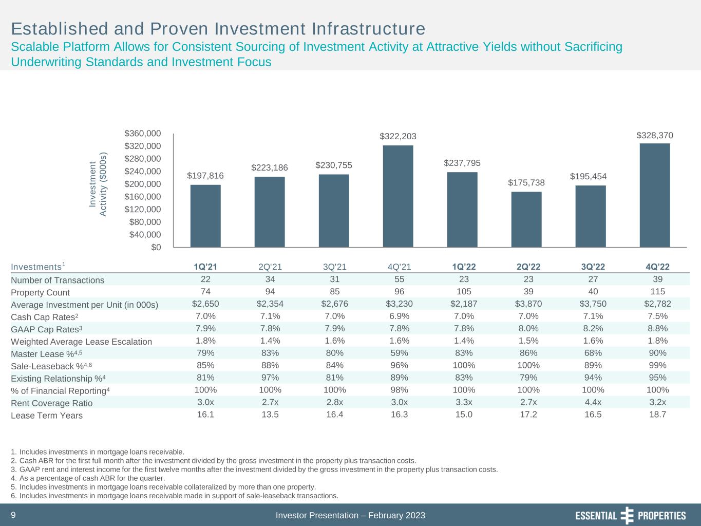 Investor Presentation – February 20238 Disciplined Underwriting Leading to Healthy Portfolio Metrics 98.6% of Unit-Level Reporting Provides (Near) Real-Time Tenant Visibility 0% 2% 4% 6% 8% 10% 12% 14% 16% 18% 20% C C C + B - B B + B B - B B B B + B B B - B B B B B B + A - A A + A A - % o f C a s h A B R < 1.00x 1.00 to 1.49x 1.50 to 1.99x ≥ 2.00x NR Tenant Financial Reporting Requirements % of Cash ABR by Unit-Level Coverage Tranche1 Unit-Level Coverage by Lease ExpirationUnit-Level Coverage by Tenant Credit2 Note: ‘NR’ means not reported. 1. Certain tenants, whose leases do not require unit-level financial reporting, provide the Company with unit-level financial information. The data shown includes unit-level coverage for these leases. 2. The chart illustrates the portions of annualized base rent as of December 31, 2022, attributable to leases with tenants having specified implied credit ratings based on their Moody’s RiskCalc scores. Moody’s equates the EDF scores generated using RiskCalc with a corresponding credit rating. Reporting Requirements % of Cash ABR Unit-Level Financial Information 98.6% Corporate-Level Financial Reporting 98.9% Both Unit-Level and Corporate-Level Financial Information 98.1% No Financial Information 1.0% Rent Coverage Ratio (x) Rent Coverage Ratio (x) ≥ 2.00x 72.6% Not Reported 1.7% 1.50x to 1.99x 14.3% 1.00x to 1.49x 8.4% < 1.00x 3.0% 0% 2% 4% 6% 8% 10% 12% 14% 16% 18% 20% 2 0 2 3 2 0 2 4 2 0 2 5 2 0 2 6 2 0 2 7 2 0 2 8 2 0 2 9 2 0 3 0 2 0 3 1 2 0 3 2 2 0 3 3 2 0 3 4 2 0 3 5 2 0 3 6 2 0 3 7 2 0 3 8 T h e re a ft e r % o f C a s h A B R < 1.00x 1.00 to 1.49x 1.50 to 1.99x ≥ 2.00x NR 36.3%