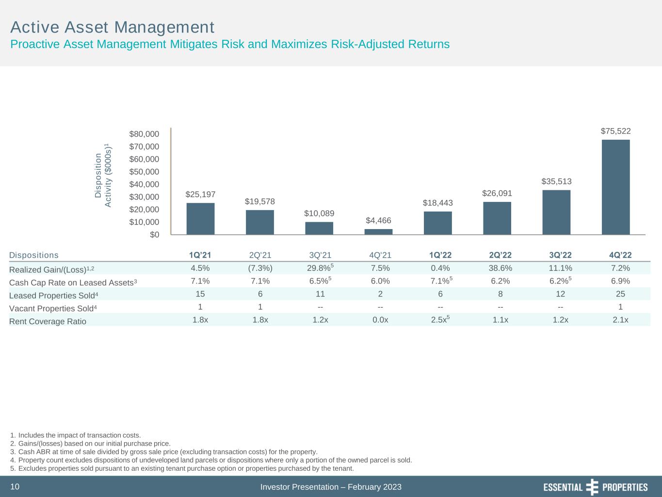 Investor Presentation – February 20239 Established and Proven Investment Infrastructure Scalable Platform Allows for Consistent Sourcing of Investment Activity at Attractive Yields without Sacrificing Underwriting Standards and Investment Focus $197,816 $223,186 $230,755 $322,203 $237,795 $175,738 $195,454 $328,370 $0 $40,000 $80,000 $120,000 $160,000 $200,000 $240,000 $280,000 $320,000 $360,000 In v e s tm e n t A c ti v it y ( $ 0 0 0 s ) 1. Includes investments in mortgage loans receivable. 2. Cash ABR for the first full month after the investment divided by the gross investment in the property plus transaction costs. 3. GAAP rent and interest income for the first twelve months after the investment divided by the gross investment in the property plus transaction costs. 4. As a percentage of cash ABR for the quarter. 5. Includes investments in mortgage loans receivable collateralized by more than one property. 6. Includes investments in mortgage loans receivable made in support of sale-leaseback transactions. Investments1 1Q’21 2Q'21 3Q'21 4Q'21 1Q’22 2Q’22 3Q’22 4Q’22 Number of Transactions 22 34 31 55 23 23 27 39 Property Count 74 94 85 96 105 39 40 115 Average Investment per Unit (in 000s) $2,650 $2,354 $2,676 $3,230 $2,187 $3,870 $3,750 $2,782 Cash Cap Rates2 7.0% 7.1% 7.0% 6.9% 7.0% 7.0% 7.1% 7.5% GAAP Cap Rates3 7.9% 7.8% 7.9% 7.8% 7.8% 8.0% 8.2% 8.8% Weighted Average Lease Escalation 1.8% 1.4% 1.6% 1.6% 1.4% 1.5% 1.6% 1.8% Master Lease %4,5 79% 83% 80% 59% 83% 86% 68% 90% Sale-Leaseback %4,6 85% 88% 84% 96% 100% 100% 89% 99% Existing Relationship %4 81% 97% 81% 89% 83% 79% 94% 95% % of Financial Reporting4 100% 100% 100% 98% 100% 100% 100% 100% Rent Coverage Ratio 3.0x 2.7x 2.8x 3.0x 3.3x 2.7x 4.4x 3.2x Lease Term Years 16.1 13.5 16.4 16.3 15.0 17.2 16.5 18.7