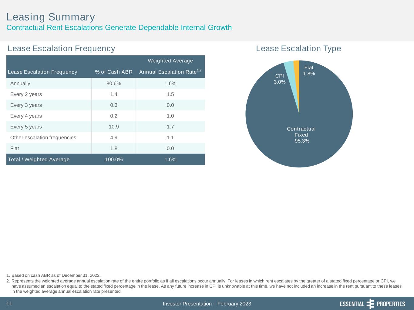 Investor Presentation – February 202310 Active Asset Management Proactive Asset Management Mitigates Risk and Maximizes Risk-Adjusted Returns 1. Includes the impact of transaction costs. 2. Gains/(losses) based on our initial purchase price. 3. Cash ABR at time of sale divided by gross sale price (excluding transaction costs) for the property. 4. Property count excludes dispositions of undeveloped land parcels or dispositions where only a portion of the owned parcel is sold. 5. Excludes properties sold pursuant to an existing tenant purchase option or properties purchased by the tenant. Dispositions 1Q’21 2Q'21 3Q'21 4Q'21 1Q’22 2Q’22 3Q’22 4Q’22 Realized Gain/(Loss)1,2 4.5% (7.3%) 29.8%5 7.5% 0.4% 38.6% 11.1% 7.2% Cash Cap Rate on Leased Assets3 7.1% 7.1% 6.5%5 6.0% 7.1%5 6.2% 6.2%5 6.9% Leased Properties Sold4 15 6 11 2 6 8 12 25 Vacant Properties Sold4 1 1 -- -- -- -- -- 1 Rent Coverage Ratio 1.8x 1.8x 1.2x 0.0x 2.5x5 1.1x 1.2x 2.1x $25,197 $19,578 $10,089 $4,466 $18,443 $26,091 $35,513 $75,522 $0 $10,000 $20,000 $30,000 $40,000 $50,000 $60,000 $70,000 $80,000 D is p o s it io n A c ti v it y ( $ 0 0 0 s )1