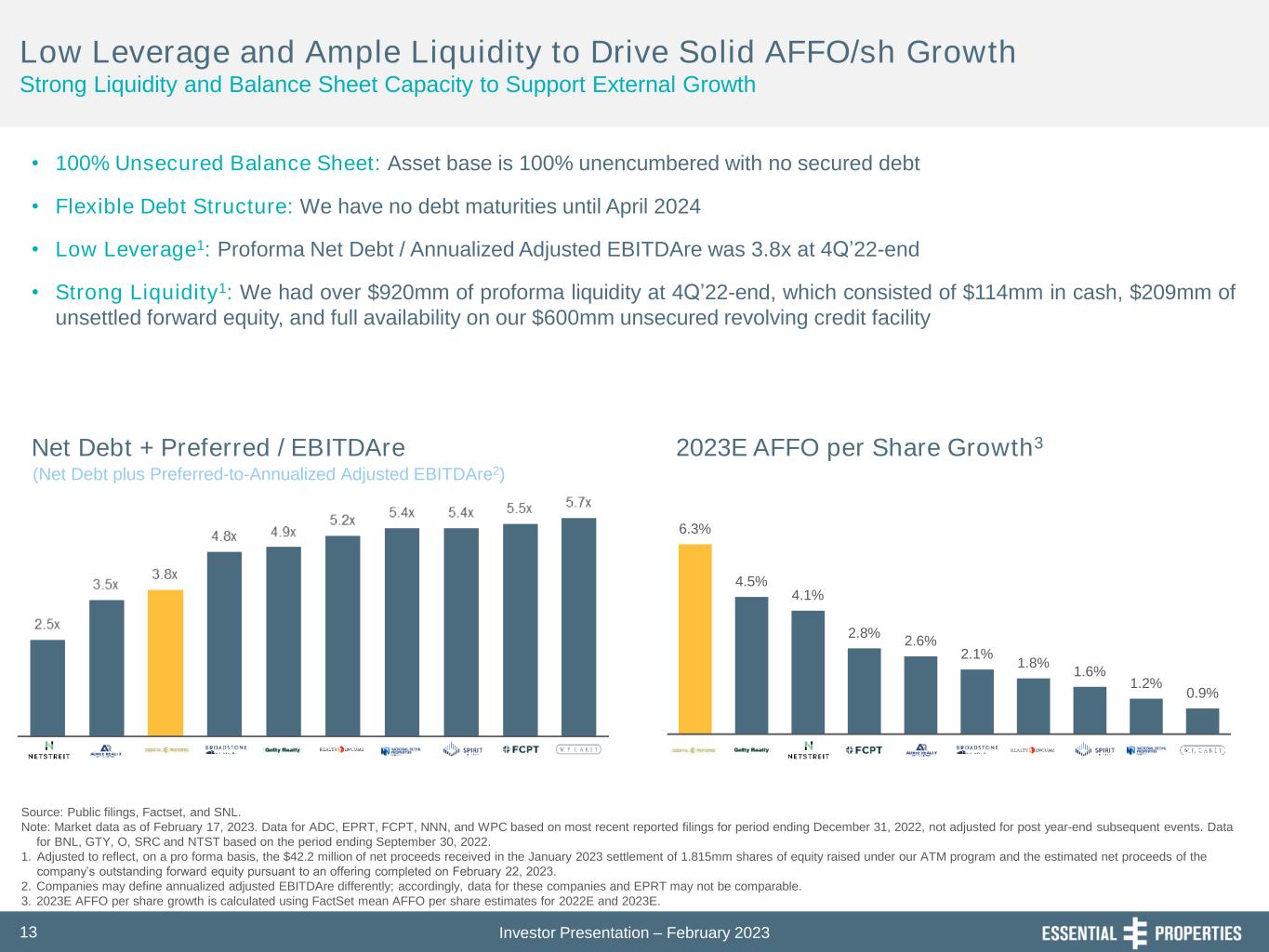 Investor Presentation – February 202312 $600 $200 $430 $400 $400 0 100 200 300 400 500 600 2022 2023 2024 2025 2026 2027 2028 2029 2030 2031 M a tu ri n g P ri n c ip a l B a la n c e ( $ m m ) Revolving Credit Facility Availability 2024 Unsecured Term Loan 2027 Unsecured Term Loan Public Unsecured Bonds 2028 Unsecured Term Loan Flexible Debt Structure No Debt Maturities Until 2024 Debt Maturity Schedule • Well-Laddered Debt Maturities: Weighted average debt maturity is 5.2 years • Low-Cost Debt: Weighted average interest rate is 3.3%