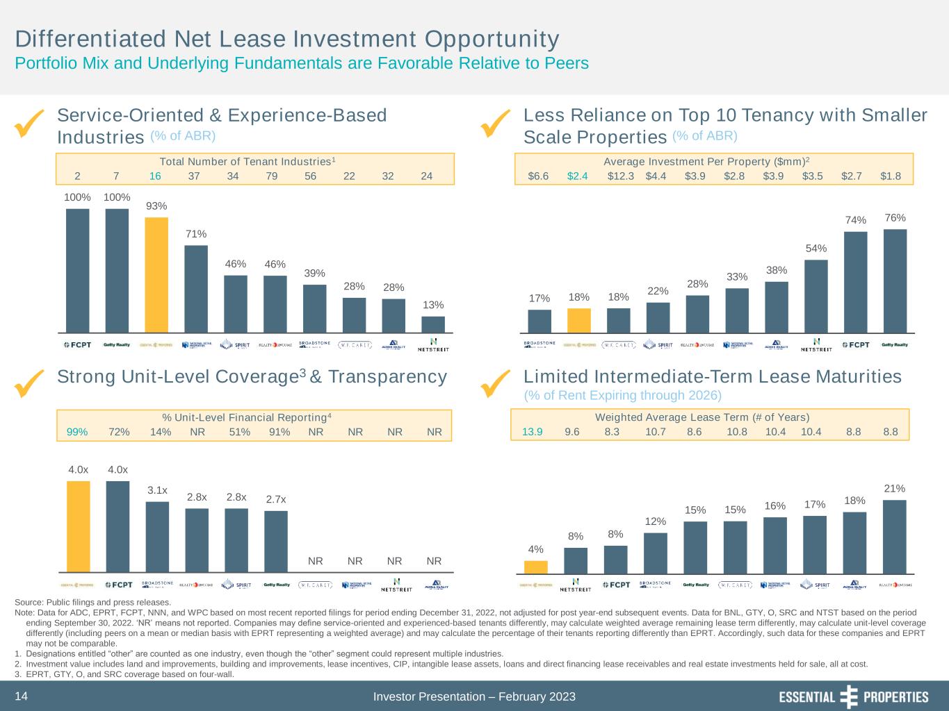 Investor Presentation – February 202313 6.3% 4.5% 4.1% 2.8% 2.6% 2.1% 1.8% 1.6% 1.2% 0.9% Low Leverage and Ample Liquidity to Drive Solid AFFO/sh Growth Strong Liquidity and Balance Sheet Capacity to Support External Growth • 100% Unsecured Balance Sheet: Asset base is 100% unencumbered with no secured debt • Flexible Debt Structure: We have no debt maturities until April 2024 • Low Leverage1: Proforma Net Debt / Annualized Adjusted EBITDAre was 3.8x at 4Q’22-end • Strong Liquidity1: We had over $920mm of proforma liquidity at 4Q’22-end, which consisted of $114mm in cash, $209mm of unsettled forward equity, and full availability on our $600mm unsecured revolving credit facility Net Debt + Preferred / EBITDAre (Net Debt plus Preferred-to-Annualized Adjusted EBITDAre2) 2023E AFFO per Share Growth3 Source: Public filings, Factset, and SNL. Note: Market data as of February 17, 2023. Data for ADC, EPRT, FCPT, NNN, and WPC based on most recent reported filings for period ending December 31, 2022, not adjusted for post year-end subsequent events. Data for BNL, GTY, O, SRC and NTST based on the period ending September 30, 2022. 1. Adjusted to reflect, on a pro forma basis, the $42.2 million of net proceeds received in the January 2023 settlement of 1.815mm shares of equity raised under our ATM program and the estimated net proceeds of the company’s outstanding forward equity pursuant to an offering completed on February 22, 2023. 2. Companies may define annualized adjusted EBITDAre differently; accordingly, data for these companies and EPRT may not be comparable. 3. 2023E AFFO per share growth is calculated using FactSet mean AFFO per share estimates for 2022E and 2023E. 5.0% 4.1% 4.0% 2.6% 2.6% .9% 1.5% 1.3% 1.2% 0.7%