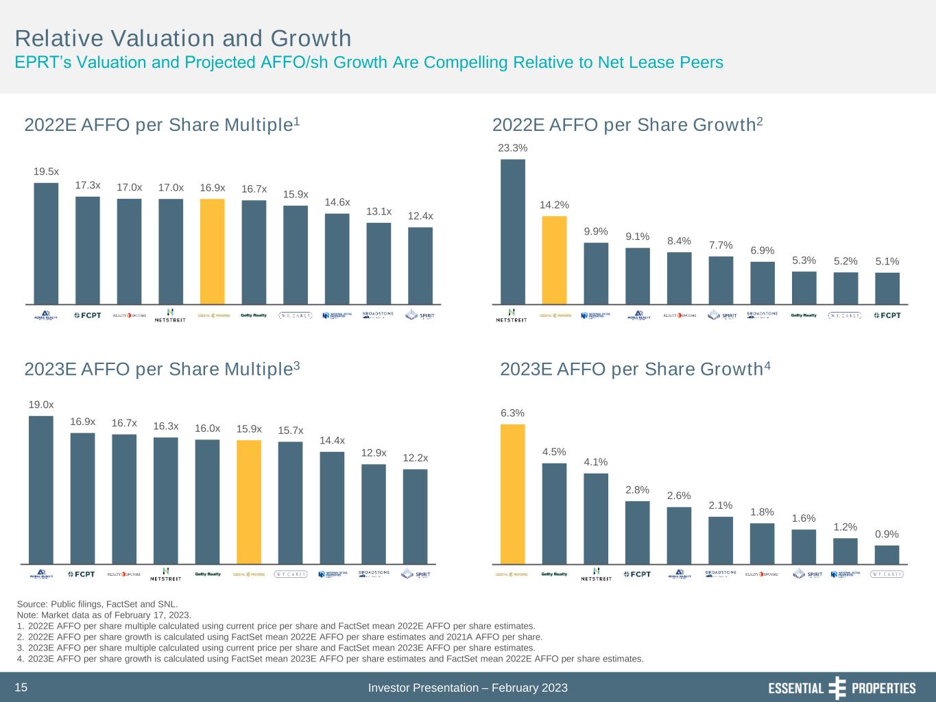 Investor Presentation – February 202314 4% 8% 8% 12% 15% 15% 16% 17% 18% 21% 76% 74% 54% 38% 33% 28% 22% 18% 18% 17% 4.0x 4.0x 3.1x 2.8x 2.8x 2.7x NR NR NR NR EPRT FCPT BNL O SRC GTY WPC ADC NNN NTST 100% 100% 93% 71% 46% 46% 39% 28% 28% 13% FCPT GTY EPRT NNN SRC O BNL WPC ADC NTST Differentiated Net Lease Investment Opportunity Portfolio Mix and Underlying Fundamentals are Favorable Relative to Peers Strong Unit-Level Coverage3 & Transparency Service-Oriented & Experience-Based Industries Limited Intermediate-Term Lease Maturities ✓ ✓✓ Source: Public filings and press releases. Note: Data for ADC, EPRT, FCPT, NNN, and WPC based on most recent reported filings for period ending December 31, 2022, not adjusted for post year-end subsequent events. Data for BNL, GTY, O, SRC and NTST based on the period ending September 30, 2022. ‘NR’ means not reported. Companies may define service-oriented and experienced-based tenants differently, may calculate weighted average remaining lease term differently, may calculate unit-level coverage differently (including peers on a mean or median basis with EPRT representing a weighted average) and may calculate the percentage of their tenants reporting differently than EPRT. Accordingly, such data for these companies and EPRT may not be comparable. 1. Designations entitled “other” are counted as one industry, even though the “other” segment could represent multiple industries. 2. Investment value includes land and improvements, building and improvements, lease incentives, CIP, intangible lease assets, loans and direct financing lease receivables and real estate investments held for sale, all at cost. 3. EPRT, GTY, O, and SRC coverage based on four-wall. (% of ABR) (% of Rent Expiring through 2026) Less Reliance on Top 10 Tenancy with Smaller Scale Properties✓ (% of ABR) 2 Total Number of Tenant Industries1 7 16 37 34 79 56 22 32 24 99% % Unit-Level Financial Reporting4 14% NR 51% 91% NR NR72% NR NR $6.6 Average Investment Per Property ($mm)2 $2.4 $12.3 $4.4 $3.9 $2.8 $3.9 $3.5 $2.7 $1.8 13.9 Weighted Average Lease Term (# of Years) 9.6 8.3 10.7 8.6 10.8 10.4 10.4 8.8 8.8