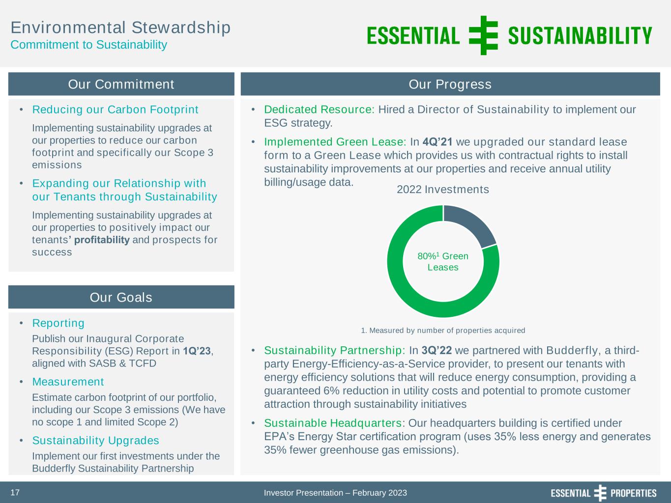 Investor Presentation – February 202317 Our Commitment Our Progress Our Goals • Reducing our Carbon Footprint Implementing sustainability upgrades at our properties to reduce our carbon footprint and specifically our Scope 3 emissions • Expanding our Relationship with our Tenants through Sustainability Implementing sustainability upgrades at our properties to positively impact our tenants’ profitability and prospects for success • Dedicated Resource: Hired a Director of Sustainability to implement our ESG strategy. • Implemented Green Lease: In 4Q’21 we upgraded our standard lease form to a Green Lease which provides us with contractual rights to install sustainability improvements at our properties and receive annual utility billing/usage data. • Sustainability Partnership: In 3Q’22 we partnered with Budderfly, a third- party Energy-Efficiency-as-a-Service provider, to present our tenants with energy efficiency solutions that will reduce energy consumption, providing a guaranteed 6% reduction in utility costs and potential to promote customer attraction through sustainability initiatives • Sustainable Headquarters: Our headquarters building is certified under EPA’s Energy Star certification program (uses 35% less energy and generates 35% fewer greenhouse gas emissions). • Reporting Publish our Inaugural Corporate Responsibility (ESG) Report in 1Q’23, aligned with SASB & TCFD • Measurement Estimate carbon footprint of our portfolio, including our Scope 3 emissions (We have no scope 1 and limited Scope 2) • Sustainability Upgrades Implement our first investments under the Budderfly Sustainability Partnership 80%1 Green Leases 2022 Investments 1. Measured by number of properties acquired Environmental Stewardship Commitment to Sustainability