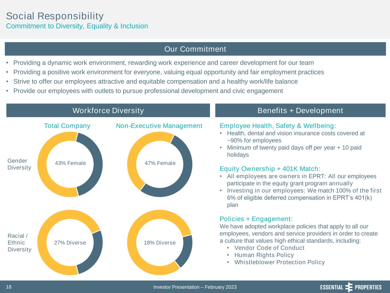 Investor Presentation – February 202318 • Providing a dynamic work environment, rewarding work experience and career development for our team • Providing a positive work environment for everyone, valuing equal opportunity and fair employment practices • Strive to offer our employees attractive and equitable compensation and a healthy work/life balance • Provide our employees with outlets to pursue professional development and civic engagement Racial / Ethnic Diversity 27% Diverse 43% Female 47% Female 18% Diverse Total Company Non-Executive Management Workforce Diversity Gender Diversity Benefits + Development Employee Health, Safety & Wellbeing: • Health, dental and vision insurance costs covered at ~90% for employees • Minimum of twenty paid days off per year + 10 paid holidays Equity Ownership + 401K Match: • All employees are owners in EPRT: All our employees participate in the equity grant program annually • Investing in our employees: We match 100% of the first 6% of eligible deferred compensation in EPRT’s 401(k) plan Policies + Engagement: We have adopted workplace policies that apply to all our employees, vendors and service providers in order to create a culture that values high ethical standards, including: • Vendor Code of Conduct • Human Rights Policy • Whistleblower Protection Policy Our Commitment Social Responsibility Commitment to Diversity, Equality & Inclusion