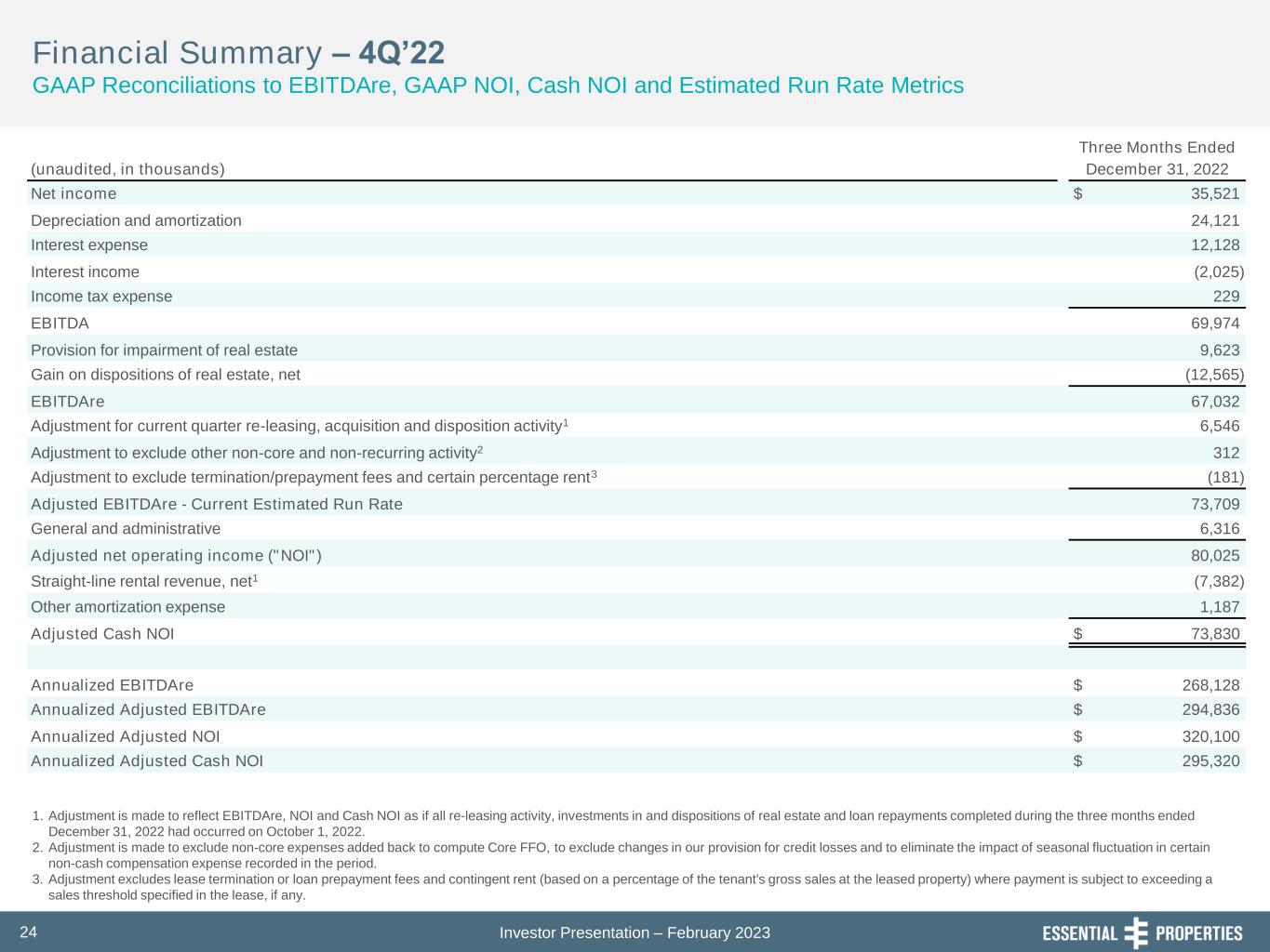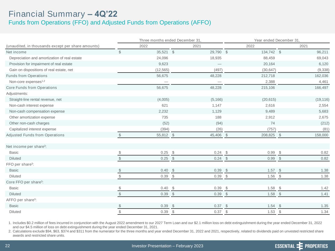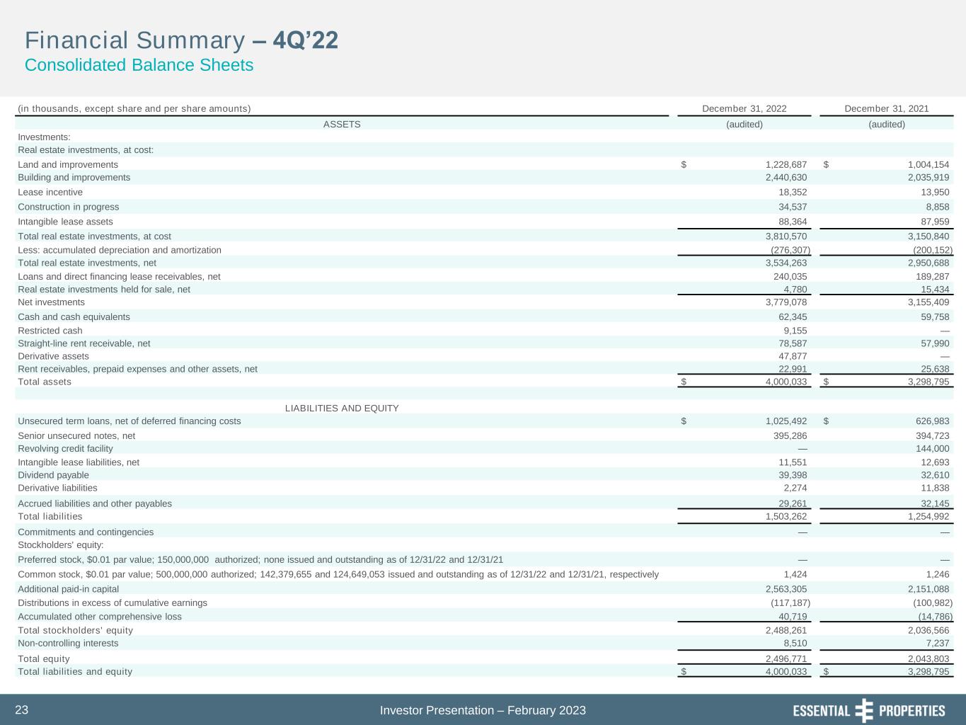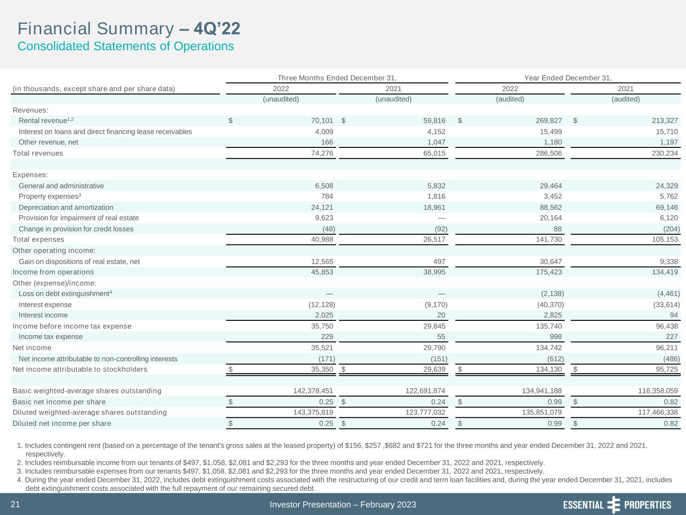 Investor Presentation – February 202321 Financial Summary – 4Q’22 Consolidated Statements of Operations 1. Includes contingent rent (based on a percentage of the tenant's gross sales at the leased property) of $156, $257 ,$682 and $721 for the three months and year ended December 31, 2022 and 2021, respectively. 2. Includes reimbursable income from our tenants of $497, $1,058, $2,081 and $2,293 for the three months and year ended December 31, 2022 and 2021, respectively. 3. Includes reimbursable expenses from our tenants $497, $1,058, $2,081 and $2,293 for the three months and year ended December 31, 2022 and 2021, respectively. 4. During the year ended December 31, 2022, includes debt extinguishment costs associated with the restructuring of our credit and term loan facilities and, during the year ended December 31, 2021, includes debt extinguishment costs associated with the full repayment of our remaining secured debt. Three Months Ended December 31, Year Ended December 31, (in thousands, except share and per share data) 2022 2021 2022 2021 (unaudited) (unaudited) (audited) (audited) Revenues: Rental revenue1,2 $ 70,101 $ 59,816 $ 269,827 $ 213,327 Interest on loans and direct financing lease receivables 4,009 4,152 15,499 15,710 Other revenue, net 166 1,047 1,180 1,197 Total revenues 74,276 65,015 286,506 230,234 Expenses: General and administrative 6,508 5,832 29,464 24,329 Property expenses3 784 1,816 3,452 5,762 Depreciation and amortization 24,121 18,961 88,562 69,146 Provision for impairment of real estate 9,623 — 20,164 6,120 Change in provision for credit losses (48) (92) 88 (204) Total expenses 40,988 26,517 141,730 105,153 Other operating income: Gain on dispositions of real estate, net 12,565 497 30,647 9,338 Income from operations 45,853 38,995 175,423 134,419 Other (expense)/income: Loss on debt extinguishment4 — — (2,138) (4,461) Interest expense (12,128) (9,170) (40,370) (33,614) Interest income 2,025 20 2,825 94 Income before income tax expense 35,750 29,845 135,740 96,438 Income tax expense 229 55 998 227 Net income 35,521 29,790 134,742 96,211 Net income attributable to non-controlling interests (171) (151) (612) (486) Net income attributable to stockholders $ 35,350 $ 29,639 $ 134,130 $ 95,725 Basic weighted-average shares outstanding 142,378,451 122,691,874 134,941,188 116,358,059 Basic net income per share $ 0.25 $ 0.24 $ 0.99 $ 0.82 Diluted weighted-average shares outstanding 143,375,819 123,777,032 135,851,079 117,466,338 Diluted net income per share $ 0.25 $ 0.24 $ 0.99 $ 0.82