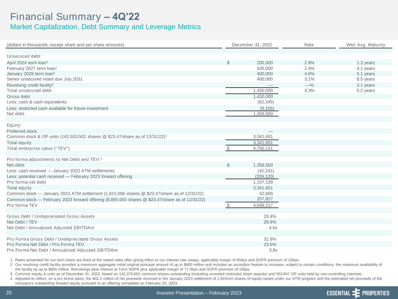 Investor Presentation – February 202324 Financial Summary – 4Q’22 GAAP Reconciliations to EBITDAre, GAAP NOI, Cash NOI and Estimated Run Rate Metrics 1. Adjustment is made to reflect EBITDAre, NOI and Cash NOI as if all re-leasing activity, investments in and dispositions of real estate and loan repayments completed during the three months ended December 31, 2022 had occurred on October 1, 2022. 2. Adjustment is made to exclude non-core expenses added back to compute Core FFO, to exclude changes in our provision for credit losses and to eliminate the impact of seasonal fluctuation in certain non-cash compensation expense recorded in the period. 3. Adjustment excludes lease termination or loan prepayment fees and contingent rent (based on a percentage of the tenant's gross sales at the leased property) where payment is subject to exceeding a sales threshold specified in the lease, if any. Three Months Ended (unaudited, in thousands) December 31, 2022 Net income $ 35,521 Depreciation and amortization 24,121 Interest expense 12,128 Interest income (2,025) Income tax expense 229 EBITDA 69,974 Provision for impairment of real estate 9,623 Gain on dispositions of real estate, net (12,565) EBITDAre 67,032 Adjustment for current quarter re-leasing, acquisition and disposition activity1 6,546 Adjustment to exclude other non-core and non-recurring activity2 312 Adjustment to exclude termination/prepayment fees and certain percentage rent3 (181) Adjusted EBITDAre - Current Estimated Run Rate 73,709 General and administrative 6,316 Adjusted net operating income ("NOI") 80,025 Straight-line rental revenue, net1 (7,382) Other amortization expense 1,187 Adjusted Cash NOI $ 73,830 Annualized EBITDAre $ 268,128 Annualized Adjusted EBITDAre $ 294,836 Annualized Adjusted NOI $ 320,100 Annualized Adjusted Cash NOI $ 295,320