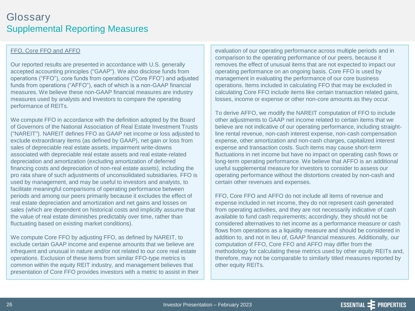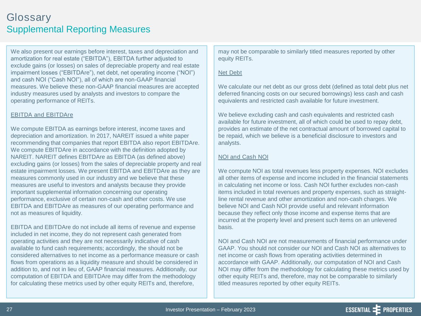 Investor Presentation – February 202326 Glossary Supplemental Reporting Measures FFO, Core FFO and AFFO Our reported results are presented in accordance with U.S. generally accepted accounting principles ("GAAP"). We also disclose funds from operations (“FFO”), core funds from operations (“Core FFO”) and adjusted funds from operations (“AFFO”), each of which is a non-GAAP financial measures. We believe these non-GAAP financial measures are industry measures used by analysts and investors to compare the operating performance of REITs. We compute FFO in accordance with the definition adopted by the Board of Governors of the National Association of Real Estate Investment Trusts ("NAREIT"). NAREIT defines FFO as GAAP net income or loss adjusted to exclude extraordinary items (as defined by GAAP), net gain or loss from sales of depreciable real estate assets, impairment write-downs associated with depreciable real estate assets and real estate-related depreciation and amortization (excluding amortization of deferred financing costs and depreciation of non-real estate assets), including the pro rata share of such adjustments of unconsolidated subsidiaries. FFO is used by management, and may be useful to investors and analysts, to facilitate meaningful comparisons of operating performance between periods and among our peers primarily because it excludes the effect of real estate depreciation and amortization and net gains and losses on sales (which are dependent on historical costs and implicitly assume that the value of real estate diminishes predictably over time, rather than fluctuating based on existing market conditions). We compute Core FFO by adjusting FFO, as defined by NAREIT, to exclude certain GAAP income and expense amounts that we believe are infrequent and unusual in nature and/or not related to our core real estate operations. Exclusion of these items from similar FFO-type metrics is common within the equity REIT industry, and management believes that presentation of Core FFO provides investors with a metric to assist in their evaluation of our operating performance across multiple periods and in comparison to the operating performance of our peers, because it removes the effect of unusual items that are not expected to impact our operating performance on an ongoing basis. Core FFO is used by management in evaluating the performance of our core business operations. Items included in calculating FFO that may be excluded in calculating Core FFO include items like certain transaction related gains, losses, income or expense or other non-core amounts as they occur. To derive AFFO, we modify the NAREIT computation of FFO to include other adjustments to GAAP net income related to certain items that we believe are not indicative of our operating performance, including straight- line rental revenue, non-cash interest expense, non-cash compensation expense, other amortization and non-cash charges, capitalized interest expense and transaction costs. Such items may cause short-term fluctuations in net income but have no impact on operating cash flows or long-term operating performance. We believe that AFFO is an additional useful supplemental measure for investors to consider to assess our operating performance without the distortions created by non-cash and certain other revenues and expenses. FFO, Core FFO and AFFO do not include all items of revenue and expense included in net income, they do not represent cash generated from operating activities, and they are not necessarily indicative of cash available to fund cash requirements; accordingly, they should not be considered alternatives to net income as a performance measure or cash flows from operations as a liquidity measure and should be considered in addition to, and not in lieu of, GAAP financial measures. Additionally, our computation of FFO, Core FFO and AFFO may differ from the methodology for calculating these metrics used by other equity REITs and, therefore, may not be comparable to similarly titled measures reported by other equity REITs.