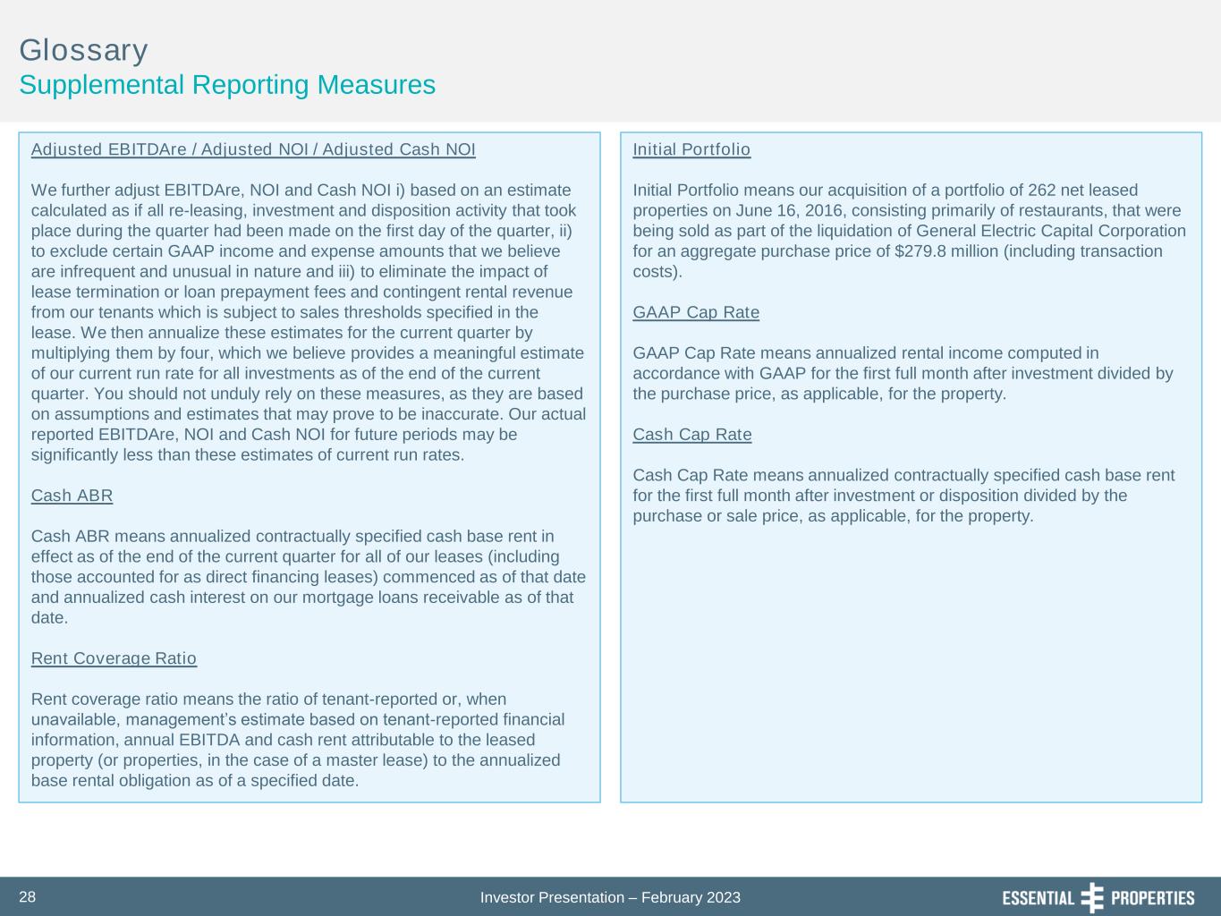 Investor Presentation – February 202327 Glossary Supplemental Reporting Measures We also present our earnings before interest, taxes and depreciation and amortization for real estate (“EBITDA”), EBITDA further adjusted to exclude gains (or losses) on sales of depreciable property and real estate impairment losses (“EBITDAre”), net debt, net operating income (“NOI”) and cash NOI (“Cash NOI”), all of which are non-GAAP financial measures. We believe these non-GAAP financial measures are accepted industry measures used by analysts and investors to compare the operating performance of REITs. EBITDA and EBITDAre We compute EBITDA as earnings before interest, income taxes and depreciation and amortization. In 2017, NAREIT issued a white paper recommending that companies that report EBITDA also report EBITDAre. We compute EBITDAre in accordance with the definition adopted by NAREIT. NAREIT defines EBITDAre as EBITDA (as defined above) excluding gains (or losses) from the sales of depreciable property and real estate impairment losses. We present EBITDA and EBITDAre as they are measures commonly used in our industry and we believe that these measures are useful to investors and analysts because they provide important supplemental information concerning our operating performance, exclusive of certain non-cash and other costs. We use EBITDA and EBITDAre as measures of our operating performance and not as measures of liquidity. EBITDA and EBITDAre do not include all items of revenue and expense included in net income, they do not represent cash generated from operating activities and they are not necessarily indicative of cash available to fund cash requirements; accordingly, the should not be considered alternatives to net income as a performance measure or cash flows from operations as a liquidity measure and should be considered in addition to, and not in lieu of, GAAP financial measures. Additionally, our computation of EBITDA and EBITDAre may differ from the methodology for calculating these metrics used by other equity REITs and, therefore, may not be comparable to similarly titled measures reported by other equity REITs. Net Debt We calculate our net debt as our gross debt (defined as total debt plus net deferred financing costs on our secured borrowings) less cash and cash equivalents and restricted cash available for future investment. We believe excluding cash and cash equivalents and restricted cash available for future investment, all of which could be used to repay debt, provides an estimate of the net contractual amount of borrowed capital to be repaid, which we believe is a beneficial disclosure to investors and analysts. NOI and Cash NOI We compute NOI as total revenues less property expenses. NOI excludes all other items of expense and income included in the financial statements in calculating net income or loss. Cash NOI further excludes non-cash items included in total revenues and property expenses, such as straight- line rental revenue and other amortization and non-cash charges. We believe NOI and Cash NOI provide useful and relevant information because they reflect only those income and expense items that are incurred at the property level and present such items on an unlevered basis. NOI and Cash NOI are not measurements of financial performance under GAAP. You should not consider our NOI and Cash NOI as alternatives to net income or cash flows from operating activities determined in accordance with GAAP. Additionally, our computation of NOI and Cash NOI may differ from the methodology for calculating these metrics used by other equity REITs and, therefore, may not be comparable to similarly titled measures reported by other equity REITs.