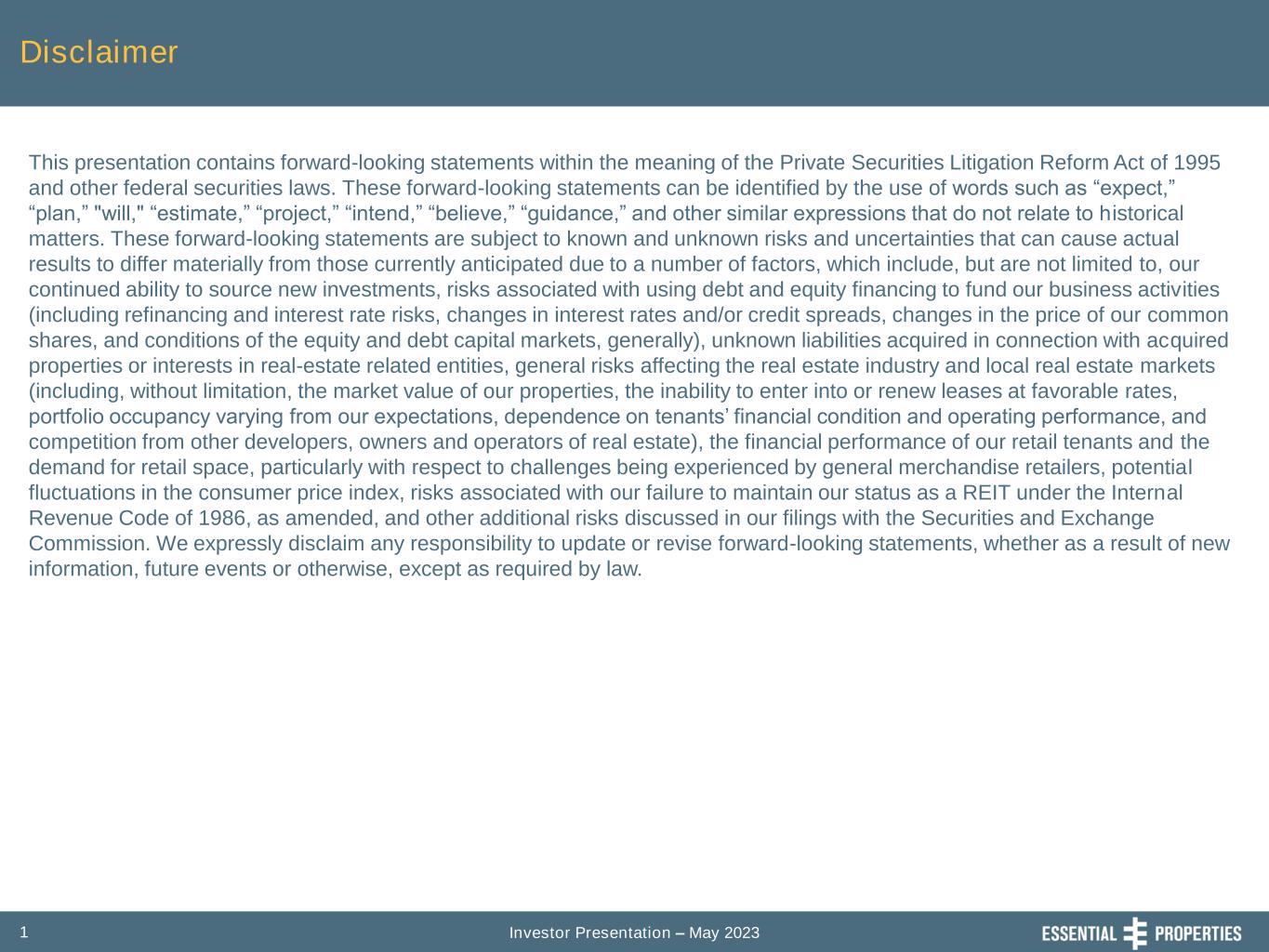 Investor Presentation – May 20231 Disclaimer This presentation contains forward-looking statements within the meaning of the Private Securities Litigation Reform Act of 1995 and other federal securities laws. These forward-looking statements can be identified by the use of words such as “expect,” “plan,” "will," “estimate,” “project,” “intend,” “believe,” “guidance,” and other similar expressions that do not relate to historical matters. These forward-looking statements are subject to known and unknown risks and uncertainties that can cause actual results to differ materially from those currently anticipated due to a number of factors, which include, but are not limited to, our continued ability to source new investments, risks associated with using debt and equity financing to fund our business activities (including refinancing and interest rate risks, changes in interest rates and/or credit spreads, changes in the price of our common shares, and conditions of the equity and debt capital markets, generally), unknown liabilities acquired in connection with acquired properties or interests in real-estate related entities, general risks affecting the real estate industry and local real estate markets (including, without limitation, the market value of our properties, the inability to enter into or renew leases at favorable rates, portfolio occupancy varying from our expectations, dependence on tenants’ financial condition and operating performance, and competition from other developers, owners and operators of real estate), the financial performance of our retail tenants and the demand for retail space, particularly with respect to challenges being experienced by general merchandise retailers, potential fluctuations in the consumer price index, risks associated with our failure to maintain our status as a REIT under the Internal Revenue Code of 1986, as amended, and other additional risks discussed in our filings with the Securities and Exchange Commission. We expressly disclaim any responsibility to update or revise forward-looking statements, whether as a result of new information, future events or otherwise, except as required by law.
