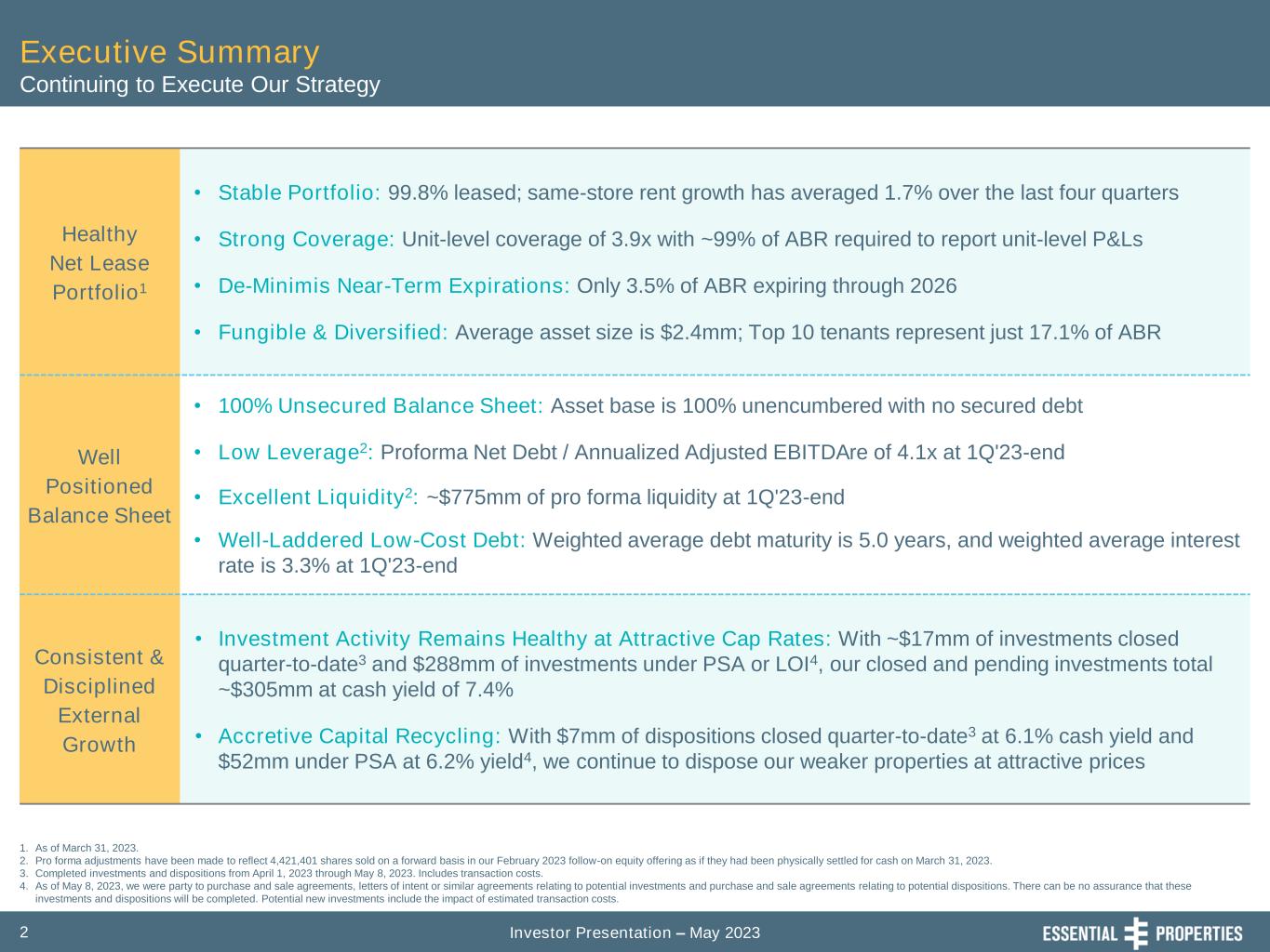 Investor Presentation – May 20232 Healthy Net Lease Portfolio1 • Stable Portfolio: 99.8% leased; same-store rent growth has averaged 1.7% over the last four quarters • Strong Coverage: Unit-level coverage of 3.9x with ~99% of ABR required to report unit-level P&Ls • De-Minimis Near-Term Expirations: Only 3.5% of ABR expiring through 2026 • Fungible & Diversified: Average asset size is $2.4mm; Top 10 tenants represent just 17.1% of ABR Well Positioned Balance Sheet • 100% Unsecured Balance Sheet: Asset base is 100% unencumbered with no secured debt • Low Leverage2: Proforma Net Debt / Annualized Adjusted EBITDAre of 4.1x at 1Q'23-end • Excellent Liquidity2: ~$775mm of pro forma liquidity at 1Q'23-end • Well-Laddered Low-Cost Debt: Weighted average debt maturity is 5.0 years, and weighted average interest rate is 3.3% at 1Q'23-end Consistent & Disciplined External Growth • Investment Activity Remains Healthy at Attractive Cap Rates: With ~$17mm of investments closed quarter-to-date3 and $288mm of investments under PSA or LOI4, our closed and pending investments total ~$305mm at cash yield of 7.4% • Accretive Capital Recycling: With $7mm of dispositions closed quarter-to-date3 at 6.1% cash yield and $52mm under PSA at 6.2% yield4, we continue to dispose our weaker properties at attractive prices 1. As of March 31, 2023. 2. Pro forma adjustments have been made to reflect 4,421,401 shares sold on a forward basis in our February 2023 follow-on equity offering as if they had been physically settled for cash on March 31, 2023. 3. Completed investments and dispositions from April 1, 2023 through May 8, 2023. Includes transaction costs. 4. As of May 8, 2023, we were party to purchase and sale agreements, letters of intent or similar agreements relating to potential investments and purchase and sale agreements relating to potential dispositions. There can be no assurance that these investments and dispositions will be completed. Potential new investments include the impact of estimated transaction costs. Executive Summary Continuing to Execute Our Strategy