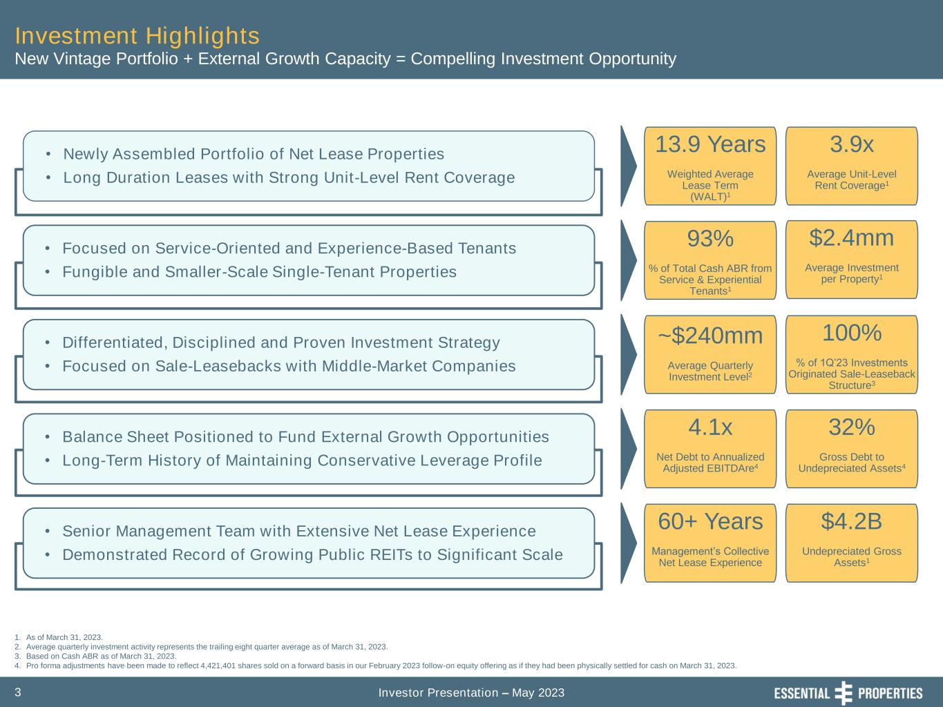 Investor Presentation – May 20233 Investment Highlights • Newly Assembled Portfolio of Net Lease Properties • Long Duration Leases with Strong Unit-Level Rent Coverage • Focused on Service-Oriented and Experience-Based Tenants • Fungible and Smaller-Scale Single-Tenant Properties • Differentiated, Disciplined and Proven Investment Strategy • Focused on Sale-Leasebacks with Middle-Market Companies • Balance Sheet Positioned to Fund External Growth Opportunities • Long-Term History of Maintaining Conservative Leverage Profile • Senior Management Team with Extensive Net Lease Experience • Demonstrated Record of Growing Public REITs to Significant Scale 1. As of March 31, 2023. 2. Average quarterly investment activity represents the trailing eight quarter average as of March 31, 2023. 3. Based on Cash ABR as of March 31, 2023. 4. Pro forma adjustments have been made to reflect 4,421,401 shares sold on a forward basis in our February 2023 follow-on equity offering as if they had been physically settled for cash on March 31, 2023. New Vintage Portfolio + External Growth Capacity = Compelling Investment Opportunity 13.9 Years Weighted Average Lease Term (WALT)1 3.9x Average Unit-Level Rent Coverage1 93% % of Total Cash ABR from Service & Experiential Tenants1 $2.4mm Average Investment per Property1 ~$240mm Average Quarterly Investment Level2 100% % of 1Q’23 Investments Originated Sale-Leaseback Structure3 4.1x Net Debt to Annualized Adjusted EBITDAre4 32% Gross Debt to Undepreciated Assets4 60+ Years Management’s Collective Net Lease Experience $4.2B Undepreciated Gross Assets1