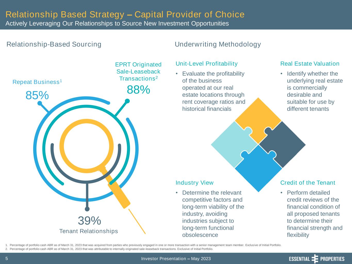 Investor Presentation – May 20234 Differentiated Investment Strategy Based on Decades of Experience Investment Discipline Refined Over Multiple Decades, Extensive Experience Through Various Credit Cycles Service-Oriented & Experience-Based Industries Sale-Leaseback Transactions - Middle-Market Tenants Small-Scale Fungible Net Leased Properties ✓ E-commerce resistant ✓ Profit centers essential to tenant’s operations ✓ Customers must visit to receive service/experience ✓ Longer lease term ✓ Unit-level financial reporting ✓ Contractual rent increases ✓ Increases diversification ✓ Deeper pool of potential buyers ✓ Greater alternative uses Small-scale, fungible net leased properties • Greater re-let opportunities • More liquid for asset recycling Service-oriented and experience- based businesses • Strong performance in current economic environment • Improving operating efficiencies • Increasing store counts Middle-market businesses • Greater opportunity to be valued capital partner • Limited alternative capital sources • Attractive risk- adjusted returns