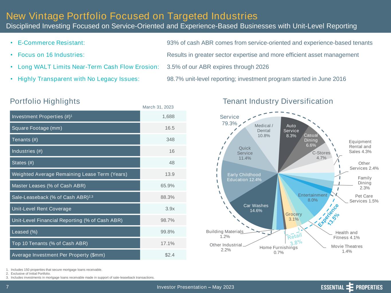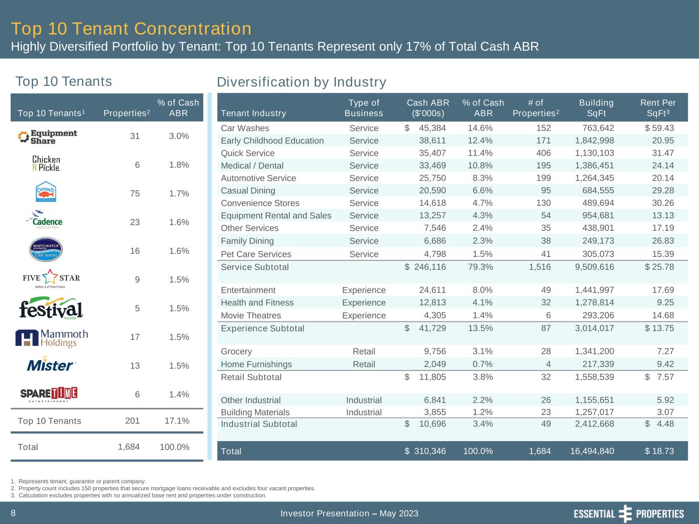 Investor Presentation – May 20237 Car Washes 14.6% Early Childhood Education 12.4% Quick Service 11.4% Medical / Dental 10.8% Auto Service 8.3% Casual Dining 6.6% C-Stores 4.7% Equipment Rental and Sales 4.3% Other Services 2.4% Family Dining 2.3% Pet Care Services 1.5% Entertainment 8.0% Health and Fitness 4.1% Movie Theatres 1.4% Grocery 3.1% Home Furnishings 0.7% Other Industrial 2.2% Building Materials 1.2% Service 79.3% New Vintage Portfolio Focused on Targeted Industries Disciplined Investing Focused on Service-Oriented and Experience-Based Businesses with Unit-Level Reporting 1. Includes 150 properties that secure mortgage loans receivable. 2. Exclusive of Initial Portfolio. 3. Includes investments in mortgage loans receivable made in support of sale-leaseback transactions. Portfolio Highlights March 31, 2023 Tenant Industry Diversification • E-Commerce Resistant: • Focus on 16 Industries: • Long WALT Limits Near-Term Cash Flow Erosion: • Highly Transparent with No Legacy Issues: Investment Properties (#)1 1,688 Square Footage (mm) 16.5 Tenants (#) 348 Industries (#) 16 States (#) 48 Weighted Average Remaining Lease Term (Years) 13.9 Master Leases (% of Cash ABR) 65.9% Sale-Leaseback (% of Cash ABR)2,3 88.3% Unit-Level Rent Coverage 3.9x Unit-Level Financial Reporting (% of Cash ABR) 98.7% Leased (%) 99.8% Top 10 Tenants (% of Cash ABR) 17.1% Average Investment Per Property ($mm) $2.4 93% of cash ABR comes from service-oriented and experience-based tenants Results in greater sector expertise and more efficient asset management 3.5% of our ABR expires through 2026 98.7% unit-level reporting; investment program started in June 2016