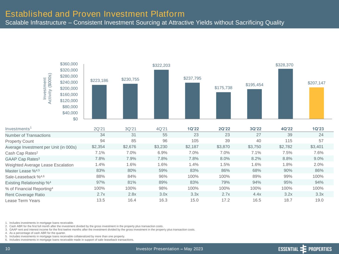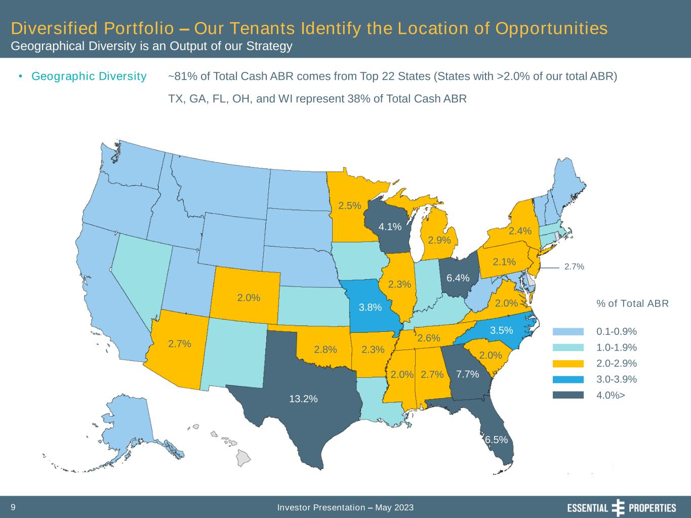 Investor Presentation – May 20239 Diversified Portfolio – Our Tenants Identify the Location of Opportunities Geographical Diversity is an Output of our Strategy • Geographic Diversity ~81% of Total Cash ABR comes from Top 22 States (States with >2.0% of our total ABR) TX, GA, FL, OH, and WI represent 38% of Total Cash ABR % of Total ABR 0.1-0.9% 1.0-1.9% 2.0-2.9% 3.0-3.9% 4.0%>13.2% 7.7% 4.1% 6.5% 6.4% 3.8% 3.5% 2.9% 2.1% 2.4% 2.5% 2.0% 2.7% 2.8% 2.3% 2.0% 2.7% 2.6% 2.0% 2.0% 2.7% 2.3%