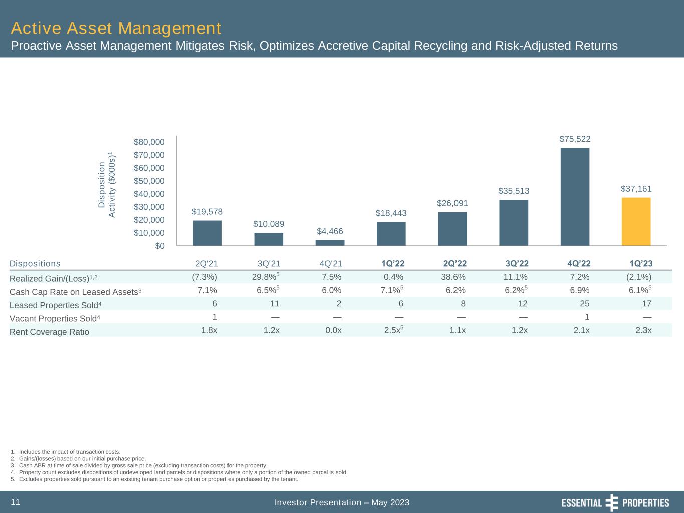 Investor Presentation – May 202310 Established and Proven Investment Platform Scalable Infrastructure – Consistent Investment Sourcing at Attractive Yields without Sacrificing Quality 1. Includes investments in mortgage loans receivable. 2. Cash ABR for the first full month after the investment divided by the gross investment in the property plus transaction costs. 3. GAAP rent and interest income for the first twelve months after the investment divided by the gross investment in the property plus transaction costs. 4. As a percentage of cash ABR for the quarter. 5. Includes investments in mortgage loans receivable collateralized by more than one property. 6. Includes investments in mortgage loans receivable made in support of sale-leaseback transactions. Investments1 2Q'21 3Q'21 4Q'21 1Q’22 2Q’22 3Q’22 4Q’22 1Q’23 Number of Transactions 34 31 55 23 23 27 39 24 Property Count 94 85 96 105 39 40 115 57 Average Investment per Unit (in 000s) $2,354 $2,676 $3,230 $2,187 $3,870 $3,750 $2,782 $3,401 Cash Cap Rates2 7.1% 7.0% 6.9% 7.0% 7.0% 7.1% 7.5% 7.6% GAAP Cap Rates3 7.8% 7.9% 7.8% 7.8% 8.0% 8.2% 8.8% 9.0% Weighted Average Lease Escalation 1.4% 1.6% 1.6% 1.4% 1.5% 1.6% 1.8% 2.0% Master Lease %4,5 83% 80% 59% 83% 86% 68% 90% 86% Sale-Leaseback %4,6 88% 84% 96% 100% 100% 89% 99% 100% Existing Relationship %4 97% 81% 89% 83% 79% 94% 95% 94% % of Financial Reporting4 100% 100% 98% 100% 100% 100% 100% 100% Rent Coverage Ratio 2.7x 2.8x 3.0x 3.3x 2.7x 4.4x 3.2x 3.3x Lease Term Years 13.5 16.4 16.3 15.0 17.2 16.5 18.7 19.0 $223,186 $230,755 $322,203 $237,795 $175,738 $195,454 $328,370 $207,147 $0 $40,000 $80,000 $120,000 $160,000 $200,000 $240,000 $280,000 $320,000 $360,000 In v e s tm e n t A c ti v it y ( $ 0 0 0 s )