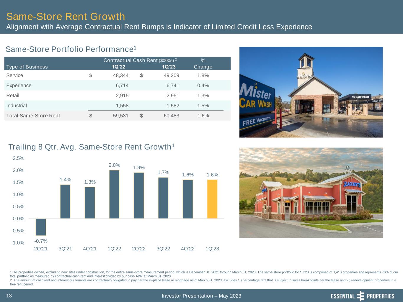 Investor Presentation – May 202312 Leasing Summary Consistent Contractual Rent Escalations Generate Dependable Internal Growth Contractual Fixed 95.5% CPI 2.8% Flat 1.7% 1. Based on cash ABR as of March 31, 2023. 2. Represents the weighted average annual escalation rate of the entire portfolio as if all escalations occur annually. For leases in which rent escalates by the greater of a stated fixed percentage or CPI, we have assumed an escalation equal to the stated fixed percentage in the lease. As any future increase in CPI is unknowable at this time, we have not included an increase in the rent pursuant to these leases in the weighted average annual escalation rate presented. Lease Escalation Frequency Lease Escalation Type Weighted Average Lease Escalation Frequency % of Cash ABR Annual Escalation Rate1,2 Annually 81.1% 1.7% Every 2 years 1.3 1.5 Every 3 years 0.2 0.0 Every 4 years 0.2 1.0 Every 5 years 10.9 1.7 Other escalation frequencies 4.6 1.1 Flat 1.7 0.0 Total / Weighted Average 100.0% 1.6%
