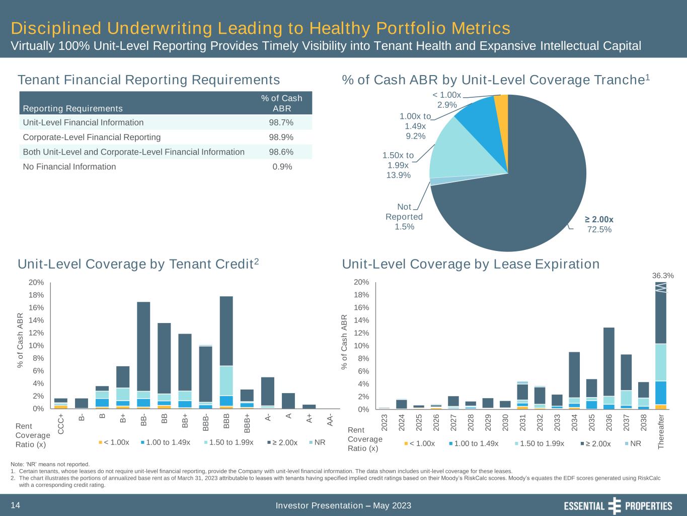 Investor Presentation – May 202313 Same-Store Rent Growth Alignment with Average Contractual Rent Bumps is Indicator of Limited Credit Loss Experience Same-Store Portfolio Performance1 Contractual Cash Rent ($000s) 2 % Type of Business 1Q’22 1Q’23 Change Service $ 48,344 $ 49,209 1.8% Experience 6,714 6,741 0.4% Retail 2,915 2,951 1.3% Industrial 1,558 1,582 1.5% Total Same-Store Rent $ 59,531 $ 60,483 1.6% 1. All properties owned, excluding new sites under construction, for the entire same-store measurement period, which is December 31, 2021 through March 31, 2023. The same-store portfolio for 1Q’23 is comprised of 1,413 properties and represents 78% of our total portfolio as measured by contractual cash rent and interest divided by our cash ABR at March 31, 2023. 2. The amount of cash rent and interest our tenants are contractually obligated to pay per the in-place lease or mortgage as of March 31, 2023; excludes 1.) percentage rent that is subject to sales breakpoints per the lease and 2.) redevelopment properties in a free rent period. -0.7% 1.4% 1.3% 2.0% 1.9% 1.7% 1.6% 1.6% -1.0% -0.5% 0.0% 0.5% 1.0% 1.5% 2.0% 2.5% 2Q'21 3Q'21 4Q'21 1Q'22 2Q'22 3Q'22 4Q'22 1Q'23 Trailing 8 Qtr. Avg. Same-Store Rent Growth1