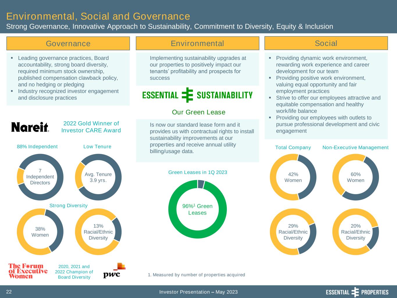 Investor Presentation – May 202322 Governance ▪ Leading governance practices, Board accountability, strong board diversity, required minimum stock ownership, published compensation clawback policy, and no hedging or pledging ▪ Industry recognized investor engagement and disclosure practices Environmental, Social and Governance Strong Governance, Innovative Approach to Sustainability, Commitment to Diversity, Equity & Inclusion Environmental Social Implementing sustainability upgrades at our properties to positively impact our tenants’ profitability and prospects for success ▪ Providing dynamic work environment, rewarding work experience and career development for our team ▪ Providing positive work environment, valuing equal opportunity and fair employment practices ▪ Strive to offer our employees attractive and equitable compensation and healthy work/life balance ▪ Providing our employees with outlets to pursue professional development and civic engagement 29% Racial/Ethnic Diversity 42% Women 60% Women 20% Racial/Ethnic Diversity Total Company Non-Executive Management 96%1 Green Leases 1. Measured by number of properties acquired 2020, 2021 and 2022 Champion of Board Diversity Avg. Tenure 3.9 yrs. 7 Independent Directors 38% Women 13% Racial/Ethnic Diversity Green Leases in 1Q 2023 88% Independent Low Tenure Strong Diversity 2022 Gold Winner of Investor CARE Award Is now our standard lease form and it provides us with contractual rights to install sustainability improvements at our properties and receive annual utility billing/usage data. Our Green Lease