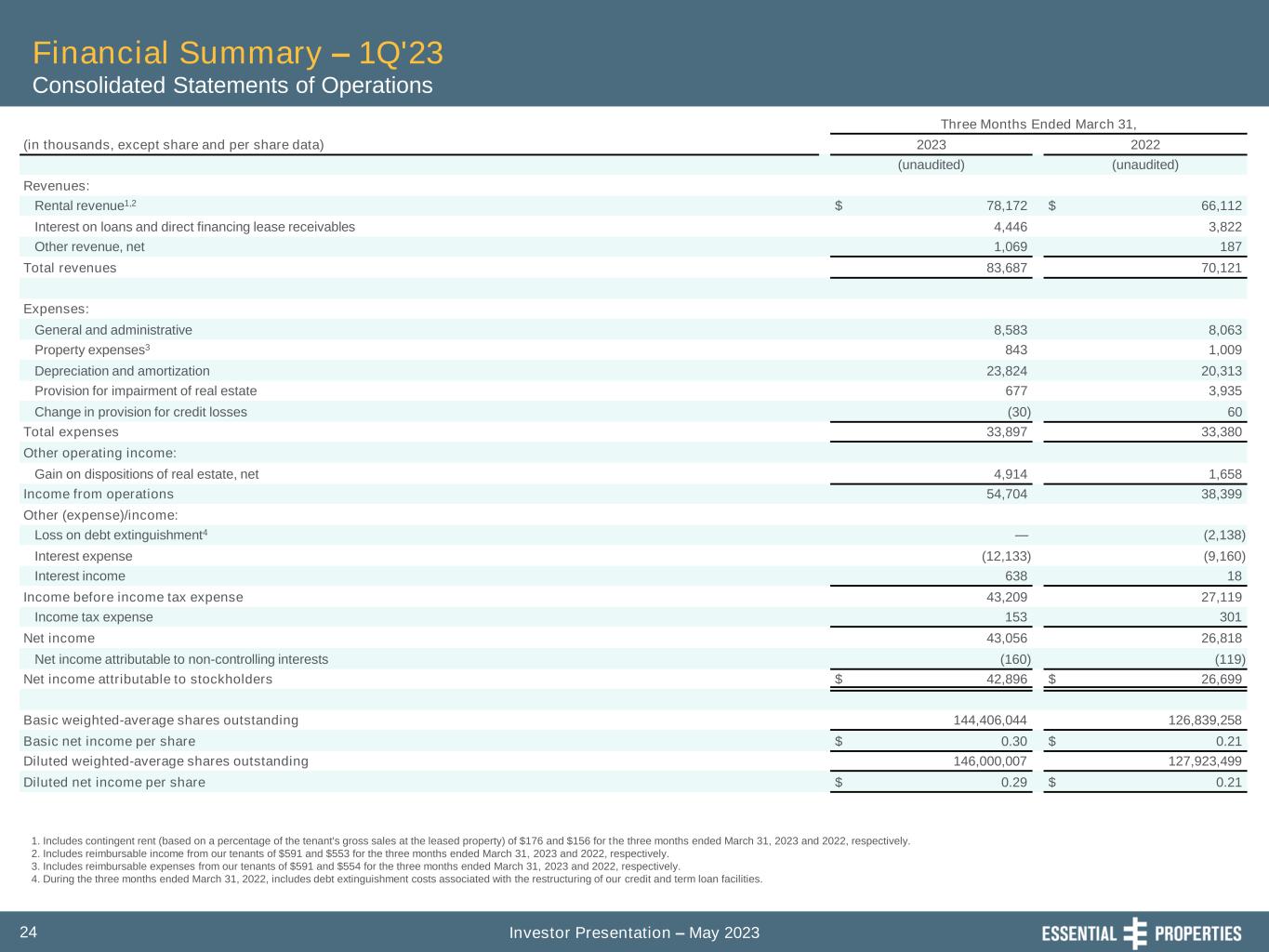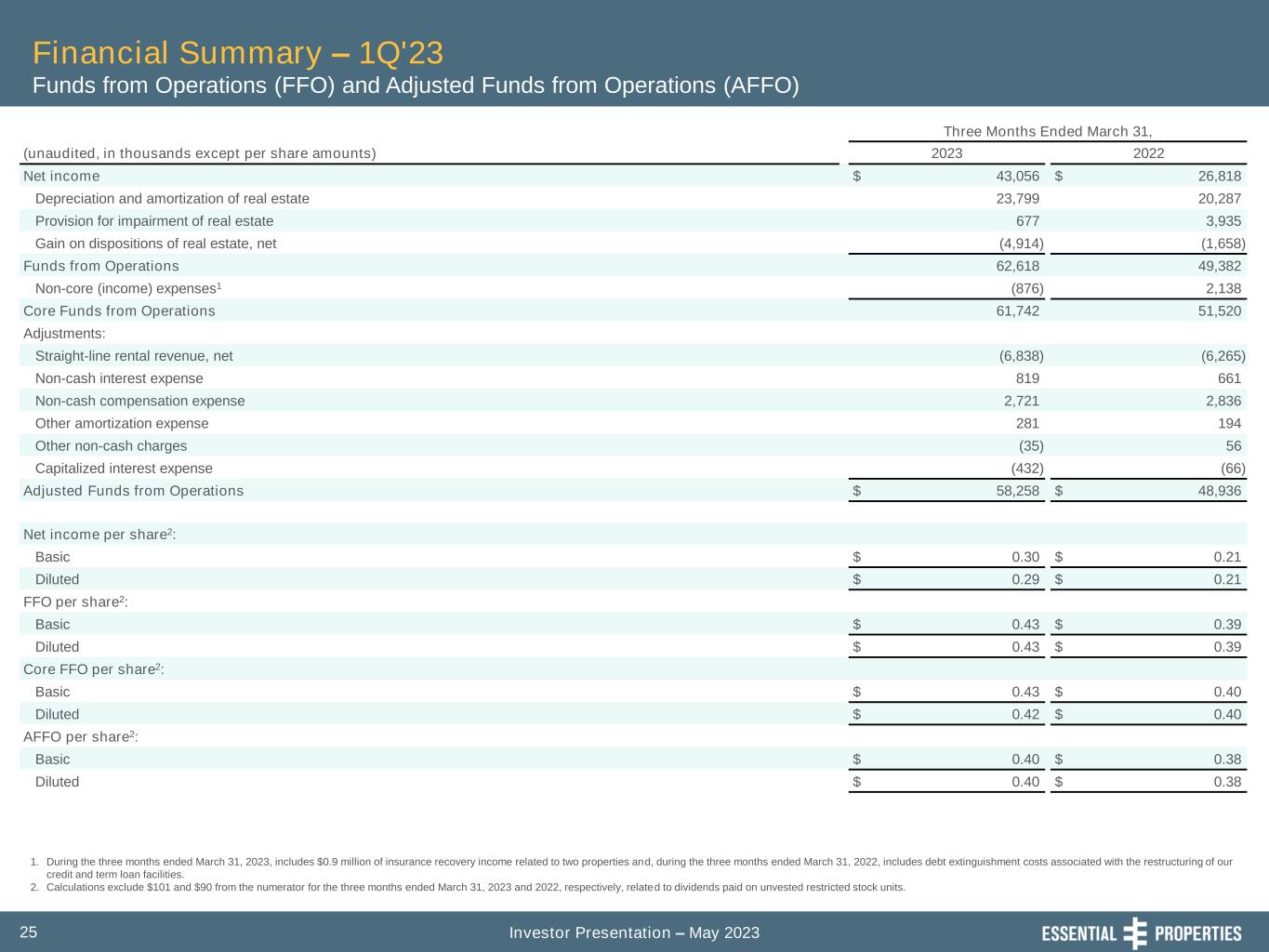 Investor Presentation – May 202324 Financial Summary – 1Q'23 Consolidated Statements of Operations 1. Includes contingent rent (based on a percentage of the tenant's gross sales at the leased property) of $176 and $156 for the three months ended March 31, 2023 and 2022, respectively. 2. Includes reimbursable income from our tenants of $591 and $553 for the three months ended March 31, 2023 and 2022, respectively. 3. Includes reimbursable expenses from our tenants of $591 and $554 for the three months ended March 31, 2023 and 2022, respectively. 4. During the three months ended March 31, 2022, includes debt extinguishment costs associated with the restructuring of our credit and term loan facilities. Three Months Ended March 31, (in thousands, except share and per share data) 2023 2022 (unaudited) (unaudited) Revenues: Rental revenue1,2 $ 78,172 $ 66,112 Interest on loans and direct financing lease receivables 4,446 3,822 Other revenue, net 1,069 187 Total revenues 83,687 70,121 Expenses: General and administrative 8,583 8,063 Property expenses3 843 1,009 Depreciation and amortization 23,824 20,313 Provision for impairment of real estate 677 3,935 Change in provision for credit losses (30) 60 Total expenses 33,897 33,380 Other operating income: Gain on dispositions of real estate, net 4,914 1,658 Income from operations 54,704 38,399 Other (expense)/income: Loss on debt extinguishment4 — (2,138) Interest expense (12,133) (9,160) Interest income 638 18 Income before income tax expense 43,209 27,119 Income tax expense 153 301 Net income 43,056 26,818 Net income attributable to non-controlling interests (160) (119) Net income attributable to stockholders $ 42,896 $ 26,699 Basic weighted-average shares outstanding 144,406,044 126,839,258 Basic net income per share $ 0.30 $ 0.21 Diluted weighted-average shares outstanding 146,000,007 127,923,499 Diluted net income per share $ 0.29 $ 0.21