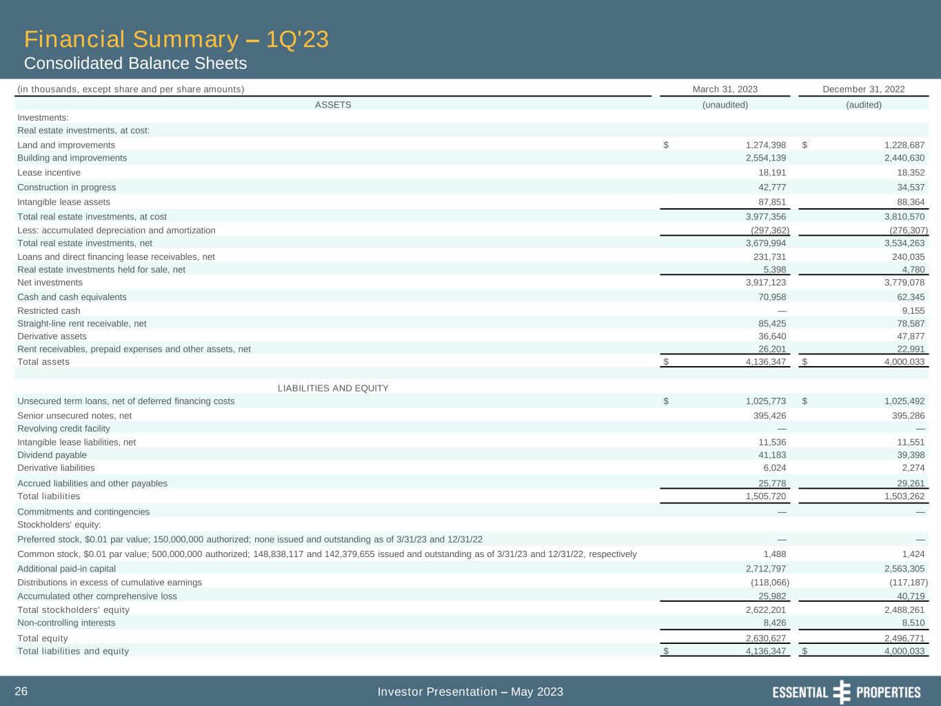 Investor Presentation – May 202325 Financial Summary – 1Q'23 Funds from Operations (FFO) and Adjusted Funds from Operations (AFFO) 1. During the three months ended March 31, 2023, includes $0.9 million of insurance recovery income related to two properties and, during the three months ended March 31, 2022, includes debt extinguishment costs associated with the restructuring of our credit and term loan facilities. 2. Calculations exclude $101 and $90 from the numerator for the three months ended March 31, 2023 and 2022, respectively, related to dividends paid on unvested restricted stock units. Three Months Ended March 31, (unaudited, in thousands except per share amounts) 2023 2022 Net income $ 43,056 $ 26,818 Depreciation and amortization of real estate 23,799 20,287 Provision for impairment of real estate 677 3,935 Gain on dispositions of real estate, net (4,914) (1,658) Funds from Operations 62,618 49,382 Non-core (income) expenses1 (876) 2,138 Core Funds from Operations 61,742 51,520 Adjustments: Straight-line rental revenue, net (6,838) (6,265) Non-cash interest expense 819 661 Non-cash compensation expense 2,721 2,836 Other amortization expense 281 194 Other non-cash charges (35) 56 Capitalized interest expense (432) (66) Adjusted Funds from Operations $ 58,258 $ 48,936 Net income per share2: Basic $ 0.30 $ 0.21 Diluted $ 0.29 $ 0.21 FFO per share2: Basic $ 0.43 $ 0.39 Diluted $ 0.43 $ 0.39 Core FFO per share2: Basic $ 0.43 $ 0.40 Diluted $ 0.42 $ 0.40 AFFO per share2: Basic $ 0.40 $ 0.38 Diluted $ 0.40 $ 0.38
